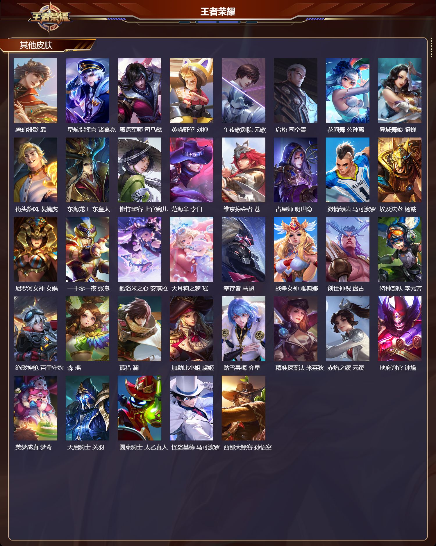 【54,其他皮肤】沧流箭,伽罗,伊势巫女,大乔,金属狂潮,高渐离,前尘,金蝉,战争骑士,夏侯惇,圣殿之光,刘邦,芝加哥教父,黄忠,潮流仙人,老夫子,三太子,哪吒,龙域领主,铠,生化警戒,钟无艳,花见巫女,伽罗,第七人偶,干将莫邪,灼热之刃,李信,海之征途,孙策,木偶奇遇记,鲁班七号,帝国元帅,项羽,碧珀绯影,暃,星航指挥官,诸葛亮,魇语军师,司马懿,英喵野望,刘禅,午夜歌剧院,元歌,启蛰,司空震,花间舞,公孙离,异域舞娘,貂蝉,街头旋风,裴擒虎,东海龙王,东皇太一,修竹墨客,上官婉儿,范海辛,李白,维京掠夺者,苍,占星师,明世隐,激情绿茵,马可波罗,埃及法老,杨戬,尼罗河女神,女娲,一千零一夜,张良,酷洛米之心,安琪拉,大耳狗之梦,瑶,幸存者,马超,战争女神,雅典娜,创世神祝,盘古,特种部队,李元芳,绝影神枪,百里守约,森,瑶,孤猎,澜,加勒比小姐,虞姬,踏雪寻梅,弈星,精准探案法,米莱狄,赤焰之缨,云缨,地府判官,钟馗,美梦成真,梦奇,天启骑士,关羽,圆桌骑士,太乙真人,怪盗基德,马可波罗,西部大镖客,孙悟空,