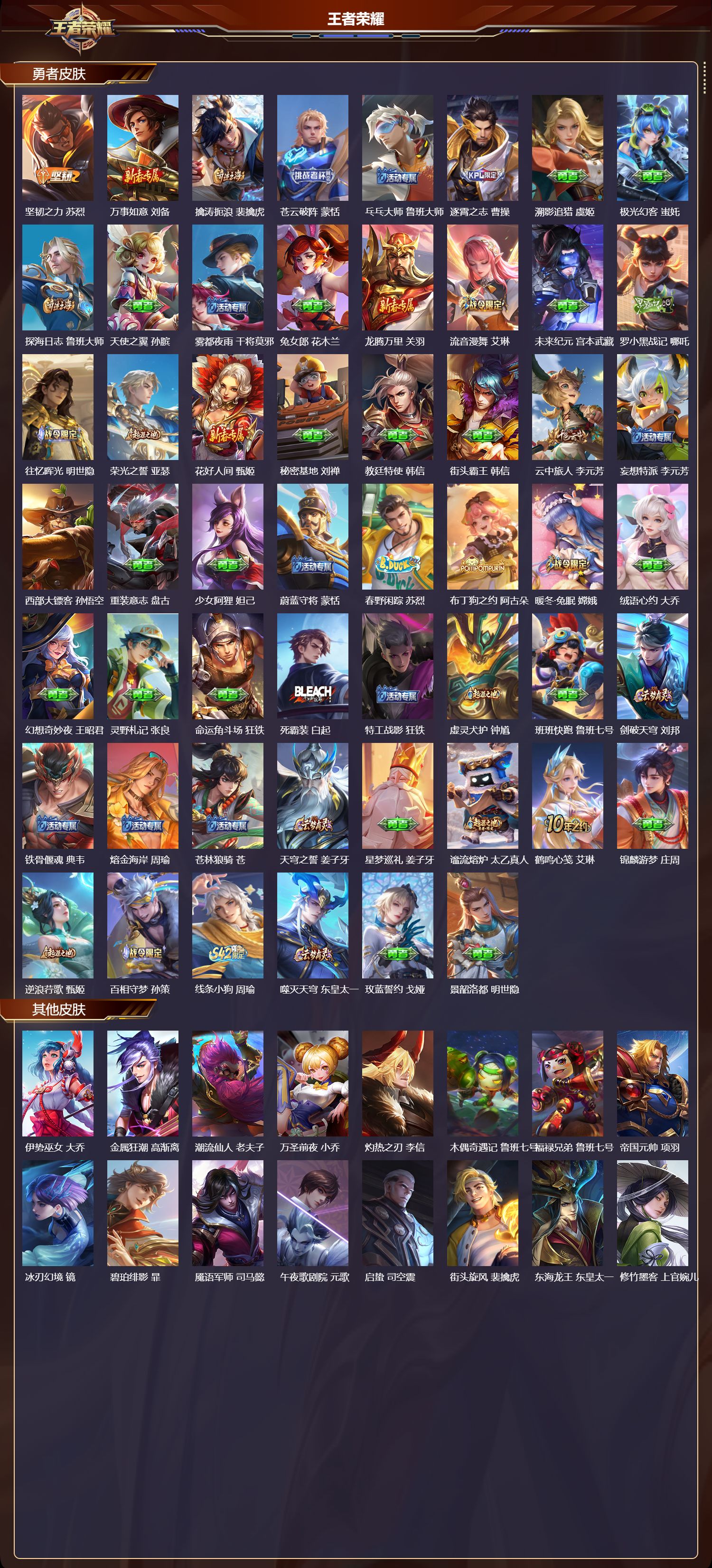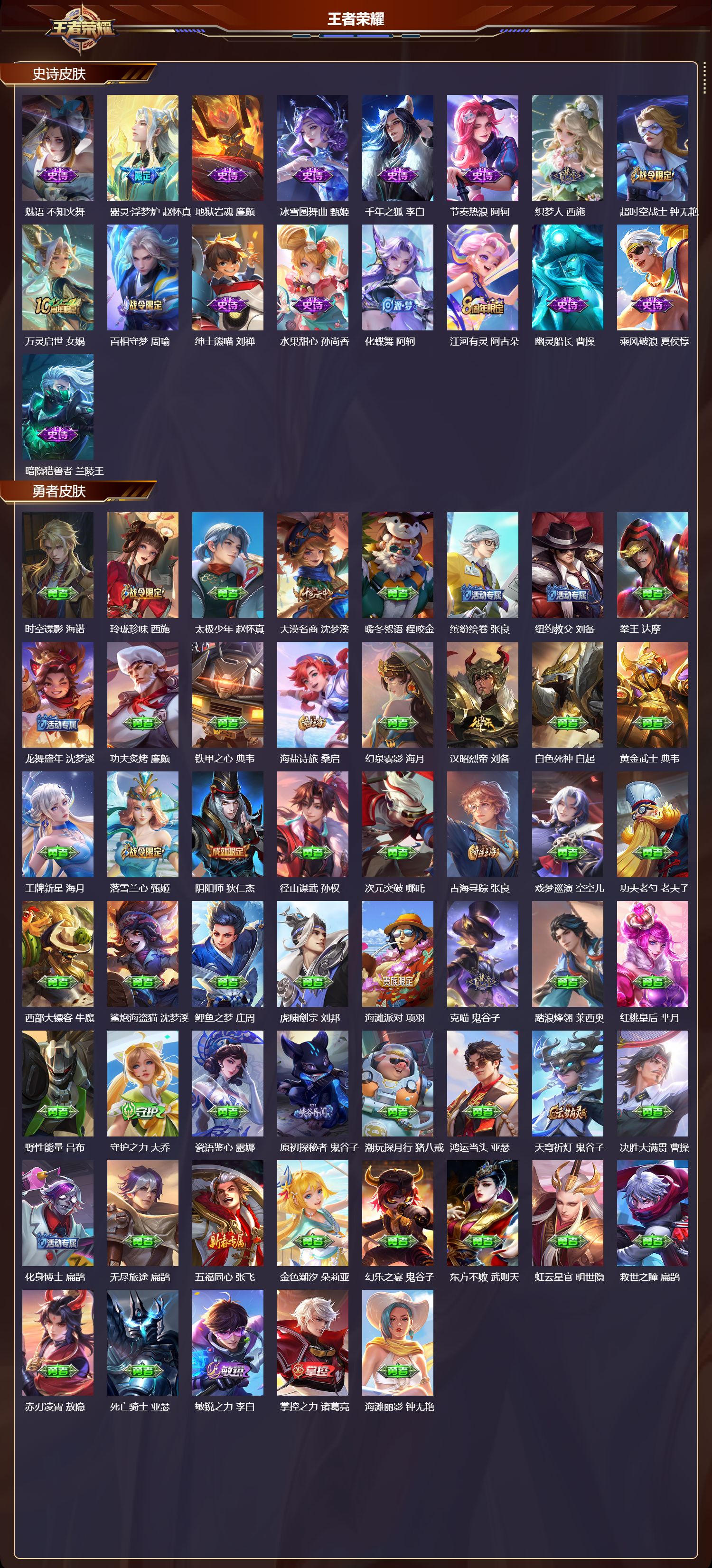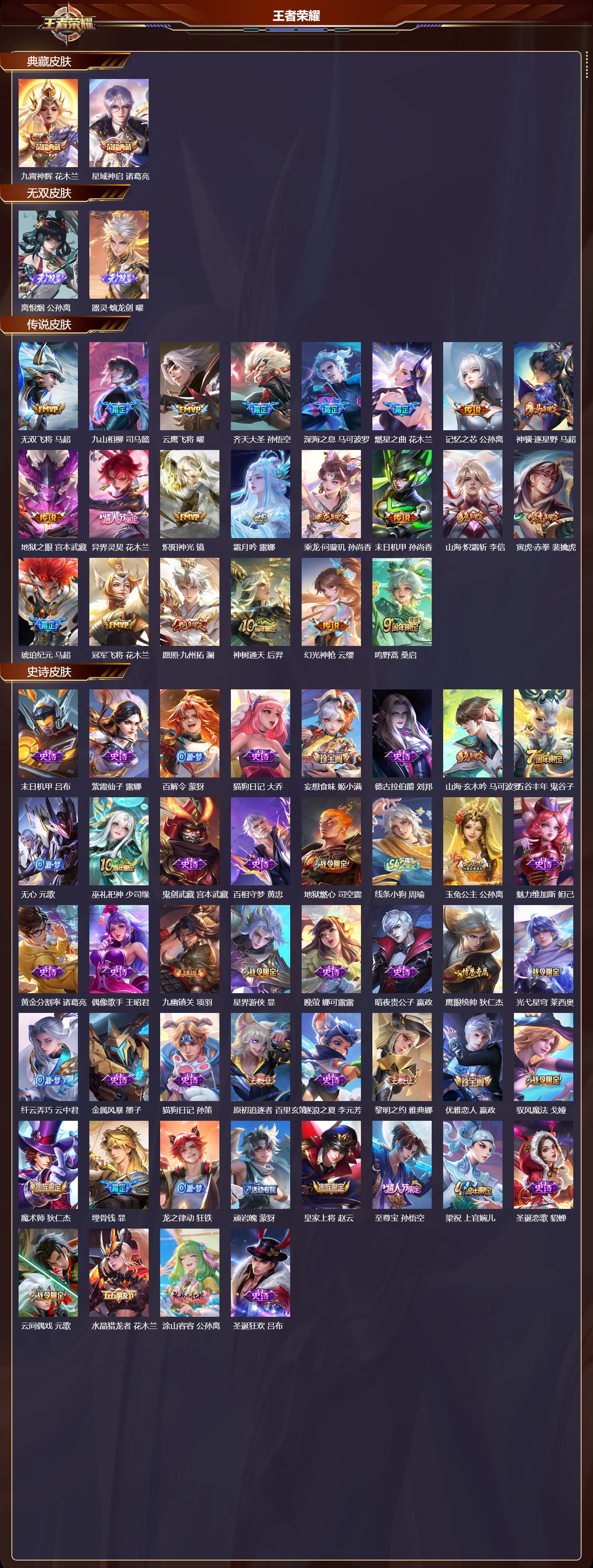 【61,史诗皮肤】末日机甲,吕布,紫霞仙子,露娜,百解令,蒙犽,猫狗日记,大乔,妄想食味,姬小满,德古拉伯爵,刘邦,山海·玄木吟,马可波罗,五谷丰年,鬼谷子,无心,元歌,巫礼祀神,少司缘,鬼剑武藏,宫本武藏,百相守梦,黄忠,地狱燃心,司空震,线条小狗,周瑜,玉兔公主,公孙离,魅力维加斯,妲己,黄金分割率,诸葛亮,偶像歌手,王昭君,九幽镇关,项羽,星界游侠,暃,晚萤,娜可露露,暗夜贵公子,嬴政,鹰眼统帅,狄仁杰,光弋星穹,莱西奥,纤云弄巧,云中君,金属风暴,墨子,猫狗日记,孙策,原初追逐者,百里玄策,逐浪之夏,李元芳,黎明之约,雅典娜,优雅恋人,嬴政,驭风魔法,戈娅,魔术师,狄仁杰,埋骨钱,暃,龙之律动,狂铁,顽岩魄,蒙犽,皇家上将,赵云,至尊宝,孙悟空,梁祝,上官婉儿,圣诞恋歌,貂蝉,云间偶戏,元歌,水晶猎龙者,花木兰,涂山容容,公孙离,圣诞狂欢,吕布,魅语,不知火舞,器灵·浮梦炉,赵怀真,地狱岩魂,廉颇,冰雪圆舞曲,甄姬,千年之狐,李白,节奏热浪,阿轲,织梦人,西施,超时空战士,钟无艳,万灵启世,女娲,百相守梦,周瑜,绅士熊喵,刘禅,水果甜心,孙尚香,化蝶舞,阿轲,江河有灵,阿古朵,幽灵船长,曹操,乘风破浪,夏侯惇,暗隐猎兽者,兰陵王,