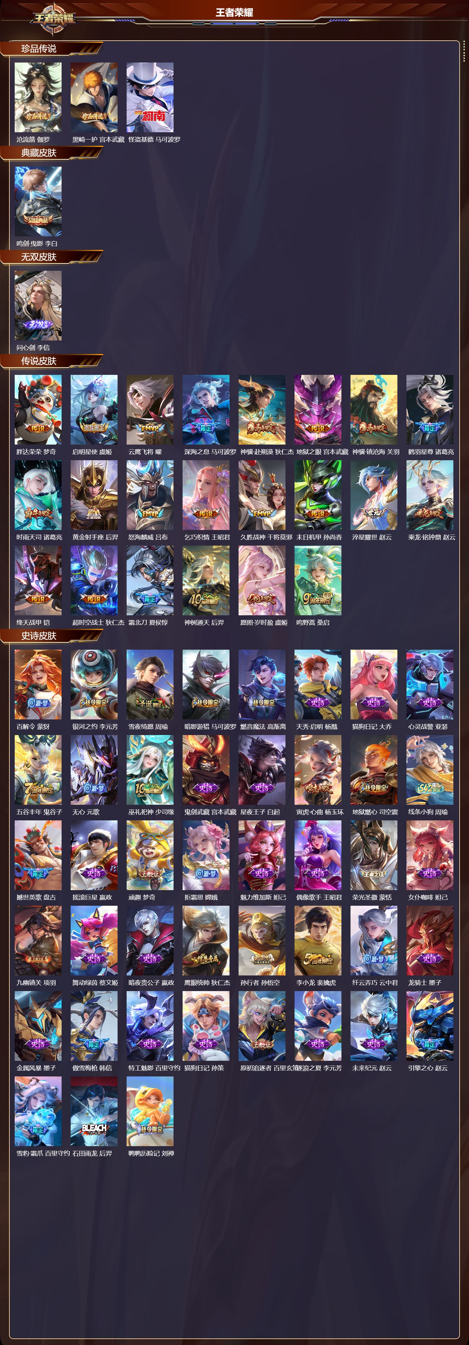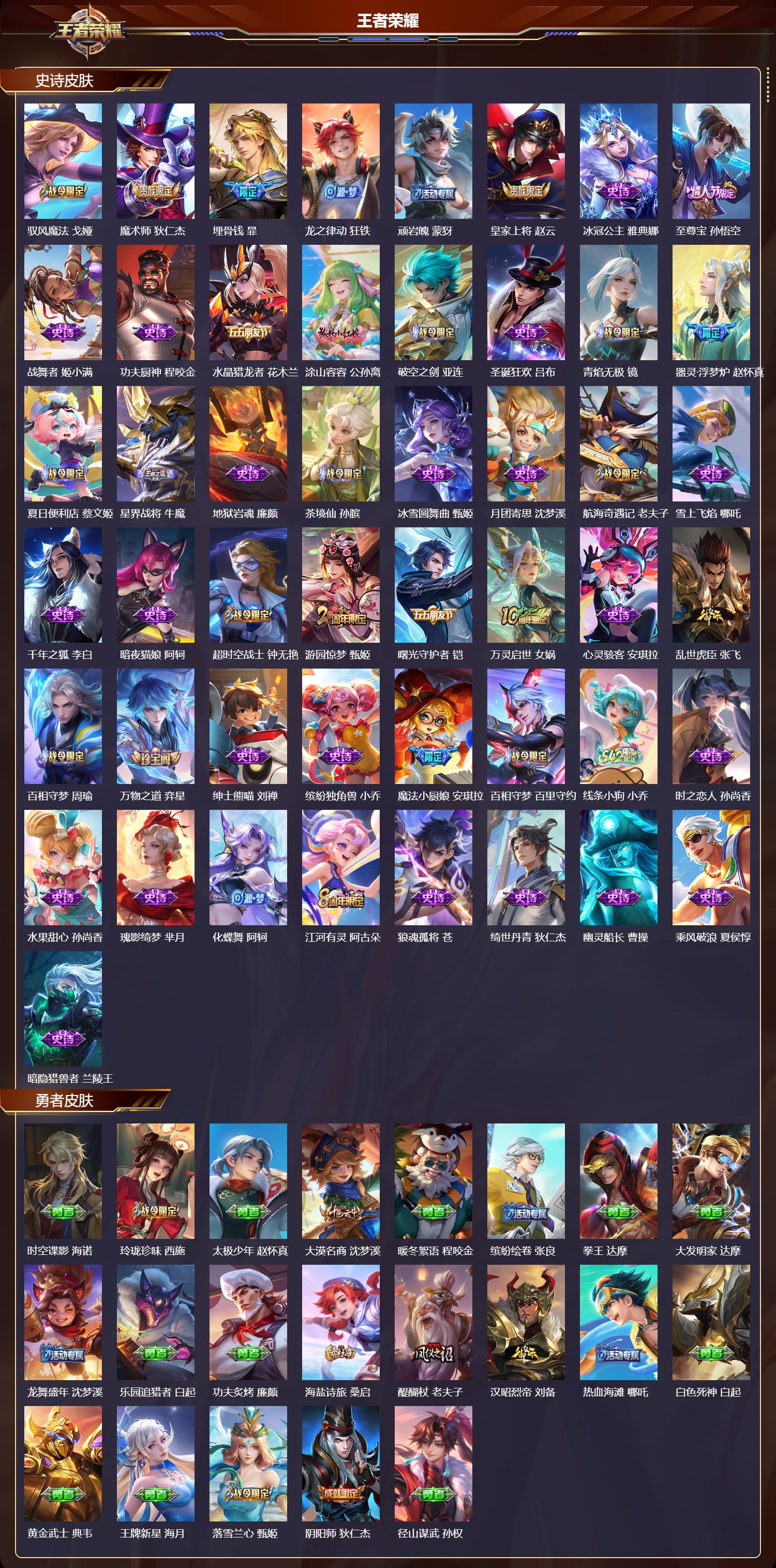 【92,史诗皮肤】百解令,蒙犽,银河之约,李元芳,雪夜绮愿,周瑜,暗影游猎,马可波罗,燃音魔法,高渐离,天秀·启明,杨戬,猫狗日记,大乔,心灵战警,亚瑟,五谷丰年,鬼谷子,无心,元歌,巫礼祀神,少司缘,鬼剑武藏,宫本武藏,星夜王子,白起,寅虎·心曲,杨玉环,地狱燃心,司空震,线条小狗,周瑜,撼世英歌,盘古,摇滚巨星,嬴政,顽趣,梦奇,拒霜思,嫦娥,魅力维加斯,妲己,偶像歌手,王昭君,荣光圣徽,蒙恬,女仆咖啡,妲己,九幽镇关,项羽,舞动绿茵,蔡文姬,暗夜贵公子,嬴政,鹰眼统帅,狄仁杰,孙行者,孙悟空,李小龙,裴擒虎,纤云弄巧,云中君,龙骑士,墨子,金属风暴,墨子,傲雪梅枪,韩信,特工魅影,百里守约,猫狗日记,孙策,原初追逐者,百里玄策,逐浪之夏,李元芳,未来纪元,赵云,引擎之心,赵云,雪豹·霜爪,百里守约,石田雨龙,后羿,鸭鸭历险记,刘禅,驭风魔法,戈娅,魔术师,狄仁杰,埋骨钱,暃,龙之律动,狂铁,顽岩魄,蒙犽,皇家上将,赵云,冰冠公主,雅典娜,至尊宝,孙悟空,战舞者,姬小满,功夫厨神,程咬金,水晶猎龙者,花木兰,涂山容容,公孙离,破空之剑,亚连,圣诞狂欢,吕布,青焰无极,镜,器灵·浮梦炉,赵怀真,夏日便利店,蔡文姬,星界战将,牛魔,地狱岩魂,廉颇,茶境仙,孙膑,冰雪圆舞曲,甄姬,月团寄思,沈梦溪,航海奇遇记,老夫子,雪上飞焰,哪吒,千年之狐,李白,暗夜猫娘,阿轲,超时空战士,钟无艳,游园惊梦,甄姬,曙光守护者,铠,万灵启世,女娲,心灵骇客,安琪拉,乱世虎臣,张飞,百相守梦,周瑜,万物之道,弈星,绅士熊喵,刘禅,缤纷独角兽,小乔,魔法小厨娘,安琪拉,百相守梦,百里守约,线条小狗,小乔,时之恋人,孙尚香,水果甜心,孙尚香,瑰影绮梦,芈月,化蝶舞,阿轲,江河有灵,阿古朵,狼魂孤将,苍,绮世丹青,狄仁杰,幽灵船长,曹操,乘风破浪,夏侯惇,暗隐猎兽者,兰陵王,