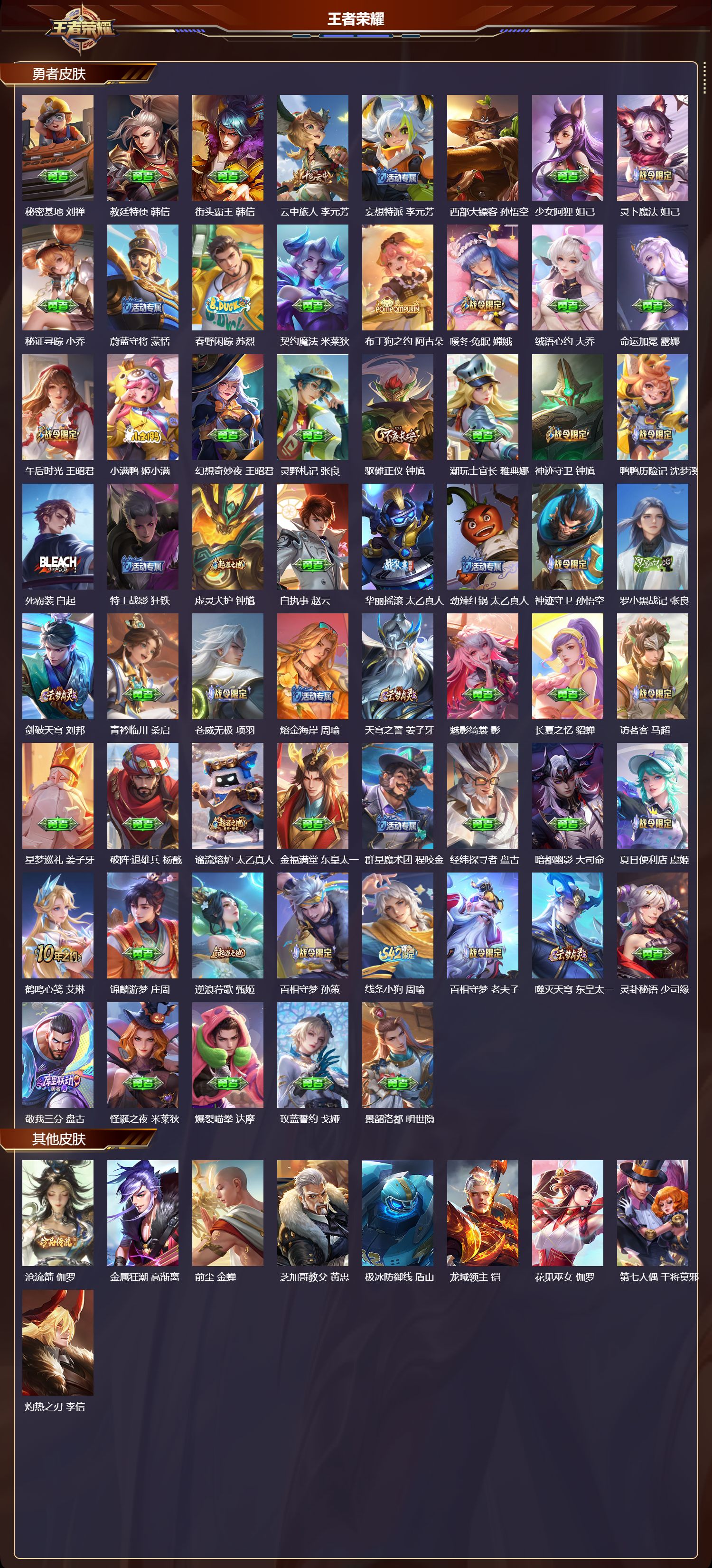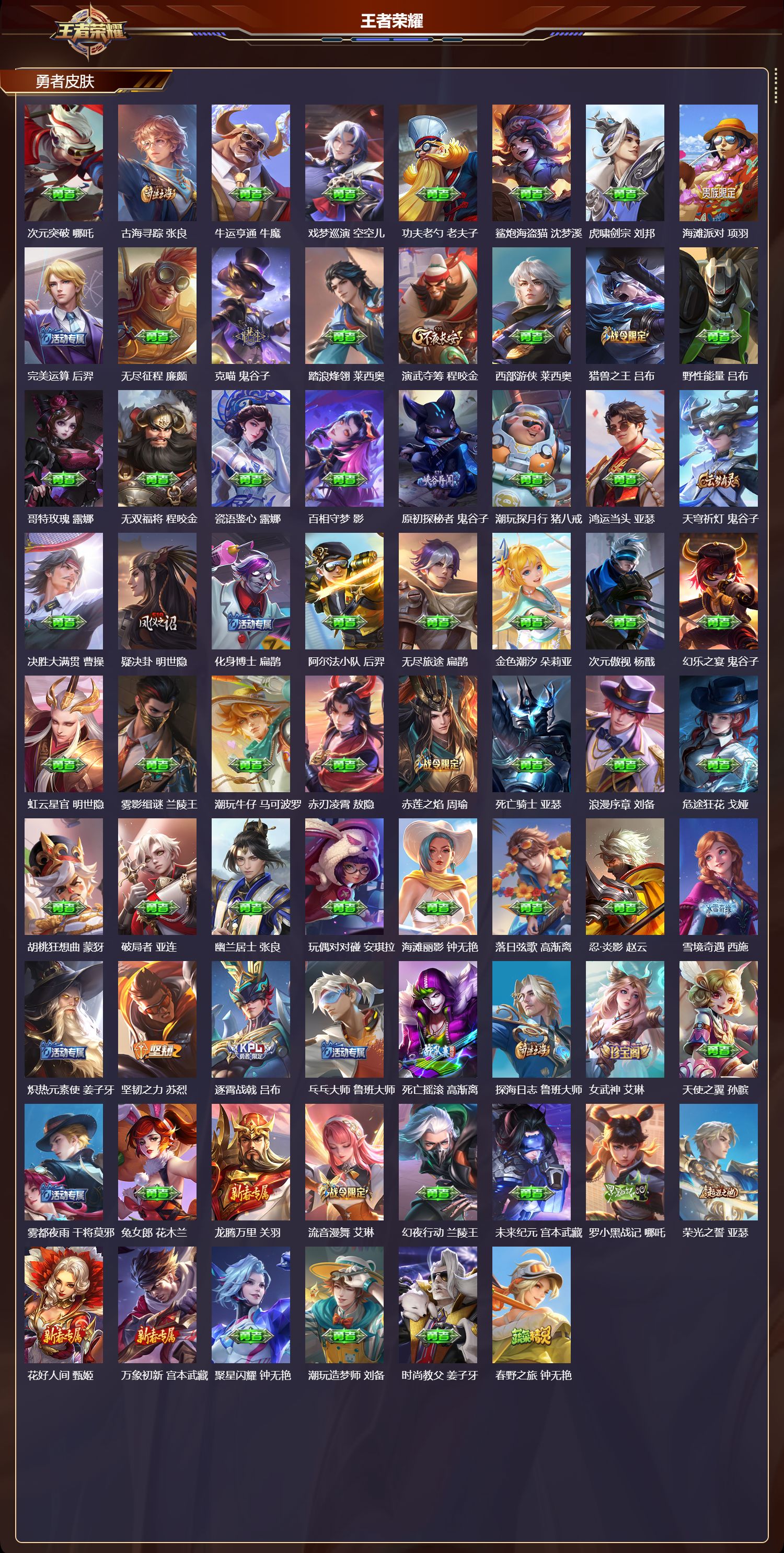 【152,勇者皮肤】时空谍影,海诺,玲珑珍味,西施,太极少年,赵怀真,大漠名商,沈梦溪,暖冬絮语,程咬金,缤纷绘卷,张良,拳王,达摩,大发明家,达摩,龙舞盛年,沈梦溪,乐园追猎者,白起,功夫炙烤,廉颇,海盐诗旅,桑启,醍醐杖,老夫子,汉昭烈帝,刘备,热血海滩,哪吒,白色死神,白起,黄金武士,典韦,王牌新星,海月,落雪兰心,甄姬,阴阳师,狄仁杰,径山谋武,孙权,次元突破,哪吒,古海寻踪,张良,牛运亨通,牛魔,戏梦巡演,空空儿,功夫老勺,老夫子,鲨炮海盗猫,沈梦溪,虎啸剑宗,刘邦,海滩派对,项羽,完美运算,后羿,无尽征程,廉颇,克喵,鬼谷子,踏浪烽翎,莱西奥,演武夺筹,程咬金,西部游侠,莱西奥,猎兽之王,吕布,野性能量,吕布,哥特玫瑰,露娜,无双福将,程咬金,瓷语鉴心,露娜,百相守梦,影,原初探秘者,鬼谷子,潮玩探月行,猪八戒,鸿运当头,亚瑟,天穹祈灯,鬼谷子,决胜大满贯,曹操,疑决卦,明世隐,化身博士,扁鹊,阿尔法小队,后羿,无尽旅途,扁鹊,金色潮汐,朵莉亚,次元傲视,杨戬,幻乐之宴,鬼谷子,虹云星官,明世隐,雾影缉谜,兰陵王,潮玩牛仔,马可波罗,赤刃凌霄,敖隐,赤莲之焰,周瑜,死亡骑士,亚瑟,浪漫序章,刘备,危途狂花,戈娅,胡桃狂想曲,蒙犽,破局者,亚连,幽兰居士,张良,玩偶对对碰,安琪拉,海滩丽影,钟无艳,落日弦歌,高渐离,忍·炎影,赵云,雪境奇遇,西施,炽热元素使,姜子牙,坚韧之力,苏烈,逐霄战戟,吕布,乓乓大师,鲁班大师,死亡摇滚,高渐离,探海日志,鲁班大师,女武神,艾琳,天使之翼,孙膑,雾都夜雨,干将莫邪,兔女郎,花木兰,龙腾万里,关羽,流音漫舞,艾琳,幻夜行动,兰陵王,未来纪元,宫本武藏,罗小黑战记,哪吒,荣光之誓,亚瑟,花好人间,甄姬,万象初新,宫本武藏,聚星闪耀,钟无艳,潮玩造梦师,刘备,时尚教父,姜子牙,春野之旅,钟无艳,秘密基地,刘禅,教廷特使,韩信,街头霸王,韩信,云中旅人,李元芳,妄想特派,李元芳,西部大镖客,孙悟空,少女阿狸,妲己,灵卜魔法,妲己,秘证寻踪,小乔,蔚蓝守将,蒙恬,春野闲踪,苏烈,契约魔法,米莱狄,布丁狗之约,阿古朵,暖冬·兔眠,嫦娥,绒语心约,大乔,命运加冕,露娜,午后时光,王昭君,小满鸭,姬小满,幻想奇妙夜,王昭君,灵野札记,张良,驱傩正仪,钟馗,潮玩士官长,雅典娜,神迹守卫,钟馗,鸭鸭历险记,沈梦溪,死霸装,白起,特工战影,狂铁,虚灵犬护,钟馗,白执事,赵云,华丽摇滚,太乙真人,劲辣红锅,太乙真人,神迹守卫,孙悟空,罗小黑战记,张良,剑破天穹,刘邦,青衿临川,桑启,苍威无极,项羽,熔金海岸,周瑜,天穹之誓,姜子牙,魅影绮裳,影,长夏之忆,貂蝉,访茗客,马超,星梦巡礼,姜子牙,破阵·退雄兵,杨戬,谧流熔炉,太乙真人,金福满堂,东皇太一,群星魔术团,程咬金,经纬探寻者,盘古,暗都幽影,大司命,夏日便利店,虞姬,鹤鸣心笺,艾琳,锦麟游梦,庄周,逆浪荇歌,甄姬,百相守梦,孙策,线条小狗,周瑜,百相守梦,老夫子,噬灭天穹,东皇太一,灵卦秘语,少司缘,敬我三分,盘古,怪诞之夜,米莱狄,爆裂喵拳,达摩,玫蓝誓约,戈娅,景韶洛都,明世隐,