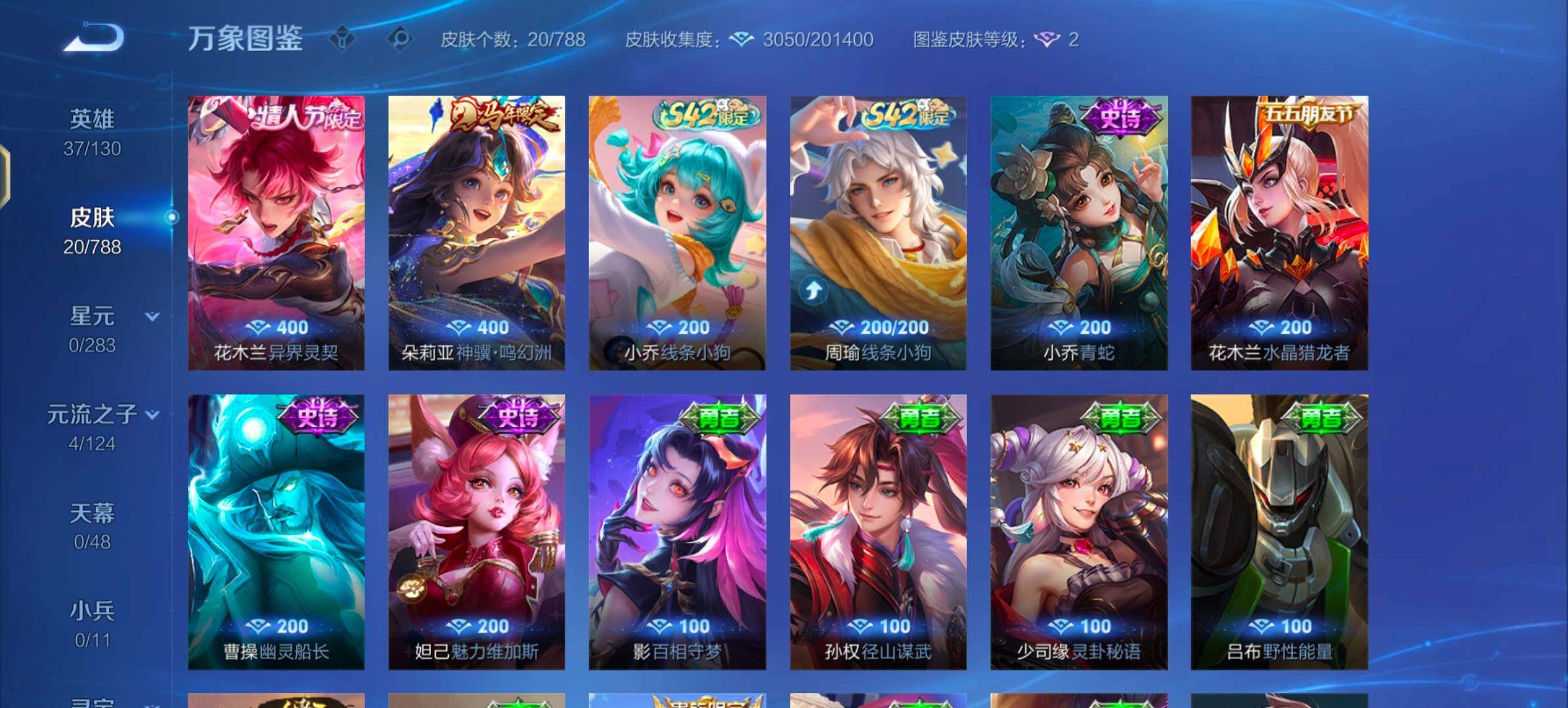 【史诗皮肤】:周瑜线条小狗,小乔线条小狗,小乔青蛇,花木兰水晶猎龙者,曹操幽灵船长,妲己魅力维加斯