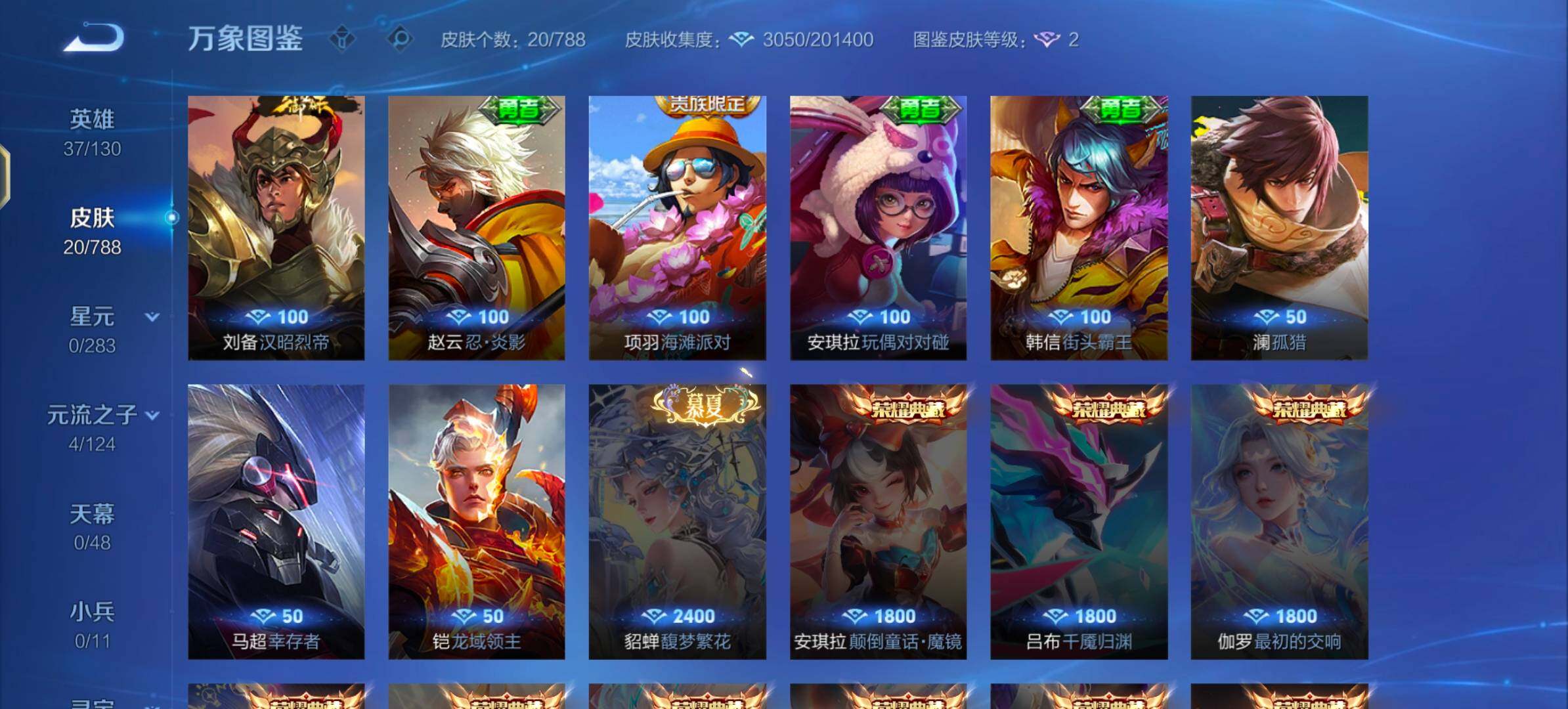 【其他皮肤】:影百相守梦,孙权径山谋武,少司缘灵卦秘语,吕布野性能量,刘备汉昭烈帝,安琪拉玩偶对对碰,赵云忍炎影,韩信街头霸王,项羽海滩派对,澜孤猎,马超幸存者,铠龙域领主