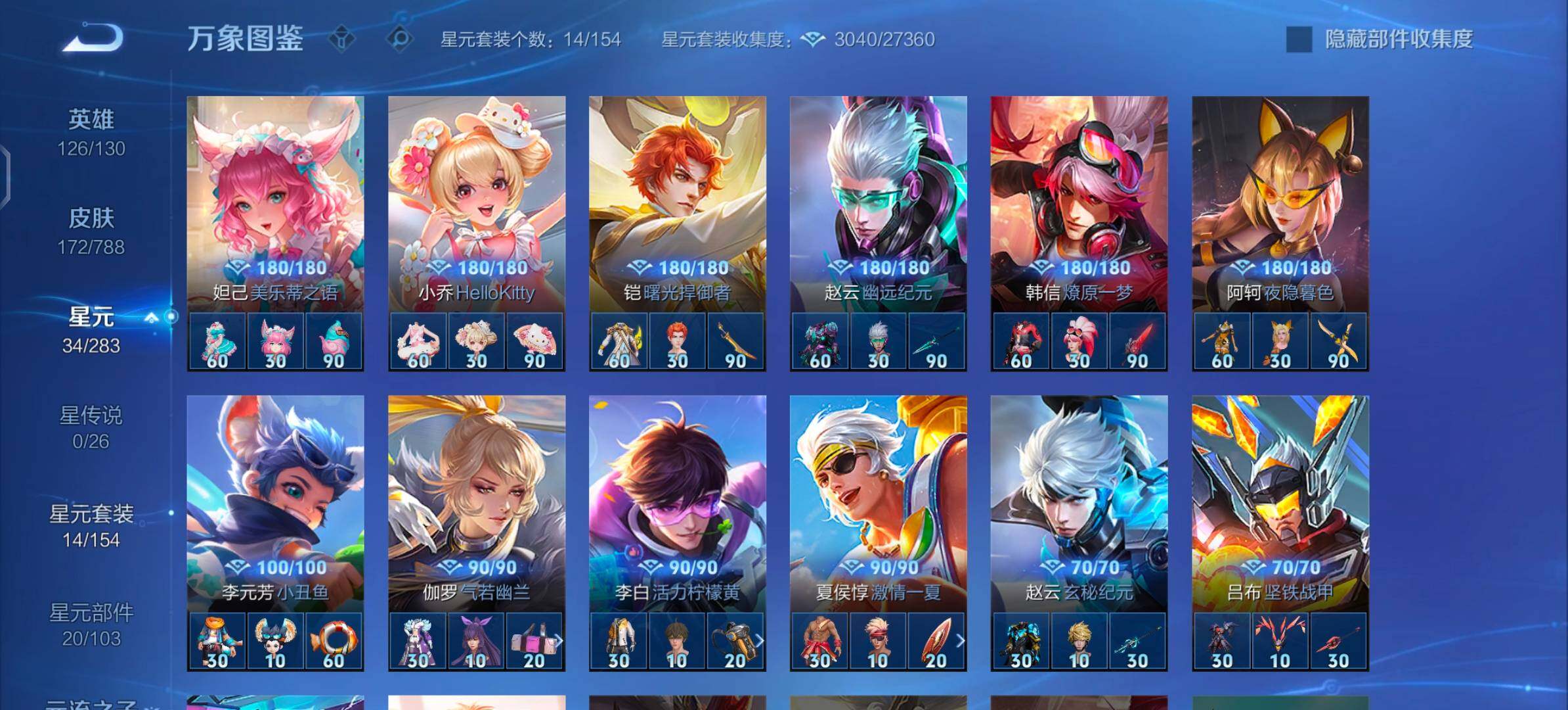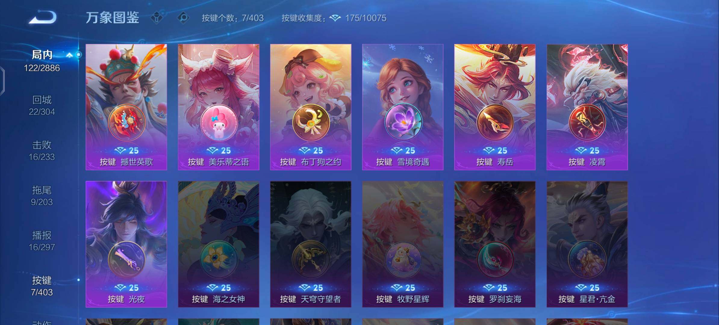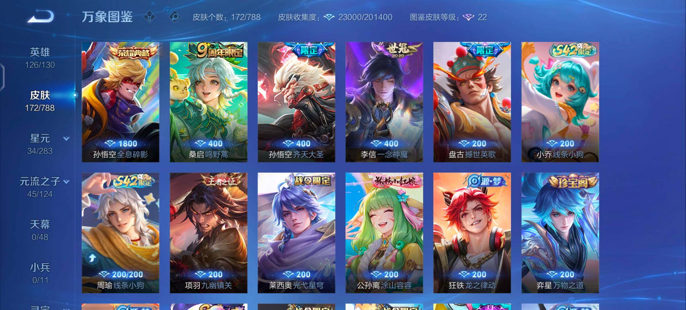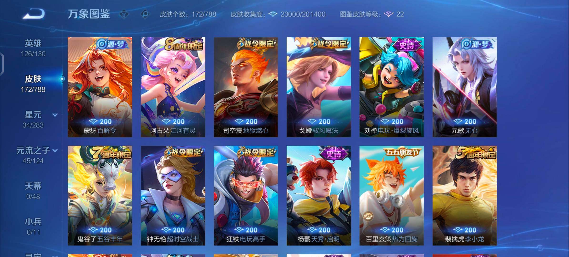 【其他皮肤】:影百相守梦,虞姬溯影追猎,蚩奼极光幻客,艾琳鹤鸣心笺,孙权径山谋武,明世隐往忆晖光,亚瑟荣光之誓,鬼谷子克喵,莱西奥踏浪烽翎,云中君云械蓝图,甄姬逆浪荇歌,白起死霸装,阿古朵布丁狗之约,钟馗虚灵犬护,刘备浪漫序章,戈娅玫蓝誓约,西施雪境奇遇,典韦铁骨偃魂,太乙真人谧流熔炉,苍苍林狼骑,干将莫邪雾都夜雨,东皇太一噬灭天穹,周瑜熔金海岸,姜子牙天穹之誓,刘邦剑破天穹,廉颇功夫炙烤,鬼谷子天穹祈灯,后羿完美运算,兰陵王幻夜行动,亚连破局者,海月王牌新星,张良古海寻踪,李元芳妄想特派,西施玲珑珍味,鲁班大师探海日志,莱西奥西部游侠,裴擒虎擒涛扼浪,猪八戒潮玩探月行,桑启海盐诗旅,李元芳云中旅人,甄姬落雪兰心,沈梦溪大漠名商,王昭君午后时光,兰陵王金庭之子,程咬金无双福将,达摩沙漠行僧,鲁班大师乓乓大师,刘禅秘密基地,狂铁特工战影,鲁班七号黑桃队长,哪吒次元突破,吕布野性能量,明世隐虹云星官,苏烈坚韧之力,鬼谷子幻乐之宴,李白敏锐之力,诸葛亮掌控之力,孙尚香沉稳之力,老夫子功夫老勺,王昭君幻想奇妙夜,钟无艳海滩丽影,关羽龙腾万里,刘备汉昭烈帝,刘备纽约教父,狄仁杰阴阳师,后羿阿尔法小队,宫本武藏万象初新,刘备万事如意,甄姬花好人间,张飞五福同心,花木兰兔女郎,达摩拳王,亚瑟死亡骑士,典韦黄金武士,妲己少女阿狸,孙膑天使之翼,宫本武藏未来纪元,白起白色死神,程咬金星际陆战队,赵云忍炎影,赵云白执事,达摩大发明家,露娜哥特玫瑰,韩信街头霸王,韩信教廷特使,项羽海滩派对,金蝉前尘,云缨赤焰之缨,司空震启蛰,澜孤猎,蒙恬秩序猎龙将,蒙犽归虚梦演,马超幸存者,瑶森,盘古创世神祝,上官婉儿修竹墨客,李信灼热之刃,孙策海之征途,元歌午夜歌剧院,米莱狄精准探案法,明世隐占星师,铠龙域领主,干将莫邪第七人偶,黄忠芝加哥教父,哪吒三太子,杨戬埃及法老,马可波罗激情绿茵,雅典娜战争女神,夏侯惇战争骑士,李元芳特种部队,钟馗地府判官,孙悟空西部大镖客,小乔万圣前夜,曹操超能战警,老夫子潮流仙人,貂蝉异域舞娘,项羽帝国元帅,鲁班七号福禄兄弟
