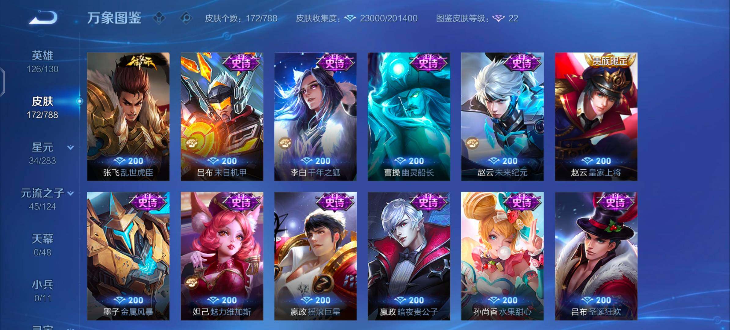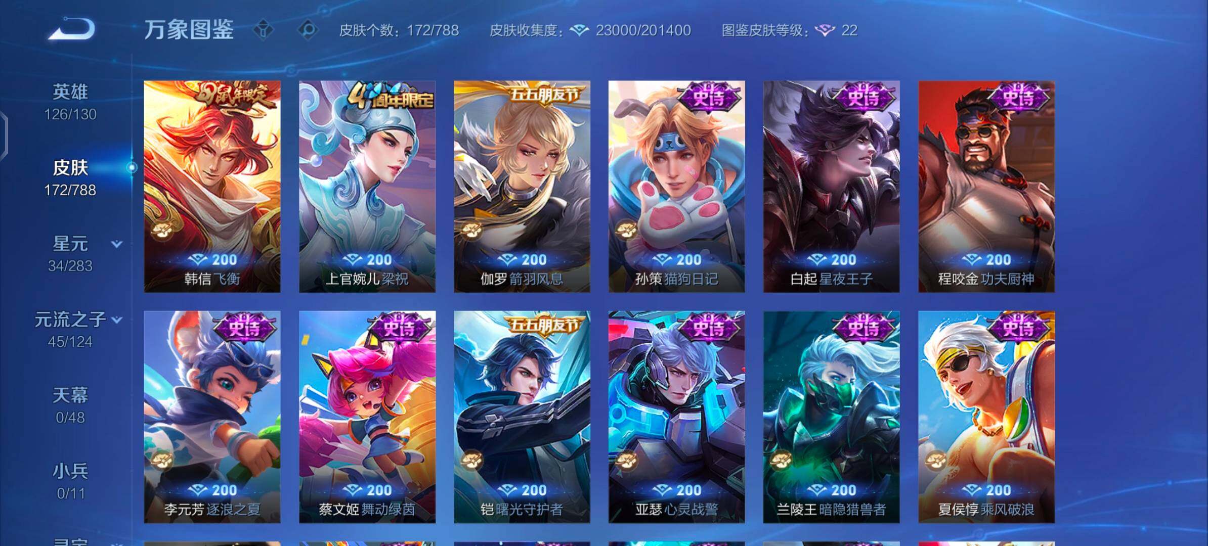 【史诗皮肤】:盘古撼世英歌,周瑜线条小狗,小乔线条小狗,项羽九幽镇关,莱西奥光弋星穹,公孙离涂山容容,狂铁龙之律动,弈星万物之道,蒙犽百解令,阿古朵江河有灵,司空震地狱燃心,戈娅驭风魔法,刘禅电玩爆裂旋风,元歌无心,鬼谷子五谷丰年,钟无艳超时空战士,狂铁电玩高手,杨戬天秀启明,百里玄策热力回旋,裴擒虎李小龙,韩信飞衡,上官婉儿梁祝,狄仁杰鹰眼统帅,伽罗箭羽风息,孙策猫狗日记,白起星夜王子,程咬金功夫厨神,李元芳逐浪之夏,蔡文姬舞动绿茵,铠曙光守护者,亚瑟心灵战警,兰陵王暗隐猎兽者,夏侯惇乘风破浪,张飞乱世虎臣,吕布末日机甲,李白千年之狐,曹操幽灵船长,吕布圣诞狂欢,墨子金属风暴,妲己魅力维加斯,嬴政摇滚巨星,嬴政暗夜贵公子,孙尚香水果甜心,宫本武藏鬼剑武藏,狄仁杰魔术师,王昭君偶像歌手,甄姬冰雪圆舞曲,貂蝉圣诞恋歌,赵云未来纪元,赵云皇家上将