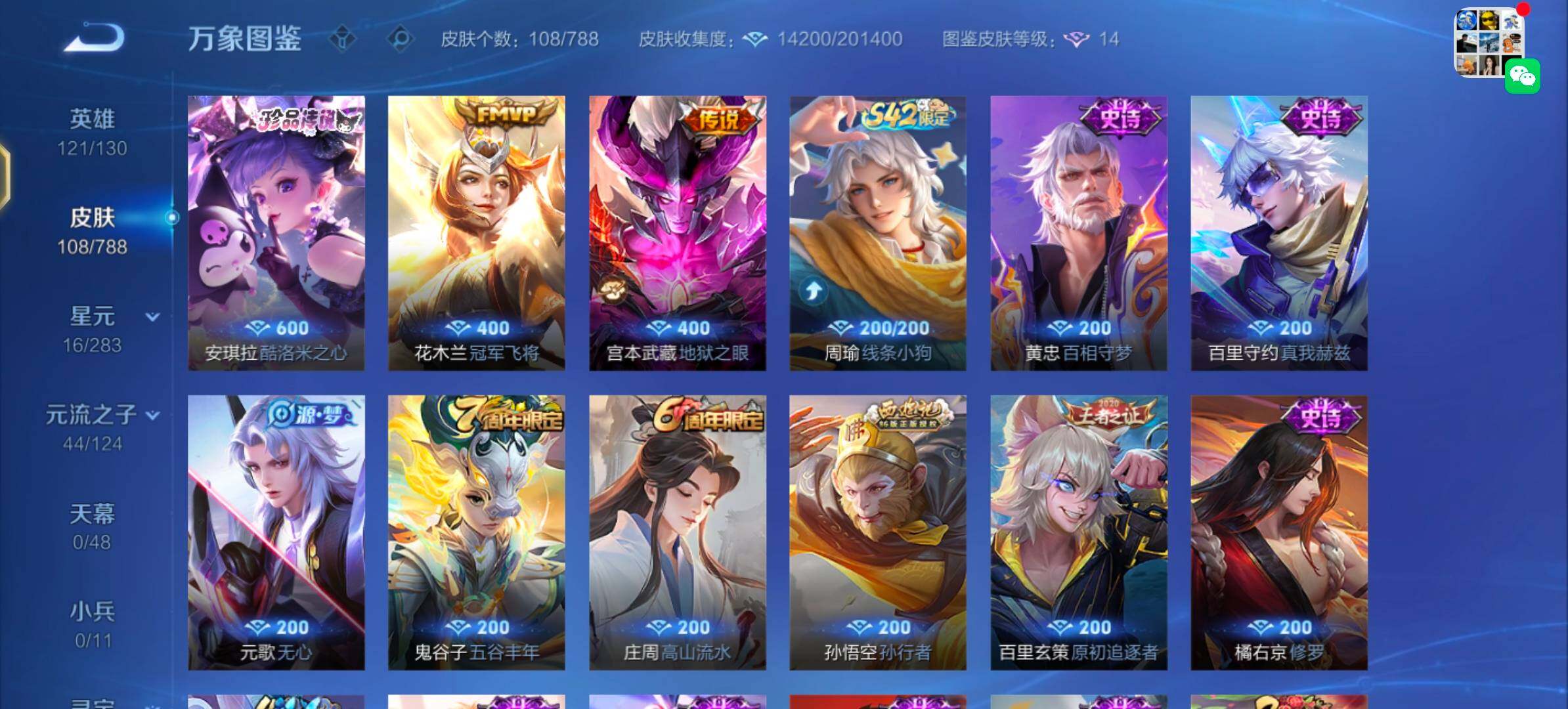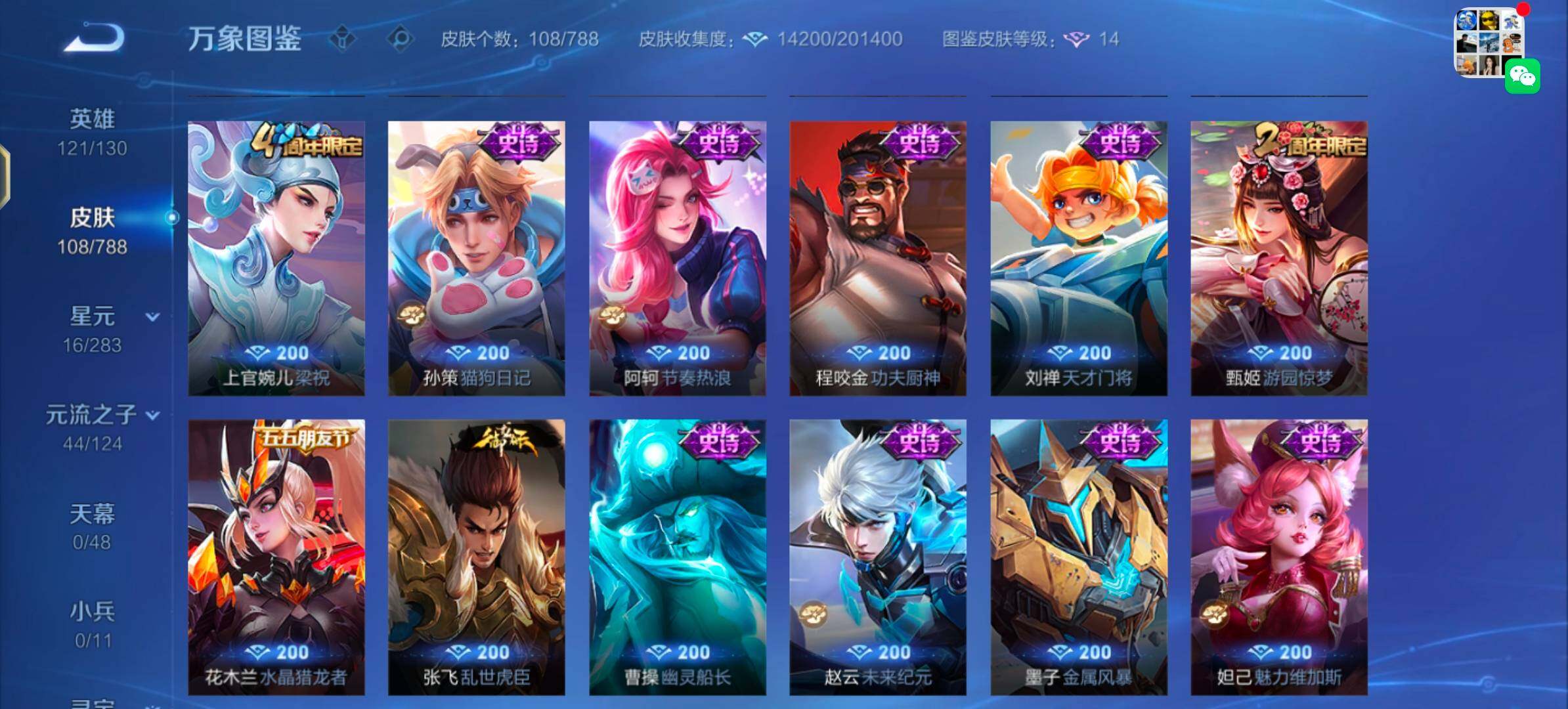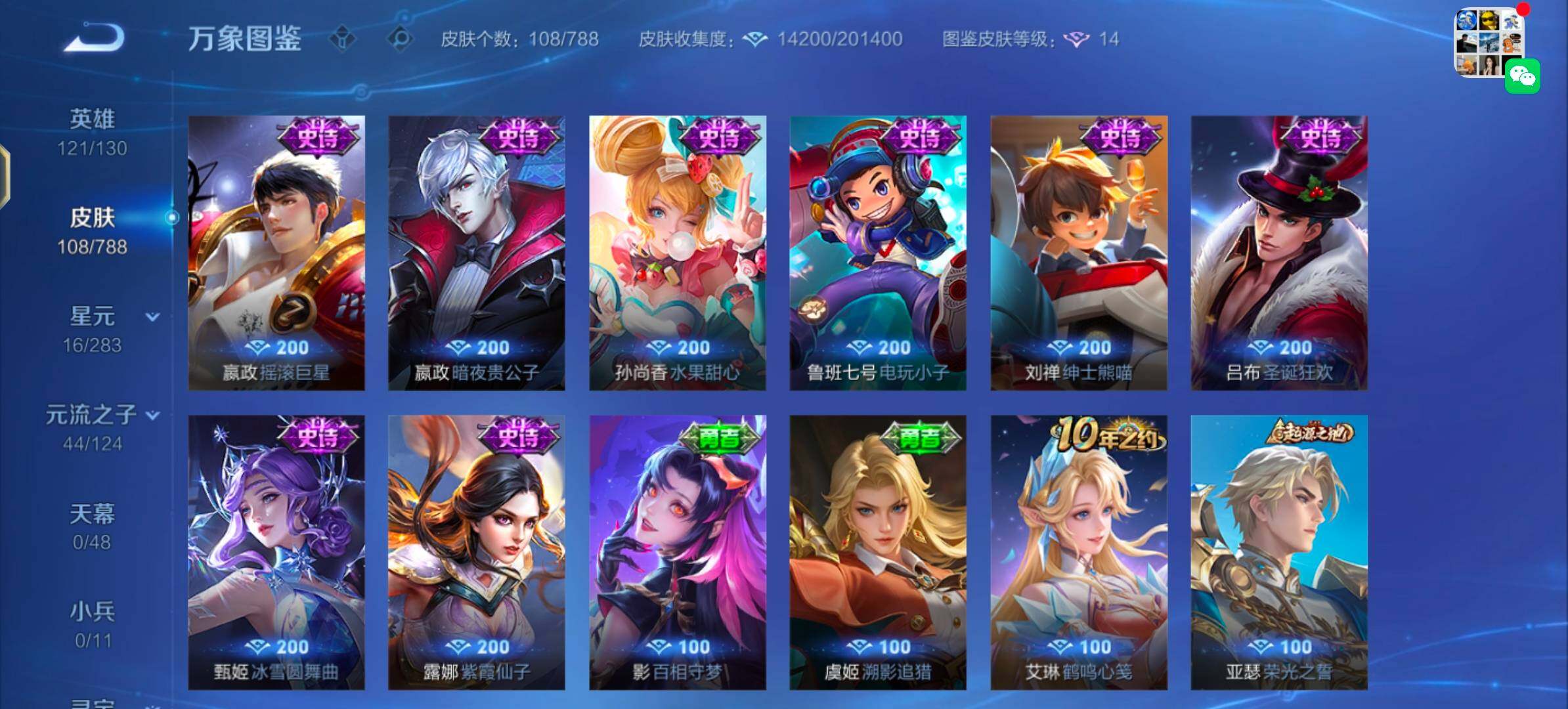 【史诗皮肤】:周瑜线条小狗,黄忠百相守梦,百里守约真我赫兹,元歌无心,鬼谷子五谷丰年,庄周高山流水,孙悟空孙行者,百里玄策原初追逐者,橘右京修罗,上官婉儿梁祝,狄仁杰鹰眼统帅,孙策猫狗日记,阿轲节奏热浪,程咬金功夫厨神,刘禅天才门将,甄姬游园惊梦,花木兰水晶猎龙者,张飞乱世虎臣,曹操幽灵船长,刘禅绅士熊喵,吕布圣诞狂欢,墨子金属风暴,妲己魅力维加斯,嬴政摇滚巨星,嬴政暗夜贵公子,孙尚香水果甜心,甄姬冰雪圆舞曲,赵云未来纪元,露娜紫霞仙子,鲁班七号电玩小子