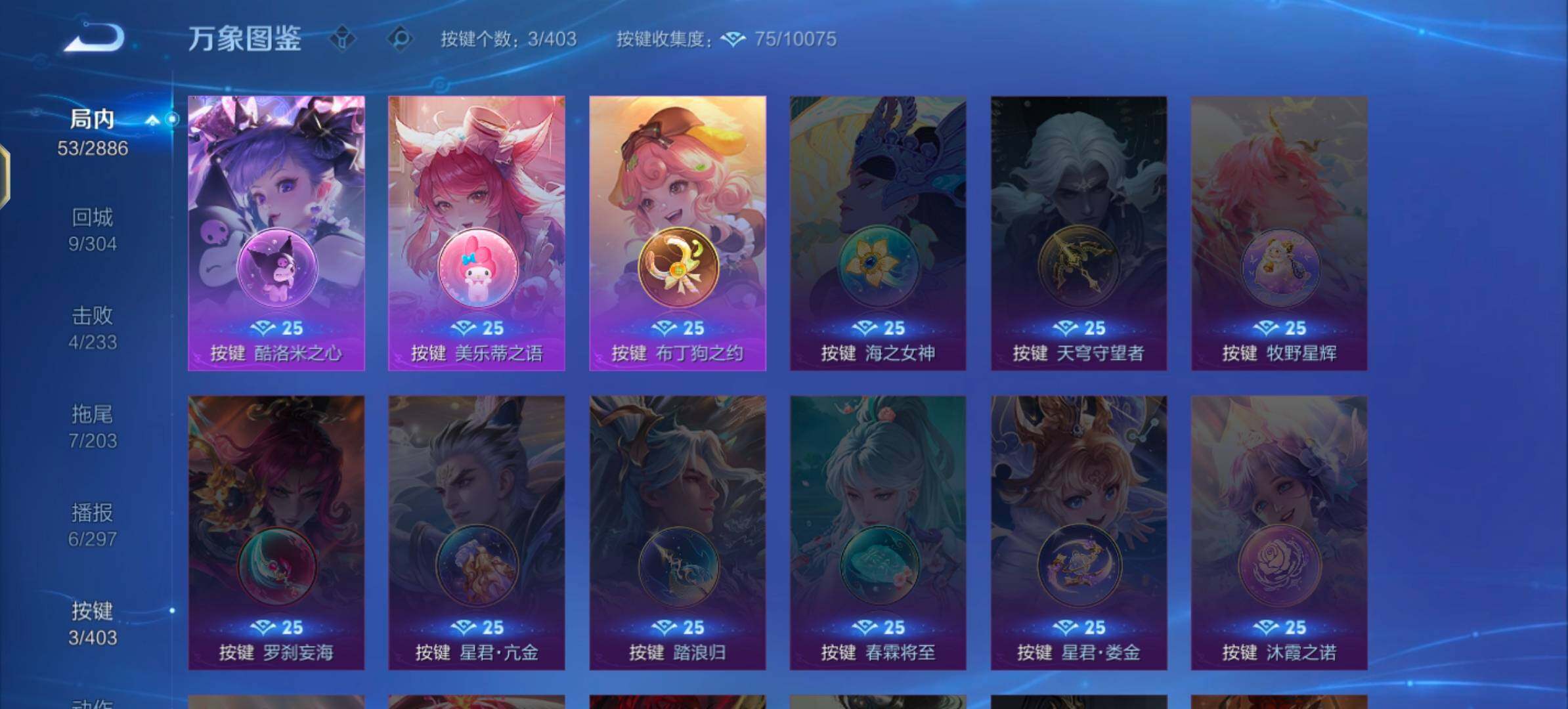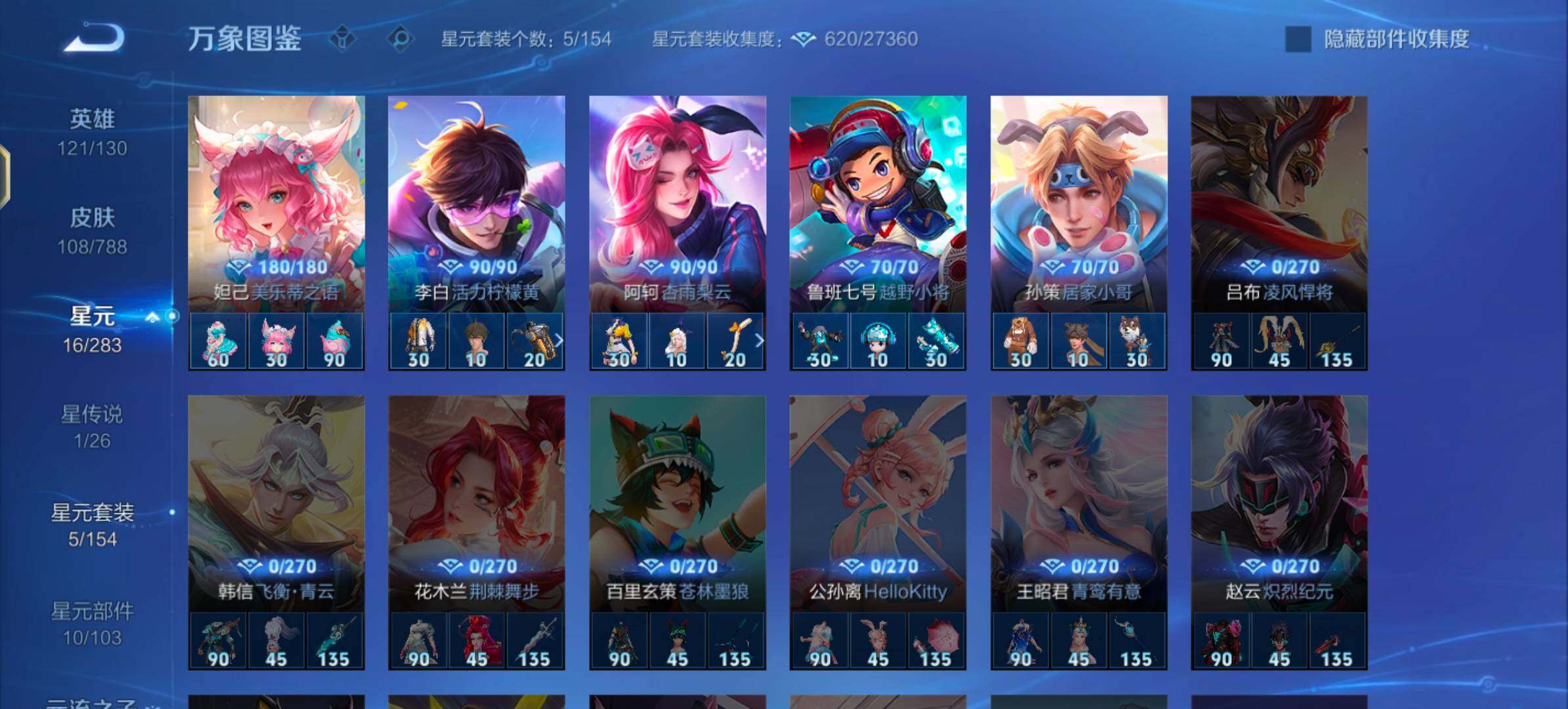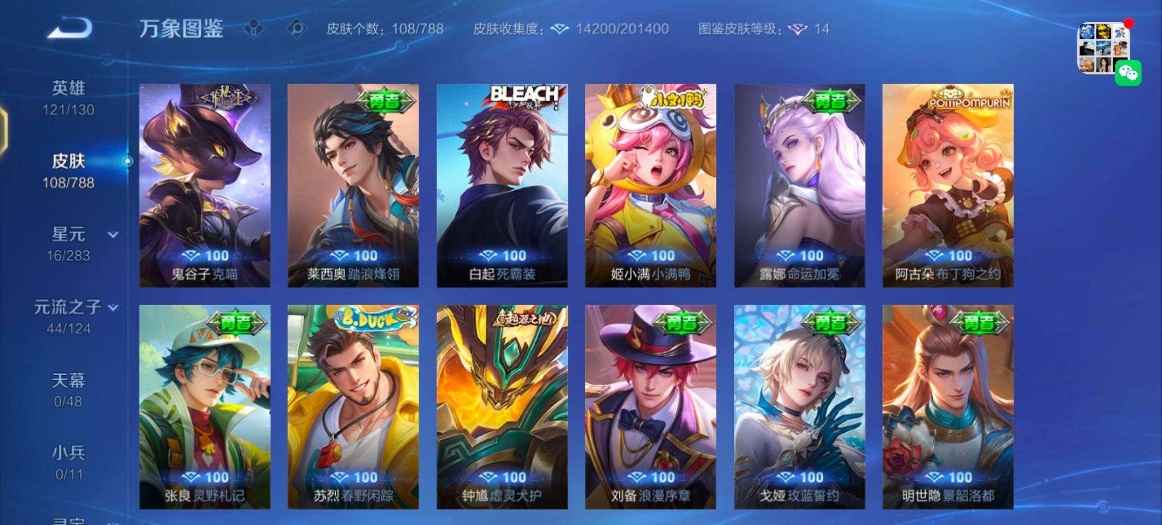 【其他皮肤】:影百相守梦,虞姬溯影追猎,艾琳鹤鸣心笺,亚瑟荣光之誓,鬼谷子克喵,莱西奥踏浪烽翎,白起死霸装,姬小满小满鸭,露娜命运加冕,阿古朵布丁狗之约,张良灵野札记,苏烈春野闲踪,钟馗虚灵犬护,刘备浪漫序章,戈娅玫蓝誓约,明世隐景韶洛都,西施雪境奇遇,典韦铁骨偃魂,太乙真人谧流熔炉,苍苍林狼骑,干将莫邪雾都夜雨,东皇太一噬灭天穹,大司命暗都幽影,刘邦剑破天穹,沈梦溪龙舞盛年,后羿完美运算,鲁班大师探海日志,太乙真人劲辣红锅,裴擒虎擒涛扼浪,猪八戒潮玩探月行,桑启海盐诗旅,李元芳云中旅人,蒙恬蔚蓝守将,兰陵王金庭之子,达摩沙漠行僧,妲己紫罗兰之誓,苏烈千军破阵,刘禅秘密基地,狂铁特工战影,高渐离玩趣恶龙,孙膑归虚梦演,吕布野性能量,明世隐虹云星官,李白敏锐之力,诸葛亮掌控之力,老夫子功夫老勺,关羽龙腾万里,狄仁杰阴阳师,后羿阿尔法小队,刘备万事如意,甄姬花好人间,达摩拳王,亚瑟死亡骑士,典韦黄金武士,安琪拉玩偶对对碰,宫本武藏未来纪元,扁鹊化身博士,武则天东方不败,牛魔西部大镖客,白起白色死神,赵云忍炎影,达摩大发明家,韩信街头霸王,韩信教廷特使,项羽海滩派对,云缨赤焰之缨,澜孤猎,瑶森,李信灼热之刃,孙策海之征途,铠龙域领主,干将莫邪第七人偶,东皇太一东海龙王,马可波罗激情绿茵,张良一千零一夜