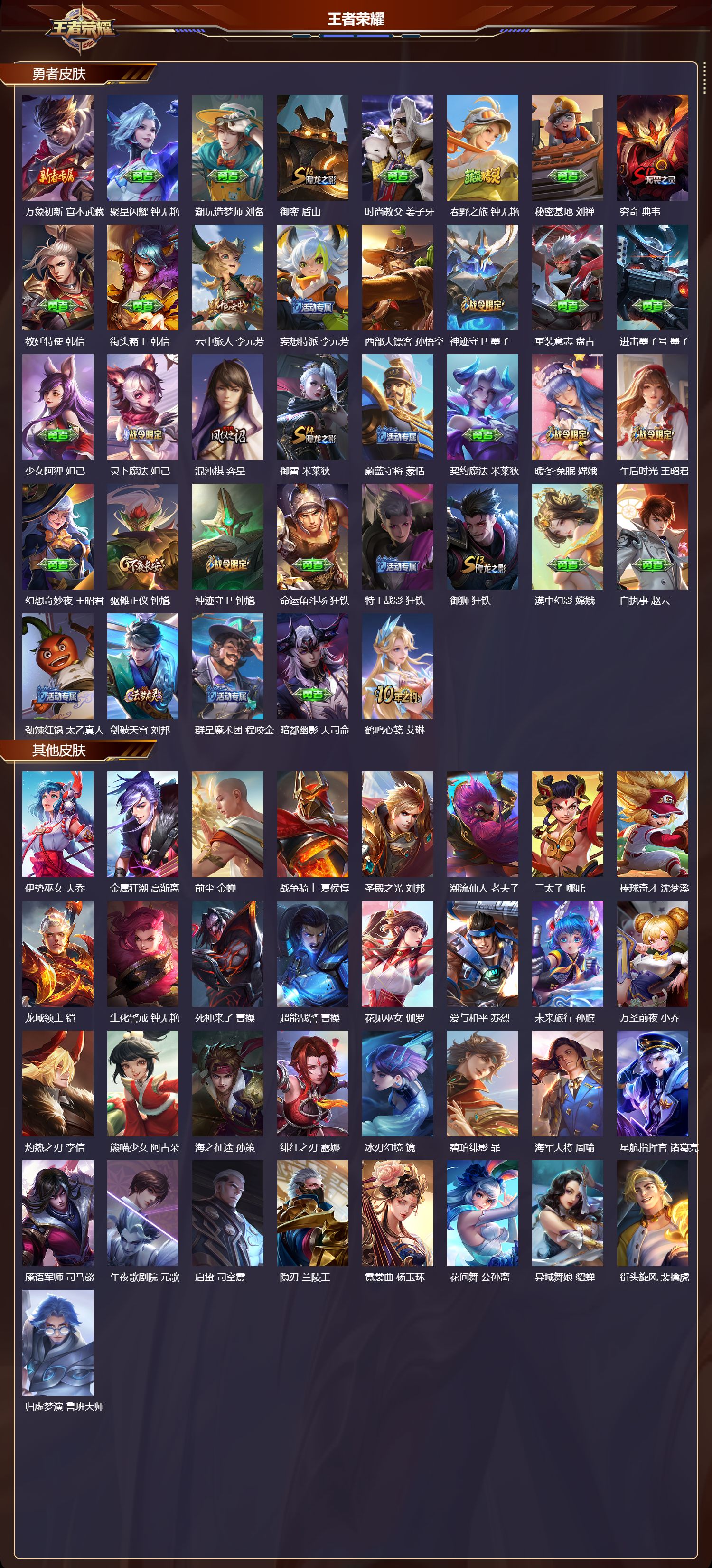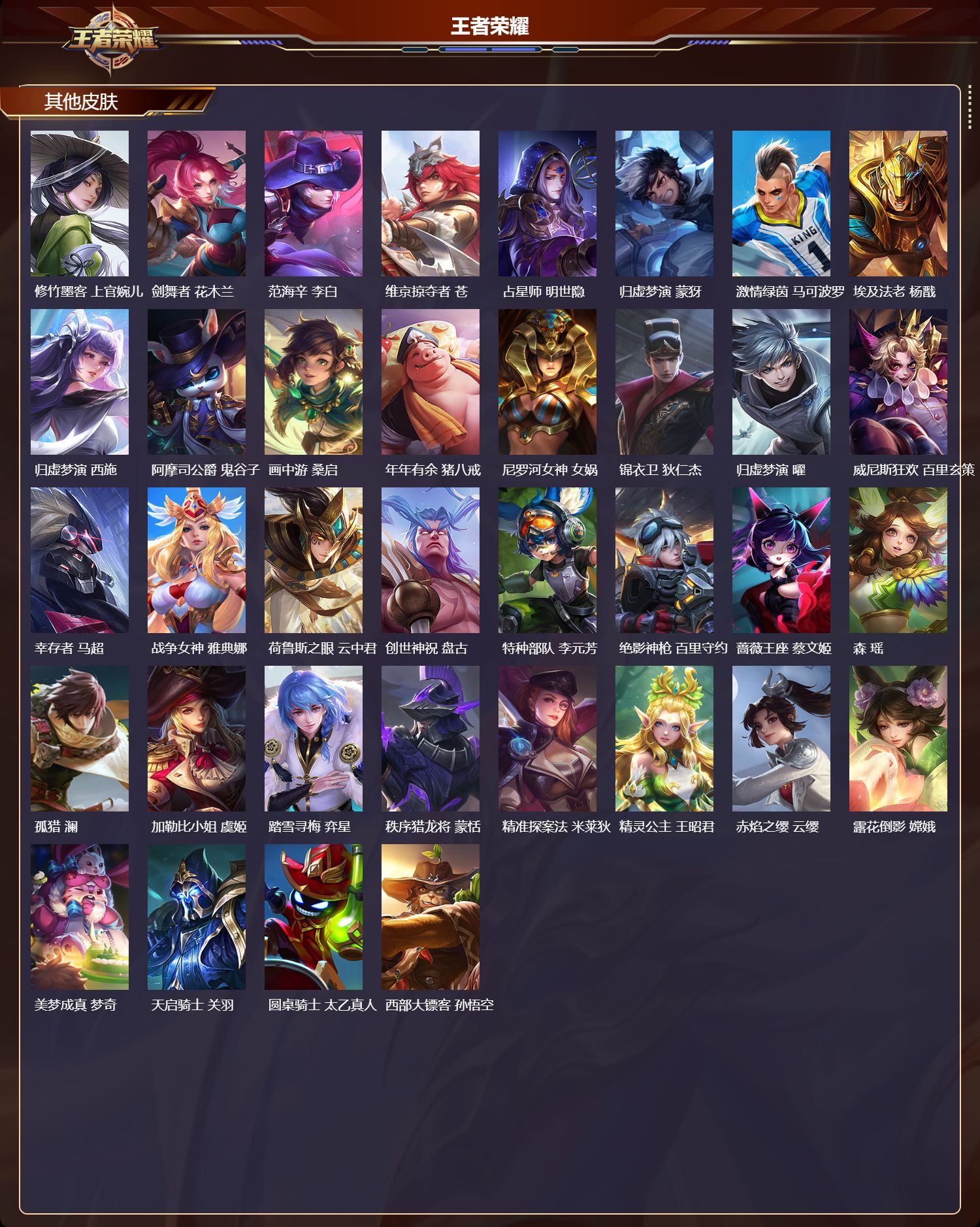 【69,其他皮肤】伊势巫女,大乔,金属狂潮,高渐离,前尘,金蝉,战争骑士,夏侯惇,圣殿之光,刘邦,潮流仙人,老夫子,三太子,哪吒,棒球奇才,沈梦溪,龙域领主,铠,生化警戒,钟无艳,死神来了,曹操,超能战警,曹操,花见巫女,伽罗,爱与和平,苏烈,未来旅行,孙膑,万圣前夜,小乔,灼热之刃,李信,熊喵少女,阿古朵,海之征途,孙策,绯红之刃,露娜,冰刃幻境,镜,碧珀绯影,暃,海军大将,周瑜,星航指挥官,诸葛亮,魇语军师,司马懿,午夜歌剧院,元歌,启蛰,司空震,隐刃,兰陵王,霓裳曲,杨玉环,花间舞,公孙离,异域舞娘,貂蝉,街头旋风,裴擒虎,归虚梦演,鲁班大师,修竹墨客,上官婉儿,剑舞者,花木兰,范海辛,李白,维京掠夺者,苍,占星师,明世隐,归虚梦演,蒙犽,激情绿茵,马可波罗,埃及法老,杨戬,归虚梦演,西施,阿摩司公爵,鬼谷子,画中游,桑启,年年有余,猪八戒,尼罗河女神,女娲,锦衣卫,狄仁杰,归虚梦演,曜,威尼斯狂欢,百里玄策,幸存者,马超,战争女神,雅典娜,荷鲁斯之眼,云中君,创世神祝,盘古,特种部队,李元芳,绝影神枪,百里守约,蔷薇王座,蔡文姬,森,瑶,孤猎,澜,加勒比小姐,虞姬,踏雪寻梅,弈星,秩序猎龙将,蒙恬,精准探案法,米莱狄,精灵公主,王昭君,赤焰之缨,云缨,露花倒影,嫦娥,美梦成真,梦奇,天启骑士,关羽,圆桌骑士,太乙真人,西部大镖客,孙悟空,
