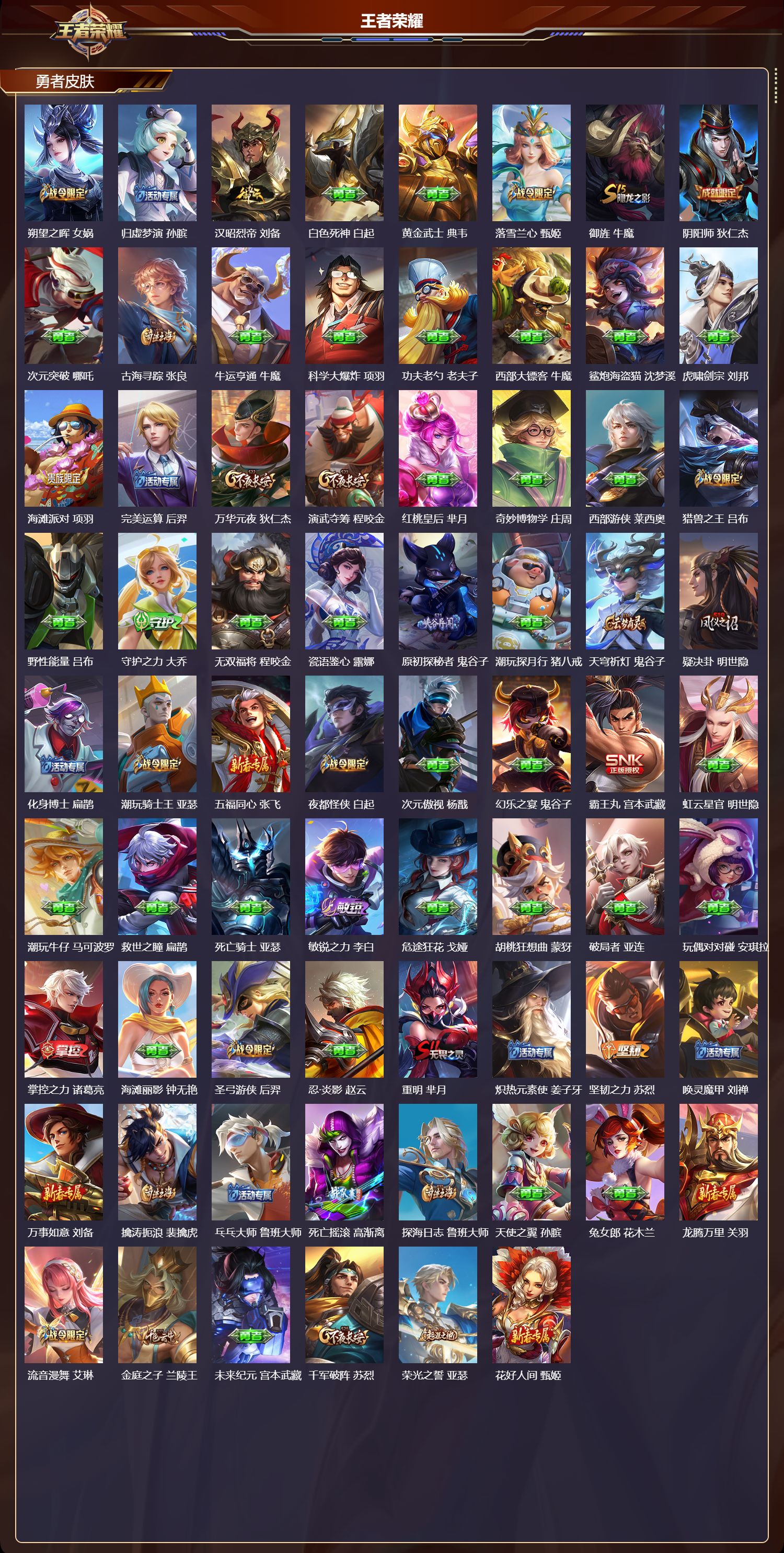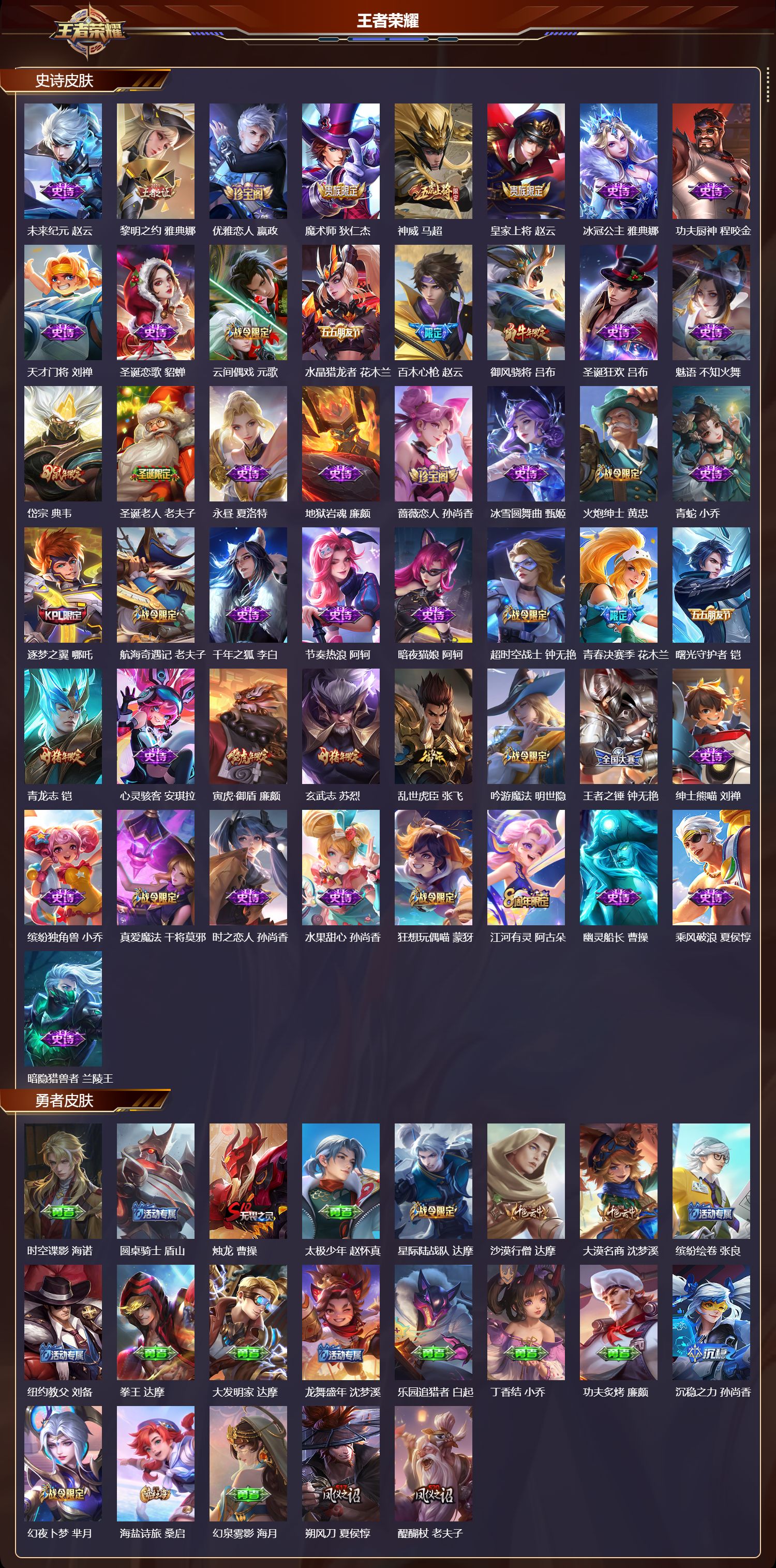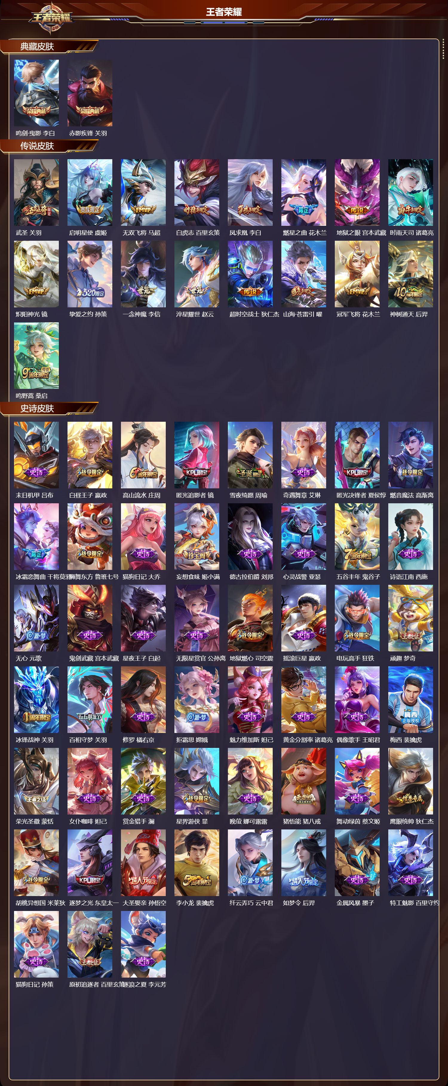【100,史诗皮肤】末日机甲,吕布,白昼王子,嬴政,高山流水,庄周,匿光追影者,镜,雪夜绮愿,周瑜,奇遇舞章,艾琳,匿光决锋者,夏侯惇,燃音魔法,高渐离,冰霜恋舞曲,干将莫邪,狮舞东方,鲁班七号,猫狗日记,大乔,妄想食味,姬小满,德古拉伯爵,刘邦,心灵战警,亚瑟,五谷丰年,鬼谷子,诗语江南,西施,无心,元歌,鬼剑武藏,宫本武藏,星夜王子,白起,无限星赏官,公孙离,地狱燃心,司空震,摇滚巨星,嬴政,电玩高手,狂铁,顽趣,梦奇,冰锋战神,关羽,百相守梦,关羽,修罗,橘右京,拒霜思,嫦娥,魅力维加斯,妲己,黄金分割率,诸葛亮,偶像歌手,王昭君,梅西,裴擒虎,荣光圣徽,蒙恬,女仆咖啡,妲己,赏金猎手,澜,星界游侠,暃,晚萤,娜可露露,猪悟能,猪八戒,舞动绿茵,蔡文姬,鹰眼统帅,狄仁杰,胡桃异想国,米莱狄,逐梦之光,东皇太一,大圣娶亲,孙悟空,李小龙,裴擒虎,纤云弄巧,云中君,如梦令,后羿,金属风暴,墨子,特工魅影,百里守约,猫狗日记,孙策,原初追逐者,百里玄策,逐浪之夏,李元芳,未来纪元,赵云,黎明之约,雅典娜,优雅恋人,嬴政,魔术师,狄仁杰,神威,马超,皇家上将,赵云,冰冠公主,雅典娜,功夫厨神,程咬金,天才门将,刘禅,圣诞恋歌,貂蝉,云间偶戏,元歌,水晶猎龙者,花木兰,百木心枪,赵云,御风骁将,吕布,圣诞狂欢,吕布,魅语,不知火舞,岱宗,典韦,圣诞老人,老夫子,永昼,夏洛特,地狱岩魂,廉颇,蔷薇恋人,孙尚香,冰雪圆舞曲,甄姬,火炮绅士,黄忠,青蛇,小乔,逐梦之翼,哪吒,航海奇遇记,老夫子,千年之狐,李白,节奏热浪,阿轲,暗夜猫娘,阿轲,超时空战士,钟无艳,青春决赛季,花木兰,曙光守护者,铠,青龙志,铠,心灵骇客,安琪拉,寅虎·御盾,廉颇,玄武志,苏烈,乱世虎臣,张飞,吟游魔法,明世隐,王者之锤,钟无艳,绅士熊喵,刘禅,缤纷独角兽,小乔,真爱魔法,干将莫邪,时之恋人,孙尚香,水果甜心,孙尚香,狂想玩偶喵,蒙犽,江河有灵,阿古朵,幽灵船长,曹操,乘风破浪,夏侯惇,暗隐猎兽者,兰陵王,