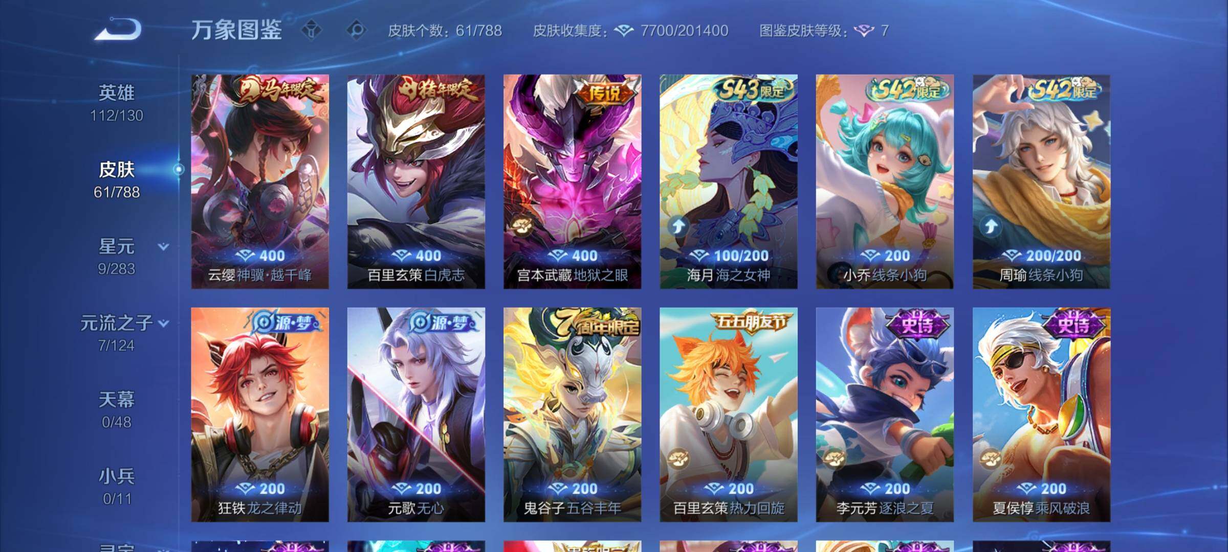 【限定皮肤】:狄仁杰阴阳师,赵云皇家上将,元歌无心,达摩沙漠行僧,项羽海滩派对,兰陵王金庭之子,李元芳云中旅人,鬼谷子五谷丰年,百里玄策白虎志,沈梦溪大漠名商,鲁班大师探海日志,桑启海盐诗旅,张良古海寻踪