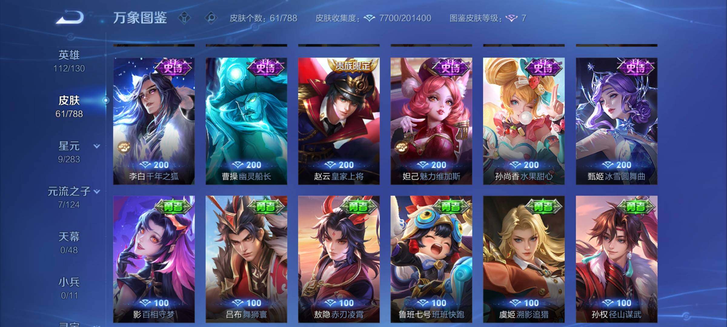 【史诗皮肤】:周瑜线条小狗,小乔线条小狗,狂铁龙之律动,元歌无心,鬼谷子五谷丰年,百里玄策热力回旋,狄仁杰鹰眼统帅,李元芳逐浪之夏,夏侯惇乘风破浪,李白千年之狐,曹操幽灵船长,妲己魅力维加斯,孙尚香水果甜心,甄姬冰雪圆舞曲,赵云皇家上将