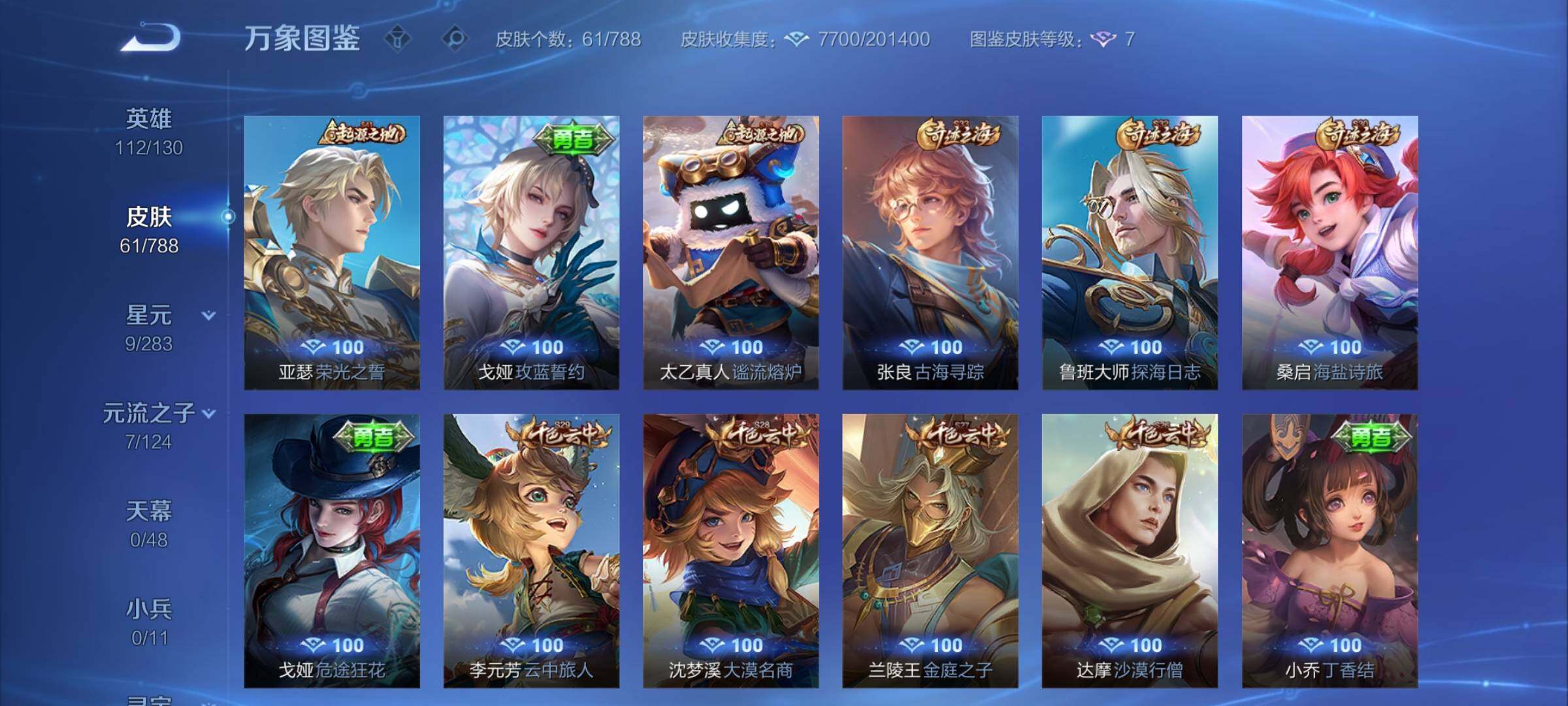 【赛季限定】:达摩沙漠行僧,兰陵王金庭之子,沈梦溪大漠名商,李元芳云中旅人,桑启海盐诗旅,鲁班大师探海日志,张良古海寻踪,太乙真人谧流熔炉,亚瑟荣光之誓