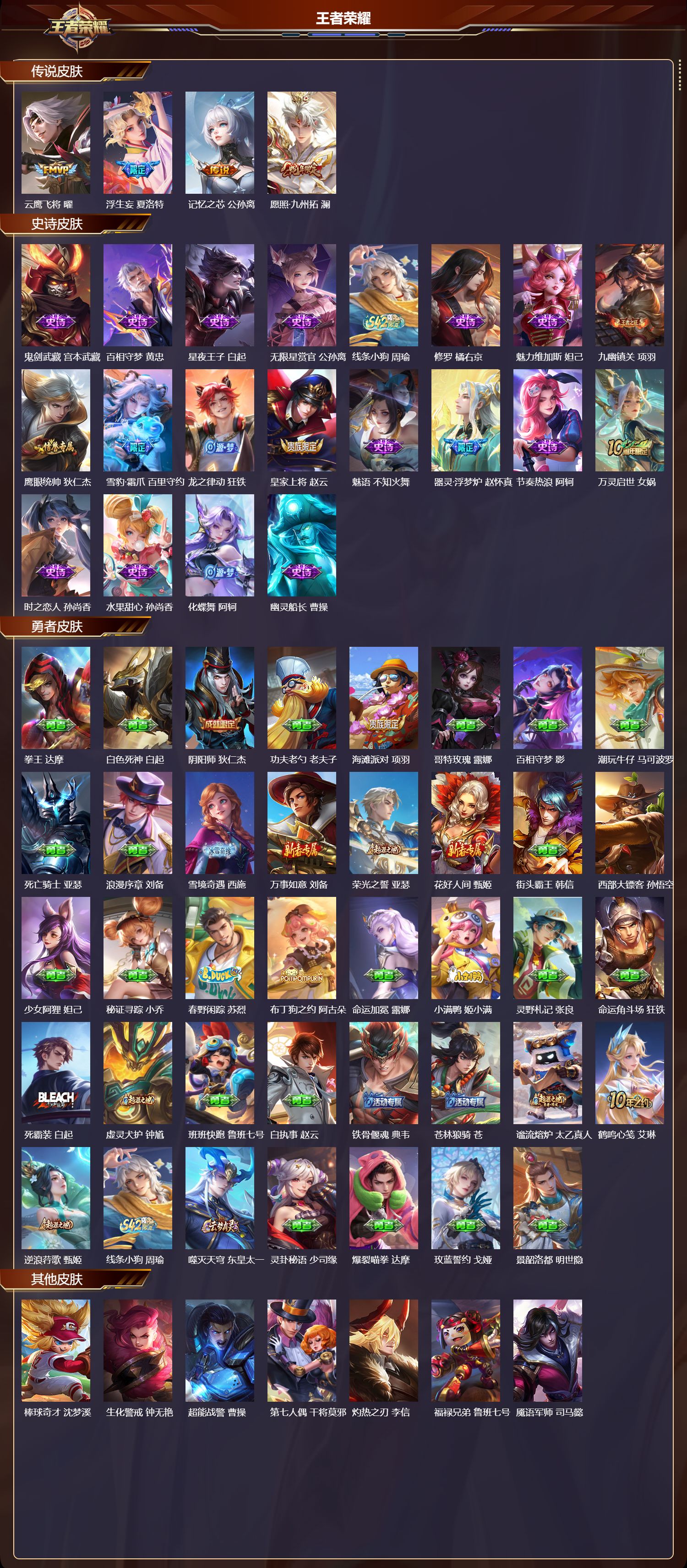 【20,史诗皮肤】鬼剑武藏,宫本武藏,百相守梦,黄忠,星夜王子,白起,无限星赏官,公孙离,线条小狗,周瑜,修罗,橘右京,魅力维加斯,妲己,九幽镇关,项羽,鹰眼统帅,狄仁杰,雪豹·霜爪,百里守约,龙之律动,狂铁,皇家上将,赵云,魅语,不知火舞,器灵·浮梦炉,赵怀真,节奏热浪,阿轲,万灵启世,女娲,时之恋人,孙尚香,水果甜心,孙尚香,化蝶舞,阿轲,幽灵船长,曹操,