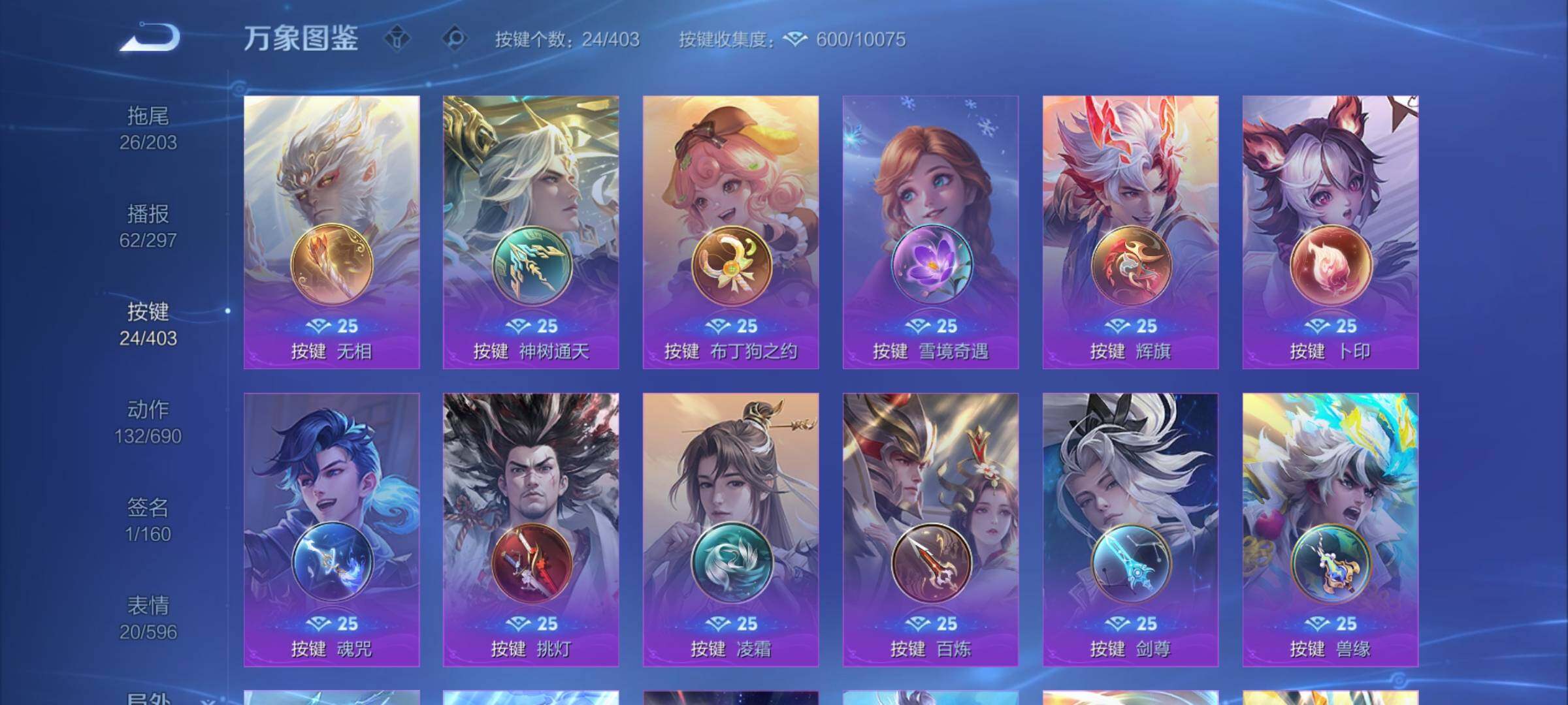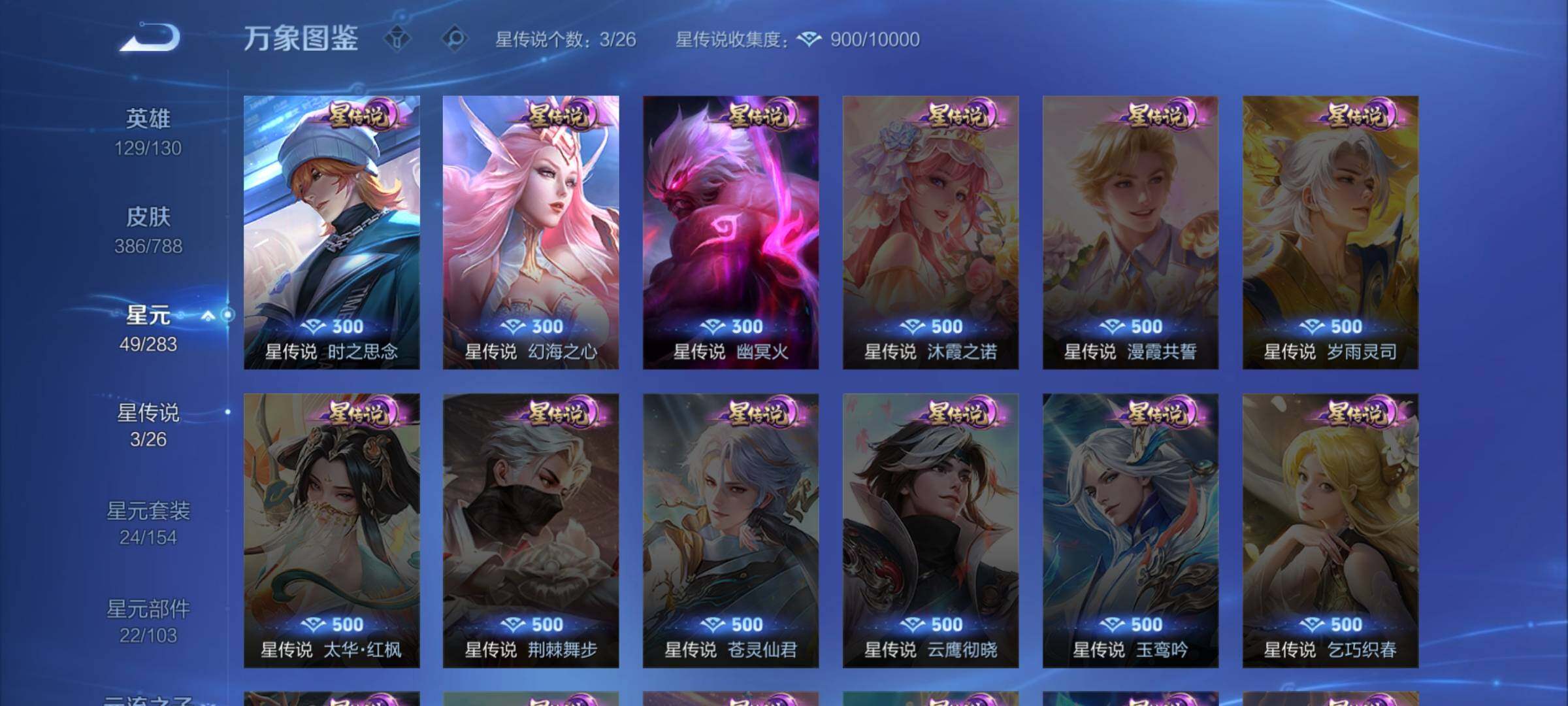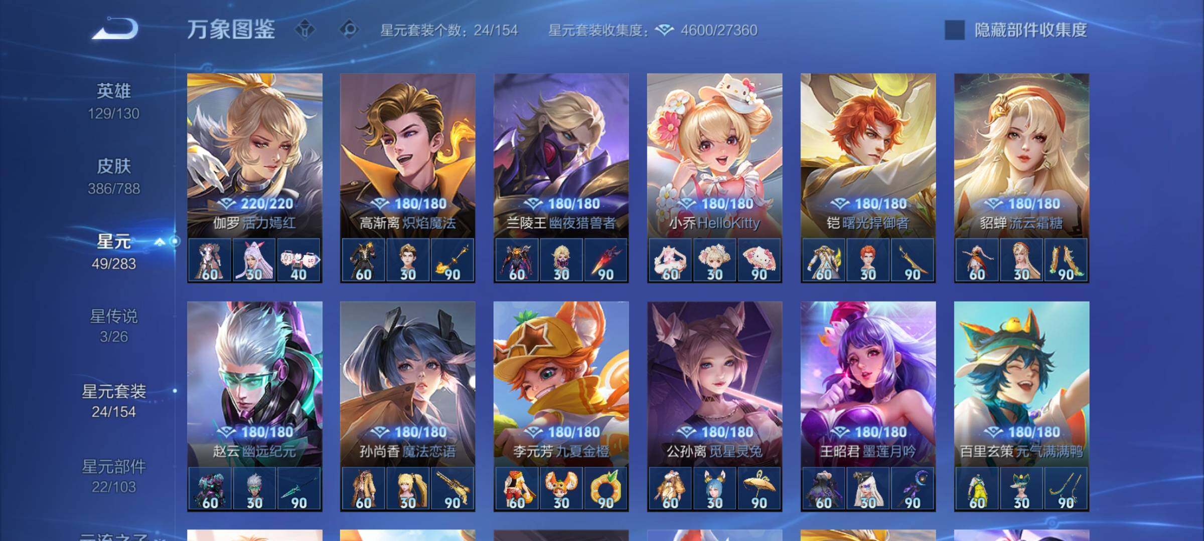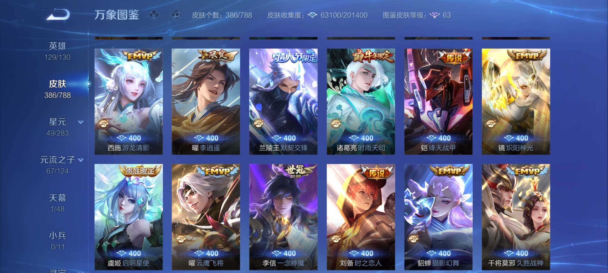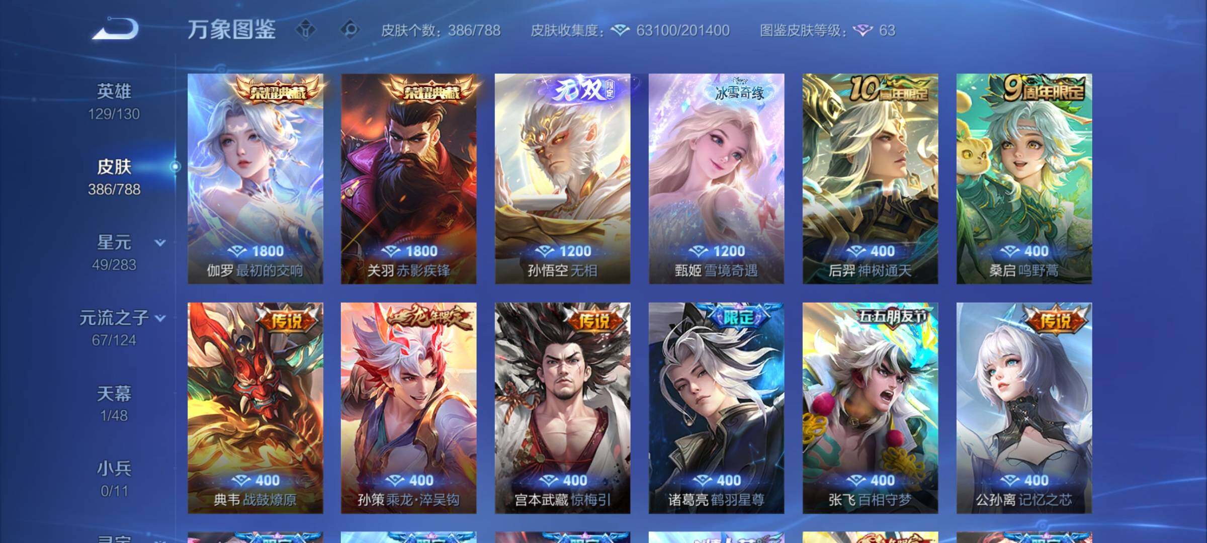 【史诗皮肤】:钟馗锁墨魂,周瑜线条小狗,小乔线条小狗,女娲万灵启世,百里玄策罗小黑战记,莱西奥光弋星穹,黄忠百相守梦,后羿石田雨龙,扁鹊灵蛊蚀心,狂铁龙之律动,牛魔星界战将,鲁班七号蔬乡物语,安琪拉乘龙聚宝船,姬小满妄想食味,蒙恬荣光圣徽,高渐离燃音魔法,妲己灵卜魔法,周瑜雪夜绮愿,阿古朵江河有灵,司空震地狱燃心,赵怀真鹤归松栖,戈娅驭风魔法,刘禅电玩爆裂旋风,扁鹊奇幻香踪,瑶山海碧波行,马可波罗山海玄木吟,暃星界游侠,梦奇顽趣,元歌无心,鬼谷子五谷丰年,钟无艳超时空战士,金蝉唐三藏,貂蝉唤灵魅影,杨玉环寅虎心曲,雅典娜黎明之约,司马懿暗渊魔法,庄周高山流水,钟馗乐园奇幻夜,沈梦溪月团寄思,杨戬天秀启明,西施诗语江南,米莱狄胡桃异想国,云中君纤云弄巧,裴擒虎李小龙,百里玄策原初追逐者,蒙犽狂想玩偶喵,张飞虎魄,马可波罗暗影游猎,上官婉儿天狼绘梦者,孙尚香时之恋人,黄忠烈魂,赵云龙胆,马超神威,橘右京修罗,不知火舞魅语,小乔青蛇,甄姬幽恒,娜可露露晚萤,上官婉儿梁祝,兰陵王驯魔猎人,狄仁杰鹰眼统帅,鲁班七号狮舞东方,裴擒虎天狼狩猎者,伽罗箭羽风息,苏烈玄武志,百里守约朱雀志,铠青龙志,大乔猫狗日记,孙策猫狗日记,嬴政白昼王子,东皇太一逐梦之光,阿轲节奏热浪,白起星夜王子,程咬金功夫厨神,李元芳逐浪之夏,刘禅天才门将,蔡文姬舞动绿茵,铠曙光守护者,百里守约特工魅影,安琪拉心灵骇客,雅典娜冰冠公主,亚瑟心灵战警,甄姬游园惊梦,诸葛亮黄金分割率,兰陵王暗隐猎兽者,小乔缤纷独角兽,夏侯惇乘风破浪,韩信逐梦之影,刘邦德古拉伯爵,花木兰水晶猎龙者,赵云引擎之心,韩信白龙吟,张飞乱世虎臣,安琪拉魔法小厨娘,吕布末日机甲,李白千年之狐,曹操幽灵船长,周瑜真爱至上,刘禅绅士熊喵,吕布圣诞狂欢,墨子金属风暴,妲己女仆咖啡,妲己魅力维加斯,嬴政摇滚巨星,嬴政暗夜贵公子,嬴政优雅恋人,孙尚香水果甜心,宫本武藏鬼剑武藏,廉颇地狱岩魂,狄仁杰魔术师,王昭君偶像歌手,甄姬冰雪圆舞曲,貂蝉圣诞恋歌,赵云未来纪元,赵云皇家上将,露娜紫霞仙子,项羽苍穹之光