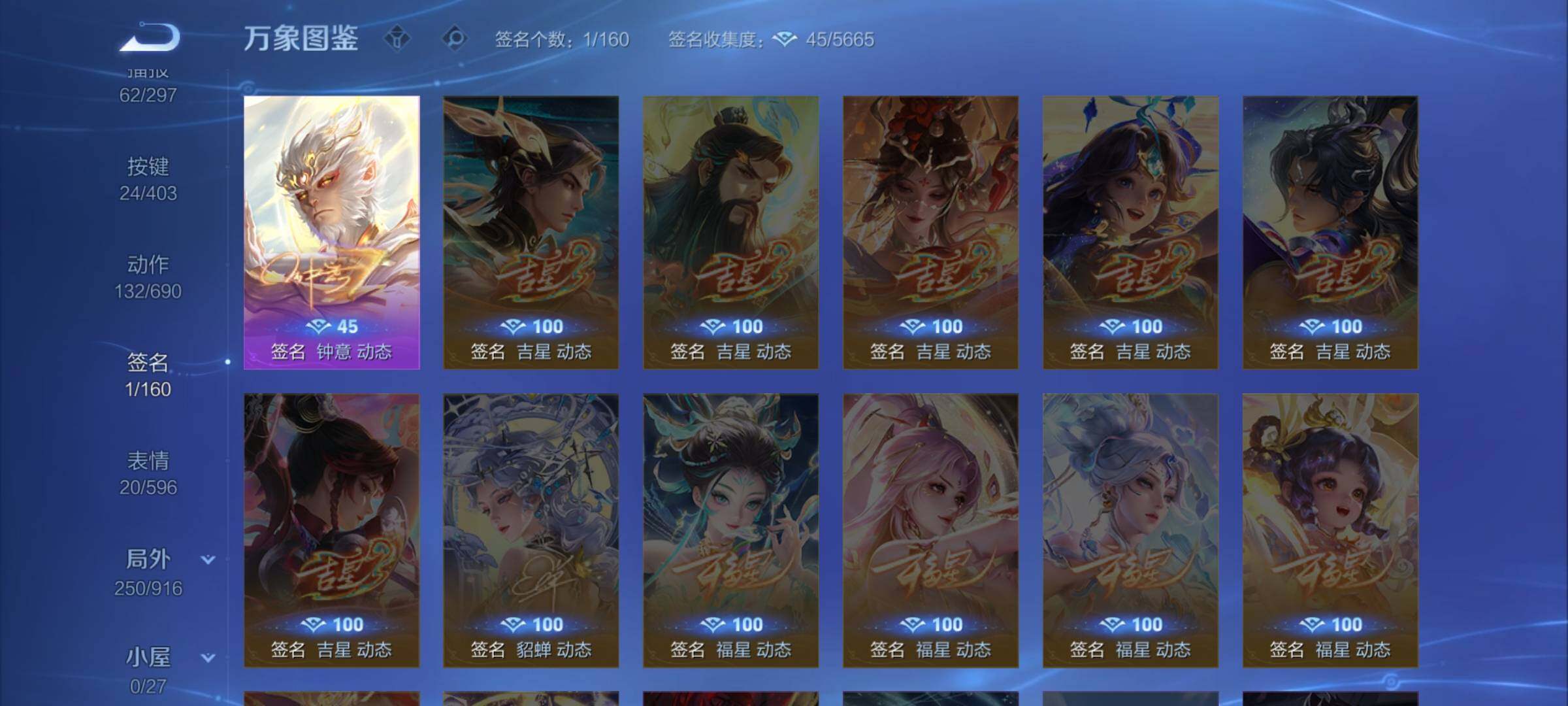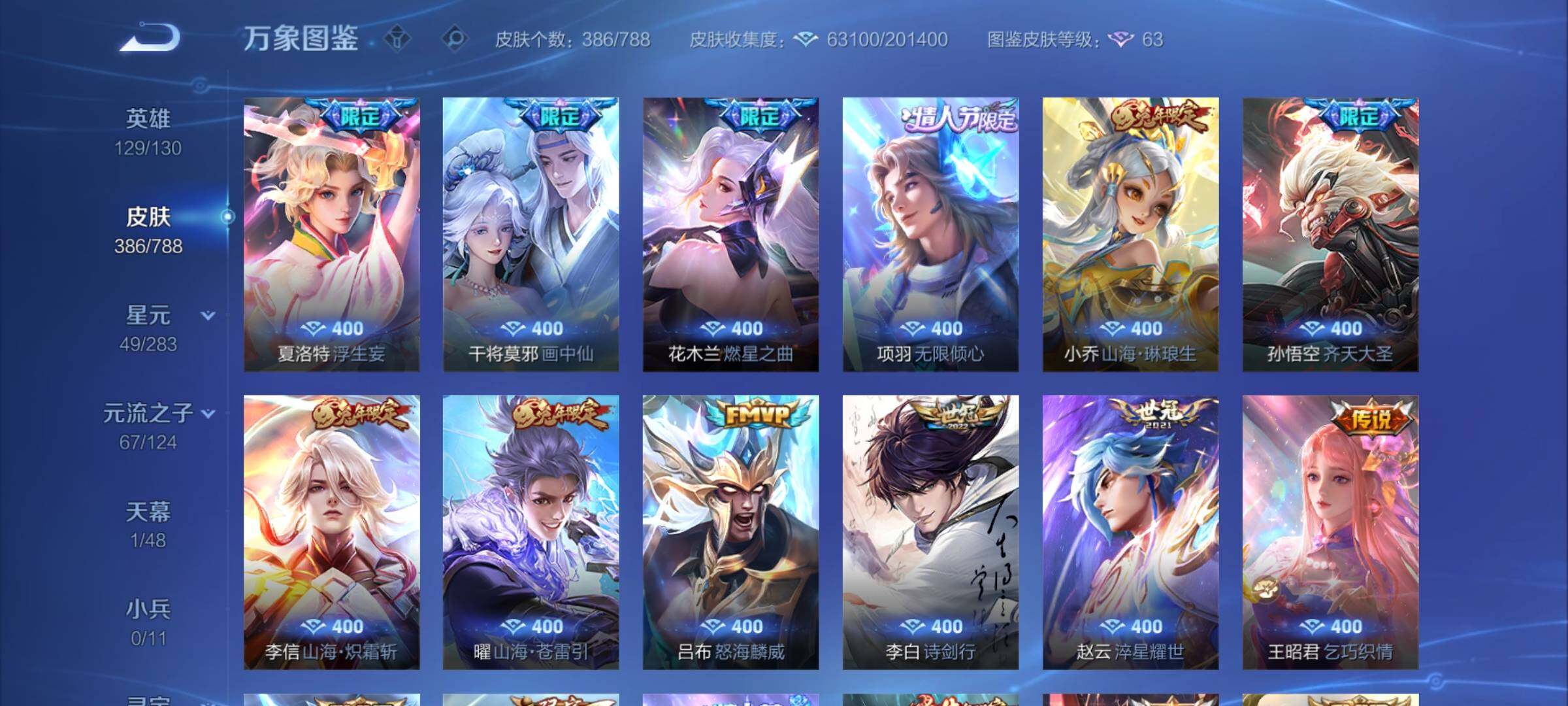 【赛季限定】:太乙真人饕餮,曹操烛龙,芈月重明,典韦穷奇,狂铁御狮,米莱狄御霄,牛魔御旌,盾山御銮,夏侯惇朔风刀,弈星混沌棋,明世隐疑决卦,老夫子醍醐杖,鬼谷子原初探秘者,狄仁杰万华元夜,程咬金演武夺筹,钟馗驱傩正仪,苏烈千军破阵,达摩沙漠行僧,沈梦溪大漠名商,李元芳云中旅人,桑启海盐诗旅,裴擒虎擒涛扼浪,鲁班大师探海日志,张良古海寻踪,鬼谷子天穹祈灯,刘邦剑破天穹,姜子牙天穹之誓,东皇太一噬灭天穹,太乙真人谧流熔炉,钟馗虚灵犬护,甄姬逆浪荇歌,亚瑟荣光之誓,百里玄策原初追逐者,雅典娜黎明之约,梦奇顽趣,蒙恬荣光圣徽,牛魔星界战将