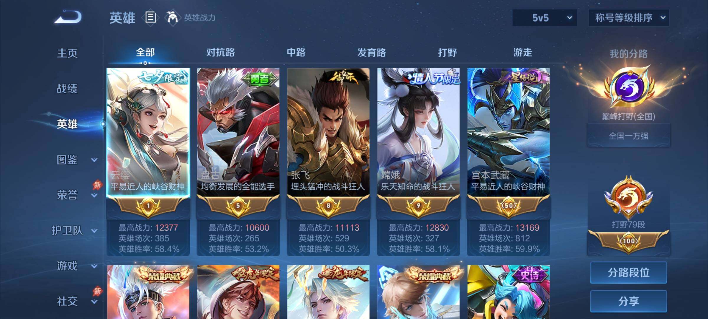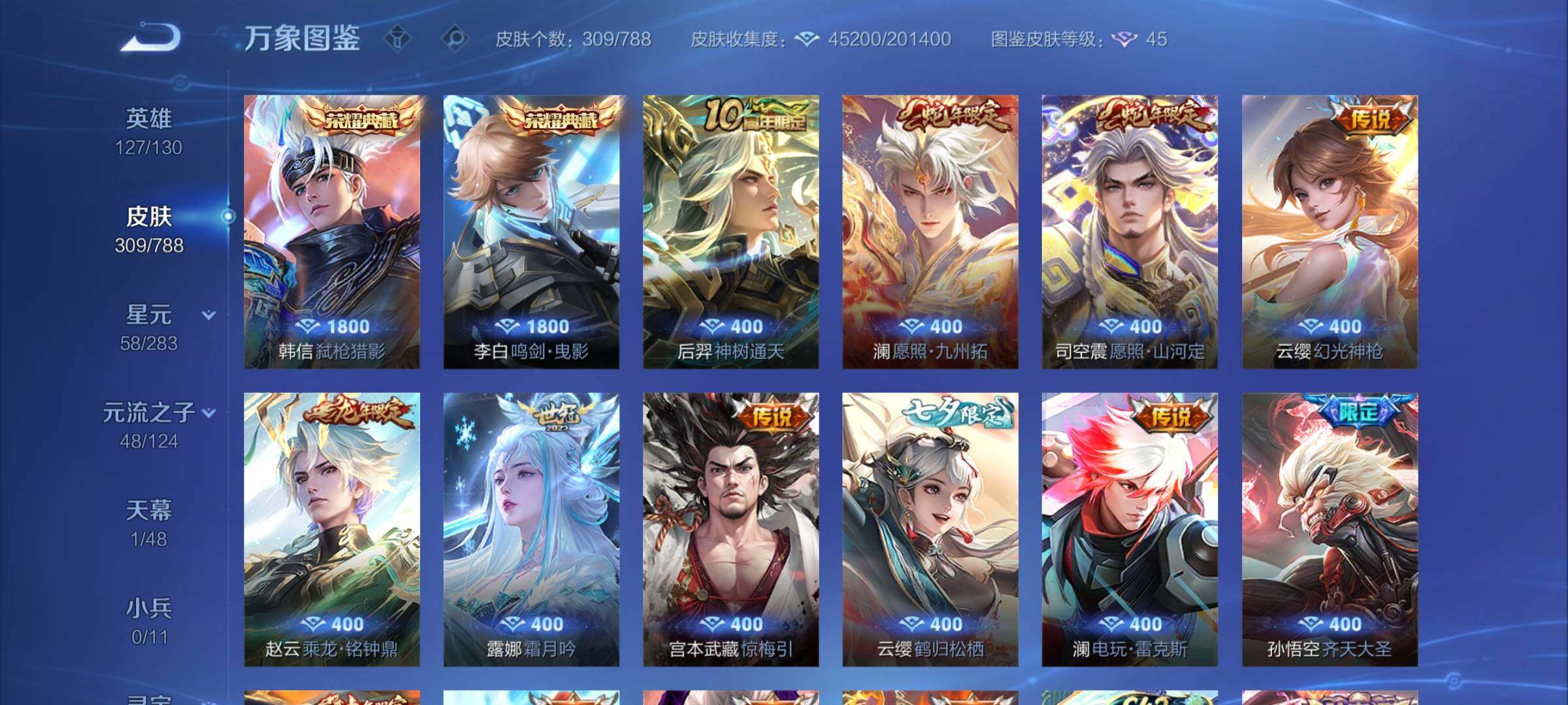 【传说皮肤】:后羿神树通天,司空震愿照山河定,澜愿照九州拓,云缨幻光神枪,赵云乘龙铭钟鼎,露娜霜月吟,宫本武藏惊梅引,云缨鹤归松栖,澜电玩雷克斯,孙悟空齐天大圣,裴擒虎寅虎赤拳,梦奇胖达荣荣,宫本武藏地狱之眼,孙悟空地狱火
