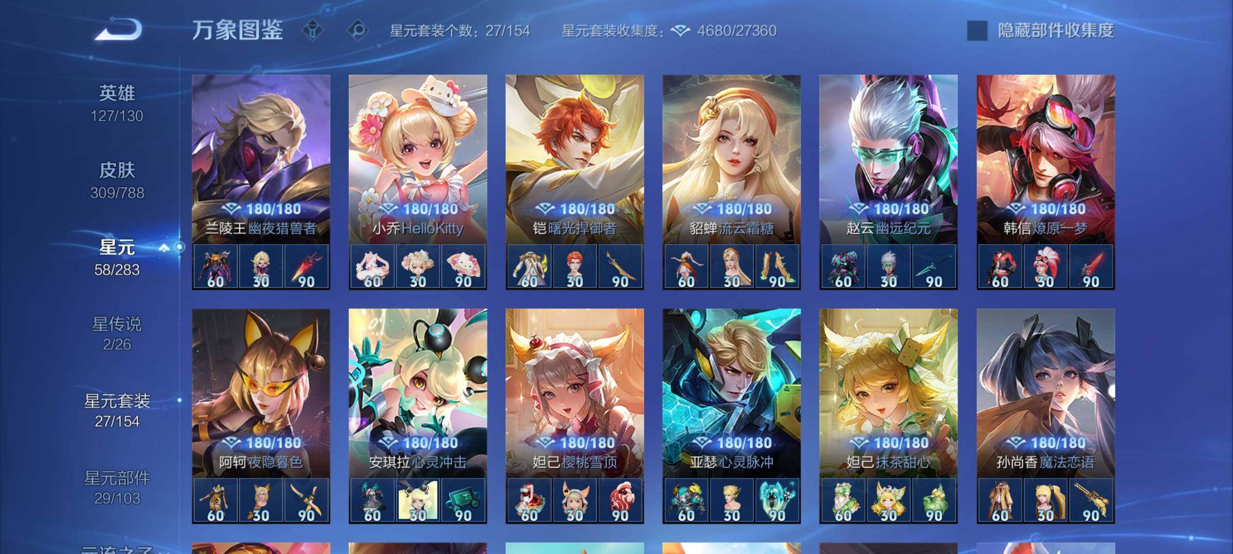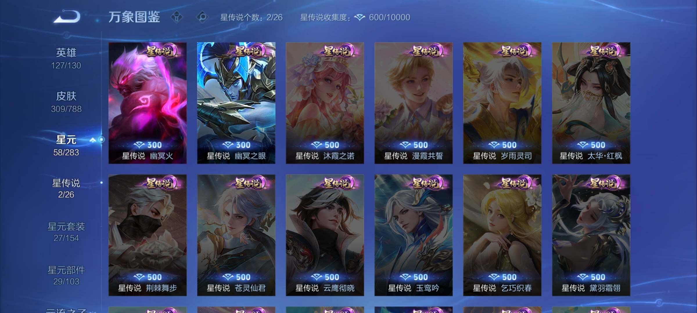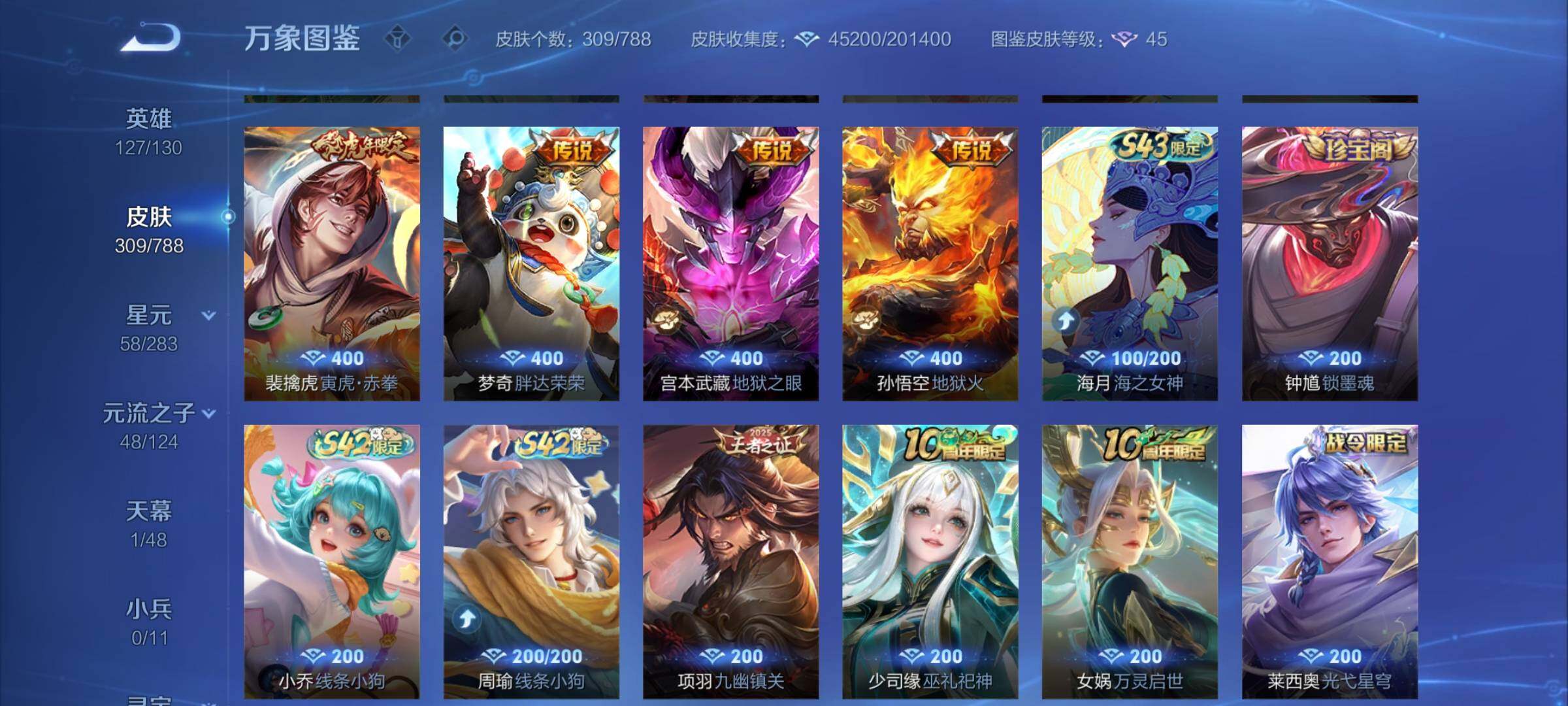 【战令限定】:元歌云间偶戏,亚瑟潮玩骑士王,米莱狄胡桃异想国,达摩星际陆战队,老夫子航海奇遇记,墨子神迹守卫,干将莫邪真爱魔法,后羿圣弓游侠,黄忠火炮绅士,芈月幻夜卜梦,狂铁电玩高手,王昭君午后时光,钟无艳超时空战士,甄姬落雪兰心,暃星界游侠,嫦娥暖冬兔眠,扁鹊奇幻香踪,杨戬潮玩骑兵,戈娅驭风魔法,西施玲珑珍味,司空震地狱燃心,艾琳流音漫舞,高渐离燃音魔法,妲己灵卜魔法,镜青焰无极,项羽苍威无极,莱西奥光弋星穹,明世隐往忆晖光,周瑜线条小狗,小乔线条小狗