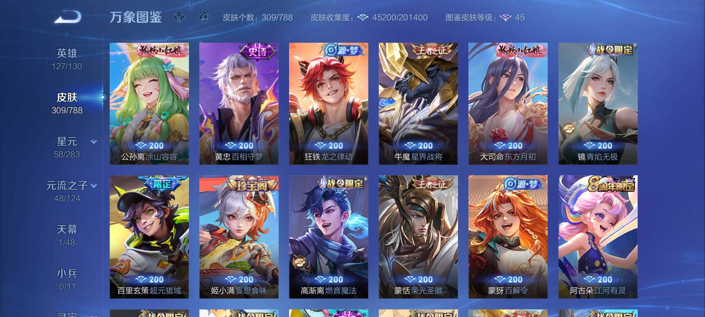 【史诗皮肤】:钟馗锁墨魂,周瑜线条小狗,小乔线条小狗,项羽九幽镇关,少司缘巫礼祀神,女娲万灵启世,莱西奥光弋星穹,公孙离涂山容容,黄忠百相守梦,狂铁龙之律动,牛魔星界战将,大司命东方月初,镜青焰无极,百里玄策超元猎域,姬小满妄想食味,蒙恬荣光圣徽,高渐离燃音魔法,妲己灵卜魔法,蒙犽百解令,阿古朵江河有灵,司空震地狱燃心,戈娅驭风魔法,刘禅电玩爆裂旋风,扁鹊奇幻香踪,暃星界游侠,梦奇顽趣,元歌无心,鬼谷子五谷丰年,钟无艳超时空战士,狂铁电玩高手,韩信傲雪梅枪,雅典娜黎明之约,黄忠火炮绅士,嫦娥拒霜思,庄周高山流水,猪八戒猪悟能,干将莫邪真爱魔法,杨戬天秀启明,老夫子航海奇遇记,西施诗语江南,米莱狄胡桃异想国,元歌云间偶戏,云中君纤云弄巧,裴擒虎李小龙,百里玄策原初追逐者,孙尚香时之恋人,嫦娥如梦令,韩信飞衡,娜可露露晚萤,狄仁杰鹰眼统帅,伽罗箭羽风息,大乔猫狗日记,孙策猫狗日记,杨玉环遇见飞天,阿轲节奏热浪,白起星夜王子,程咬金功夫厨神,李元芳逐浪之夏,刘禅天才门将,蔡文姬舞动绿茵,铠曙光守护者,百里守约特工魅影,雅典娜冰冠公主,亚瑟心灵战警,诸葛亮黄金分割率,兰陵王暗隐猎兽者,夏侯惇乘风破浪,韩信逐梦之影,花木兰水晶猎龙者,赵云引擎之心,韩信白龙吟,张飞乱世虎臣,吕布末日机甲,李白千年之狐,曹操幽灵船长,刘禅绅士熊喵,墨子金属风暴,墨子龙骑士,妲己女仆咖啡,妲己魅力维加斯,孙尚香水果甜心,孙尚香蔷薇恋人,宫本武藏鬼剑武藏,廉颇地狱岩魂,狄仁杰魔术师,甄姬冰雪圆舞曲,貂蝉圣诞恋歌,赵云未来纪元,赵云皇家上将,阿轲暗夜猫娘,露娜紫霞仙子,项羽苍穹之光,鲁班七号电玩小子