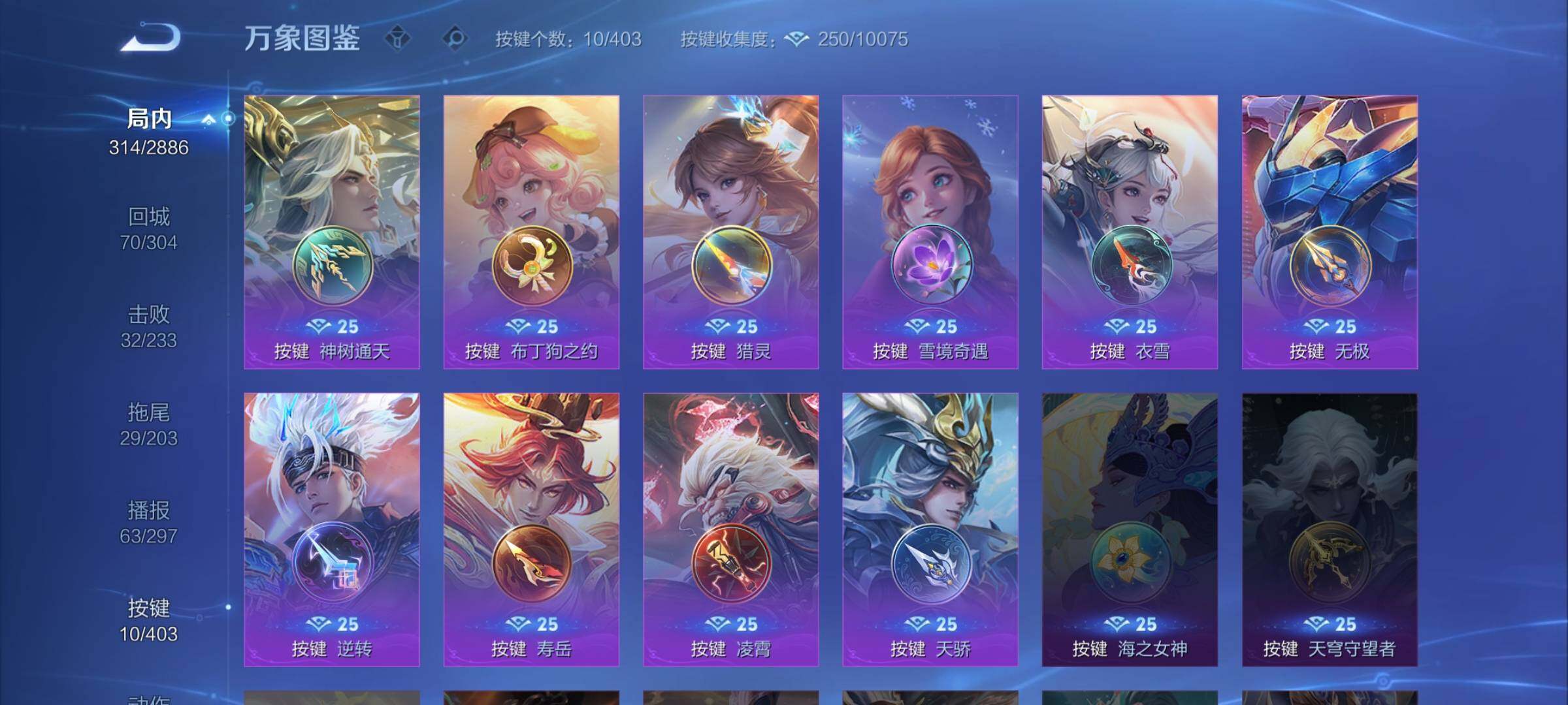 【其他皮肤】:影百相守梦,兰陵王雾影缉谜,鲁班七号班班快跑,桑启线条小狗,鬼谷子谜偶窥秘,虞姬溯影追猎,蚩奼极光幻客,曹操逐霄之志,艾琳鹤鸣心笺,孙权径山谋武,明世隐往忆晖光,亚瑟荣光之誓,哪吒罗小黑战记,莱西奥踏浪烽翎,空空儿戏梦巡演,庄周锦麟游梦,云中君云械蓝图,甄姬逆浪荇歌,白起死霸装,姬小满小满鸭,露娜命运加冕,阿古朵布丁狗之约,张良灵野札记,钟馗虚灵犬护,戈娅玫蓝誓约,少司缘灵卦秘语,姜子牙星梦巡礼,西施雪境奇遇,影魅影绮裳,典韦铁骨偃魂,太乙真人谧流熔炉,苍苍林狼骑,东皇太一噬灭天穹,大乔绒语心约,周瑜熔金海岸,姜子牙天穹之誓,大司命暗都幽影,项羽苍威无极,程咬金群星魔术团,盘古经纬探寻者,刘邦剑破天穹,沈梦溪龙舞盛年,亚瑟鸿运当头,廉颇功夫炙烤,朵莉亚金色潮汐,海诺时空谍影,妲己灵卜魔法,鬼谷子天穹祈灯,程咬金暖冬絮语,后羿完美运算,亚连破局者,钟无艳聚星闪耀,张良古海寻踪,艾琳流音漫舞,李元芳妄想特派,姬小满零食大作战,西施玲珑珍味,鲁班大师探海日志,莱西奥西部游侠,杨戬潮玩骑兵,裴擒虎擒涛扼浪,赵怀真太极少年,牛魔牛运亨通,猪八戒潮玩探月行,海月幻泉雾影,嫦娥暖冬兔眠,桑启海盐诗旅,戈娅危途狂花,刘备潮玩造梦师,李元芳云中旅人,甄姬落雪兰心,蒙恬蔚蓝守将,蒙犽胡桃狂想曲,沈梦溪大漠名商,王昭君午后时光,米莱狄契约魔法,刘禅唤灵魔甲,兰陵王金庭之子,程咬金无双福将,芈月幻夜卜梦,达摩沙漠行僧,妲己紫罗兰之誓,典韦铁甲之心,后羿圣弓游侠,苏烈千军破阵,鲁班大师乓乓大师,墨子神迹守卫,钟馗驱傩正仪,盘古重装意志,张良缤纷绘卷,程咬金演武夺筹,达摩星际陆战队,露娜瓷语鉴心,刘禅秘密基地,亚瑟潮玩骑士王,狄仁杰万华元夜,鬼谷子原初探秘者,廉颇无尽征程,狂铁特工战影,老夫子醍醐杖,盾山圆桌骑士,明世隐疑决卦,哪吒次元突破,弈星混沌棋,姜子牙炽热元素使,沈梦溪鲨炮海盗猫,孙膑归虚梦演,吕布野性能量,明世隐虹云星官,项羽科学大爆炸,大乔守护之力,太乙真人华丽摇滚,鬼谷子幻乐之宴,李白敏锐之力,诸葛亮掌控之力,牛魔制霸全明星,老夫子功夫老勺,狂铁命运角斗场,王昭君幻想奇妙夜,宫本武藏霸王丸,钟无艳海滩丽影,墨子进击墨子号,关羽龙腾万里,刘备汉昭烈帝,高渐离死亡摇滚,刘备纽约教父,狄仁杰阴阳师,宫本武藏万象初新,刘备万事如意,甄姬花好人间,张飞五福同心,花木兰兔女郎,达摩拳王,亚瑟死亡骑士,典韦黄金武士,妲己少女阿狸,孙膑天使之翼,安琪拉玩偶对对碰,宫本武藏未来纪元,扁鹊救世之瞳,扁鹊化身博士,牛魔西部大镖客,白起白色死神,程咬金爱与正义,艾琳女武神,赵云忍炎影,赵云白执事,达摩大发明家,阿轲爱心护理,露娜哥特玫瑰,韩信街头霸王,韩信教廷特使,项羽海滩派对,桑启画中游,暃碧珀绯影,金蝉前尘,云缨赤焰之缨,司空震启蛰,澜孤猎,阿古朵熊喵少女,蒙恬秩序猎龙将,镜冰刃幻境,鲁班大师归虚梦演,马超幸存者,云中君荷鲁斯之眼,瑶森,盘古创世神祝,嫦娥露花倒影,伽罗花见巫女,盾山极冰防御线,司马懿魇语军师,元歌午夜歌剧院,米莱狄精准探案法,弈星踏雪寻梅,裴擒虎街头旋风,杨玉环霓裳曲,女娲尼罗河女神,梦奇美梦成真,苏烈爱与和平,百里玄策威尼斯狂欢,百里守约绝影神枪,黄忠芝加哥教父,哪吒三太子,太乙真人圆桌骑士,苍维京掠夺者,马可波罗激情绿茵,雅典娜战争女神,虞姬加勒比小姐,刘邦圣殿之光,李元芳特种部队,钟馗地府判官,刘禅英喵野望,曹操超能战警,狄仁杰锦衣卫,老夫子潮流仙人,花木兰剑舞者,貂蝉异域舞娘,高渐离金属狂潮,鲁班七号木偶奇遇记