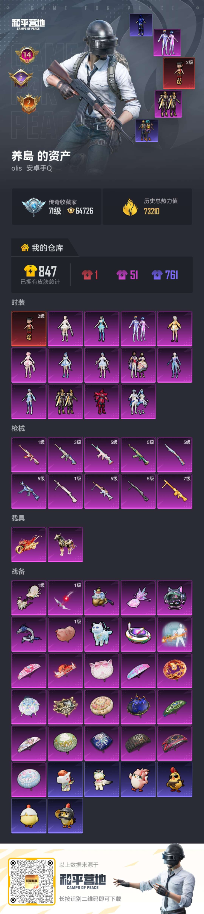 PX_2554424-2载具-159套装-214枪皮-1红装2稀有2载具13粉装10特效枪12热门159套装214枪皮,73210热力值,14印记,历史卓越王牌18星,【1红装】,魔童闹海-哪吒,(2级),【2稀有】,奇异狩猎者,都市猎人,【2载具】,黑曜夜骑,踏焰逐风摩托车,【13粉装】,冰魄,梦幻火箭,奇迹舞步美雪,奇迹舞步美琪,时空协奏·和音,千金淑猫,异瞳寒姬,未来歌姬,星穹咏叹调,冰域雷影,创世救赎,呆萌星弥,炙焰赤龙,【9特效枪】,SCAR-L-锦绣绵绵,(5级),M416-灵猫魔法师,(3级),AKM-绿萝繁花,(5级),Kar98K-巳巳如意,(5级),MG3-酷泡奶龙,(7级),MG-36-沧焰双生,(5级),DP-28-千金淑猫,(1级),DP-28-豹影疾电,(5级),UMP45-量子极限,(5级),【12热门】,Mark.06,小丑鱼,龟仙人,萌神柯基,鹰眼刺客,深海小丑鱼,TT战队服,暗影哥特,漫步者,破蛋小黄鸡,M762-奇异狩猎者,S686-奇异狩猎者,【1飞行器】,太空嘟嘟飞行器,【2头盔】,童趣迷兔头盔,甜心宝贝头盔,【1背包】,梦幻火箭背包,营地ID: