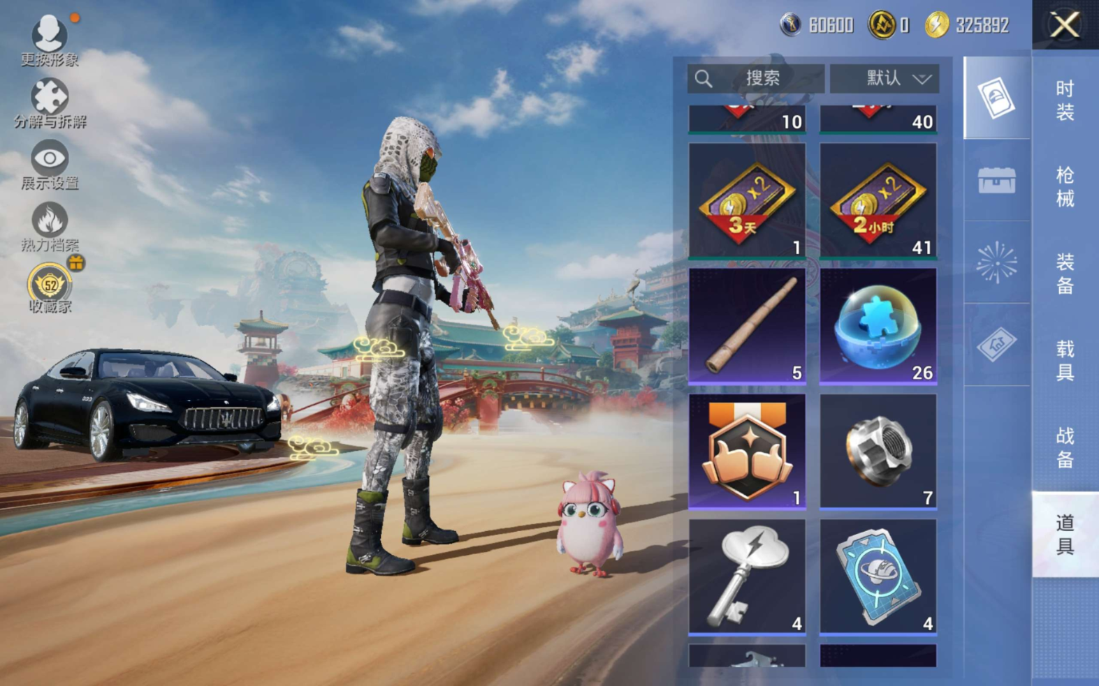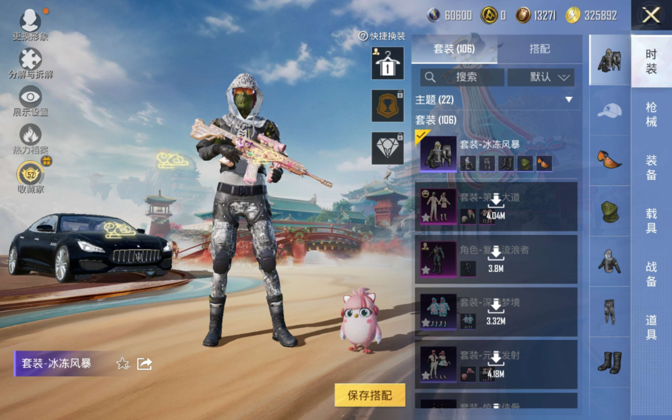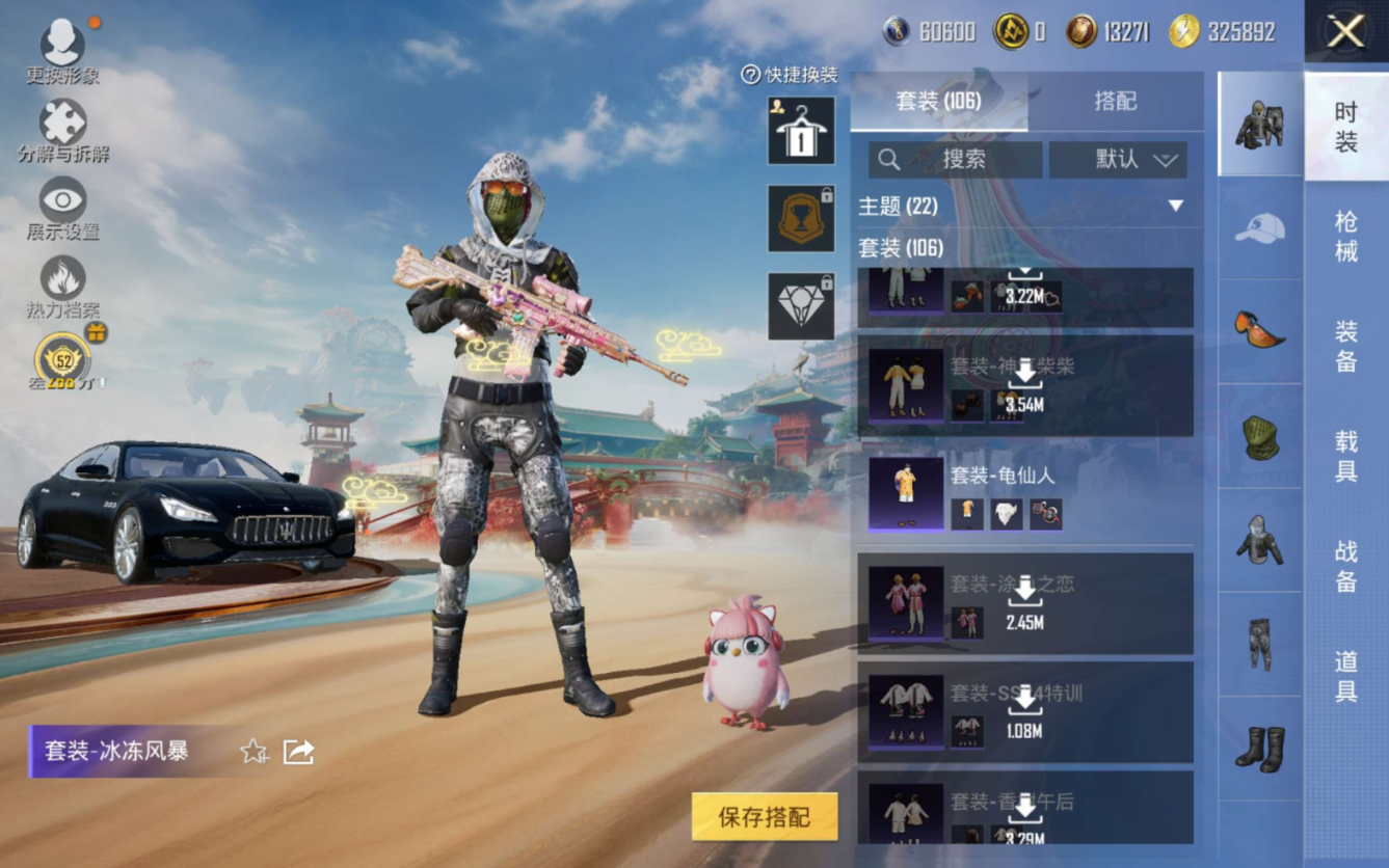PX_2554433-1载具-106套装-147枪皮-1载具2粉装5特效枪10热门106套装147枪皮,45203热力值,7印记,历史超级王牌9星,【1载具】,玛莎拉蒂Q蓝色,【2粉装】,第五大道,复仇流浪者,【5特效枪】,M416-心之恋语,(7级),Kar98K-巳巳如意,(5级),DP-28-豹影疾电,(5级),蜜獾-荧海星豚,(6级),Mk14-福马献瑞,(4级),【10热门】,小丑鱼,龟仙人,雪山精英,呆萌铁蟹,鹰眼刺客,深海小丑鱼,粉红小猪,漫步者,破蛋小黄鸡,弄潮海豚,【1头盔】,百万伏特头盔,【1背包】,深海小丑鱼背包,营地ID: