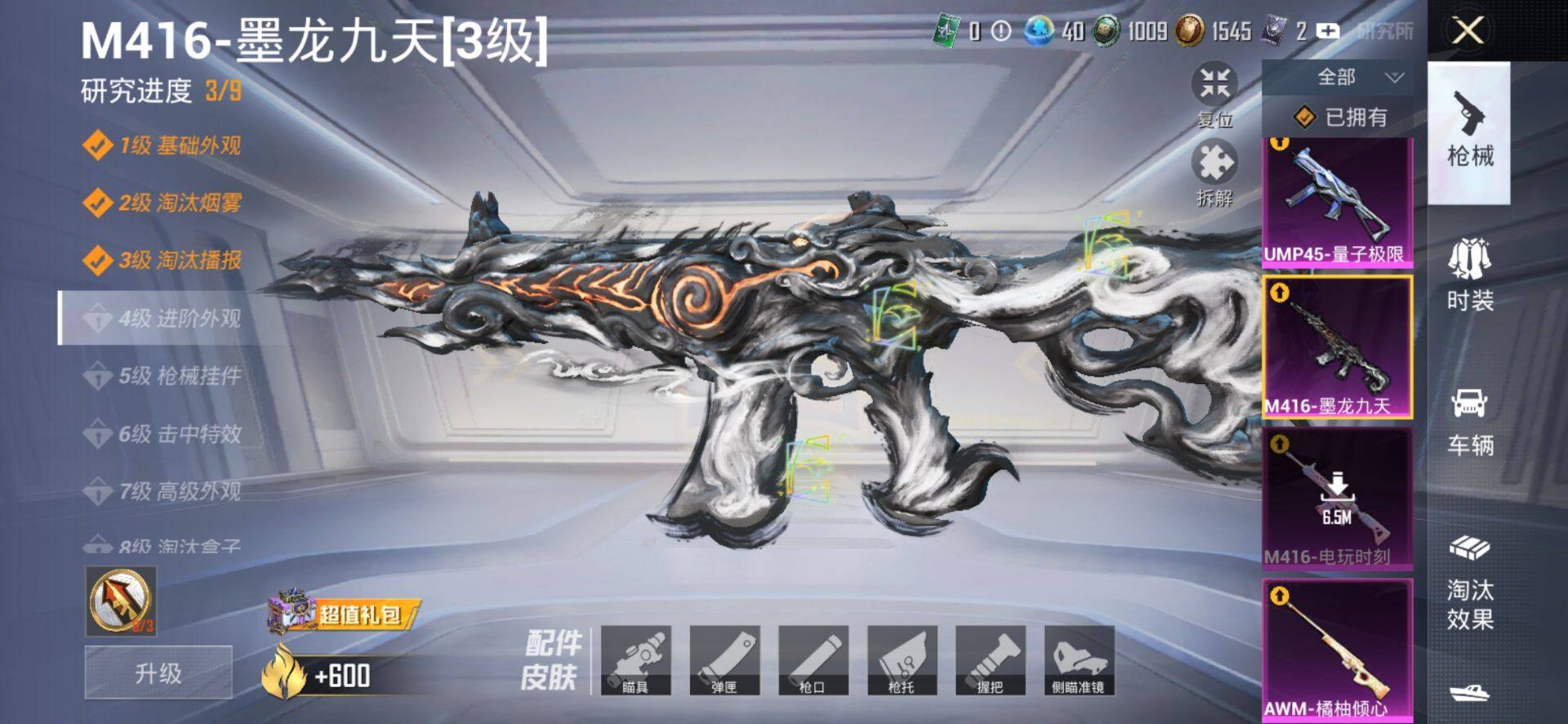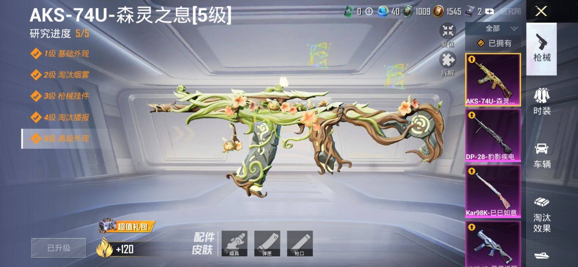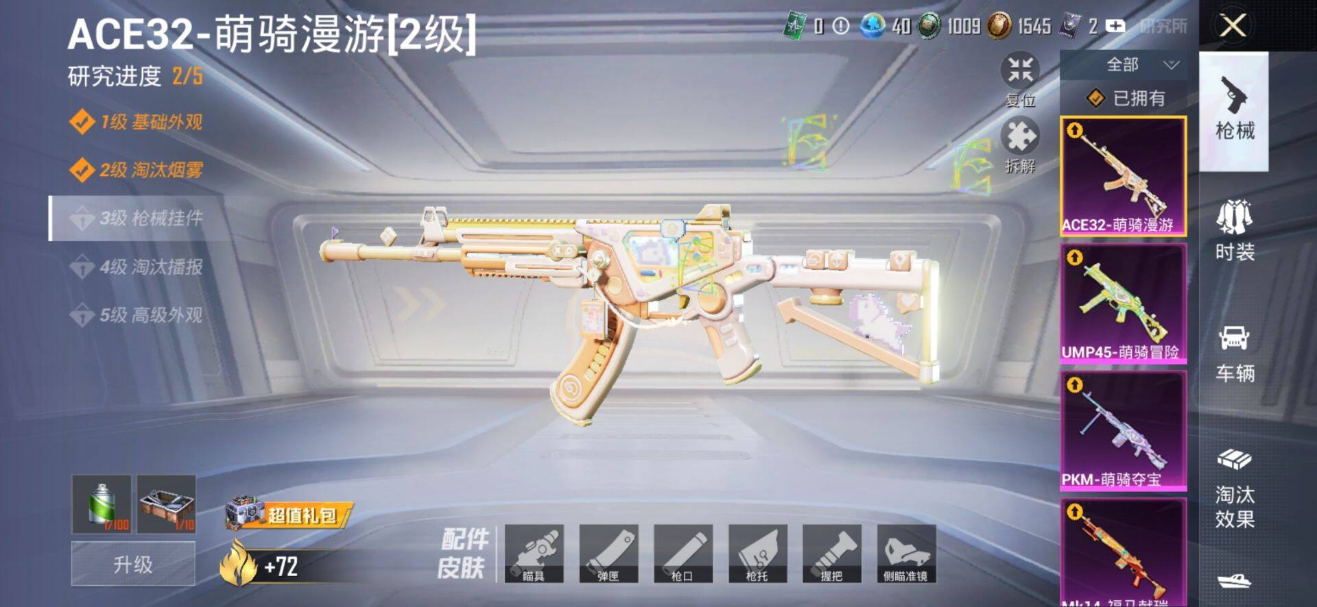 【粉色枪皮等级】:M416-电玩时刻(五级),M416-墨龙九天(三级),ACE32-萌骑漫游(二级),UMP45-量子极限(五级),UMP45-萌骑冒险(一级),AKS-74U-森灵之息(五级),Kar98K-巳巳如意(五级),AWM-橘柚倾心(七级),Mk14-福马献瑞(五级),DP-28-豹影疾电(五级),PKM-萌骑夺宝(一级)