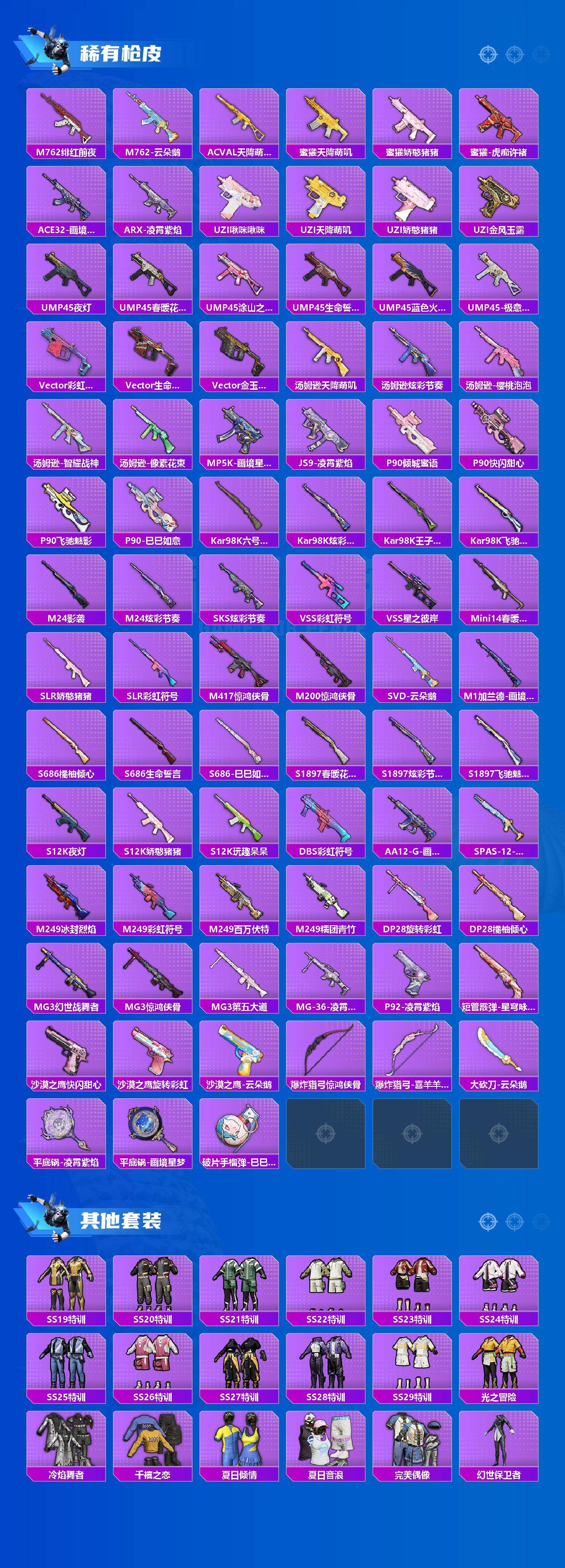 【稀有枪皮】:AUG-冰晶雪宝,AKM-彩虹符号,AKM-灼热熔岩,AKM-破晓战魂,AKM-龙的传人,AKM-极光猎影,M16A4-幻世战舞者,SCAR-L-夜灯,SCAR-L-炫彩节奏,SCAR-L-玉兔迎春,M416-糯团青竹,M416-红色方程式,M416-绯红前夜,M416-蓝色火焰,GROZA-彩虹符号,GROZA-春暖花开,AUG-天降萌叽,AUG-甜蜜菠萝,AUG-耀粉歌者,AUG-闲梦青缨,AUG-金蛇镇世,QBZ-彩虹符号,QBZ-飞驰魅影,M762-天降萌叽,M762-橘柚倾心,M762-绯红前夜,M762-云朵鹅,AC-VAL-天降萌叽,蜜獾-天降萌叽,蜜獾-娇憨猪猪,蜜獾-虎痴许褚,ACE32-画境星梦,ARX-凌霄紫焰,UZI-啾咪啾咪,UZI-天降萌叽,UZI-娇憨猪猪,UZI-金风玉露,UMP45-夜灯,UMP45-春暖花开,UMP45-涂山之恋,UMP45-生命誓言,UMP45-蓝色火焰,UMP45-极意拳锋,Vector-彩虹符号,Vector-生命誓言,Vector-金玉无双,汤姆逊-天降萌叽,汤姆逊-炫彩节奏,汤姆逊-樱桃泡泡,汤姆逊-像素花束,汤姆逊-智耀战神,MP5K-画境星梦,JS9-凌霄紫焰,P90-倾城蜜语,P90-快闪甜心,P90-飞驰魅影,P90-巳巳如意,Kar98K-六号树人,Kar98K-炫彩节奏,Kar98K-王子的夏天,Kar98K-飞驰魅影,M24-影袭,M24-炫彩节奏,SKS-炫彩节奏,VSS-彩虹符号,VSS-星之彼岸,Mini14-春暖花开,SLR-娇憨猪猪,SLR-彩虹符号,M417-惊鸿侠骨,M200-惊鸿侠骨,SVD-云朵鹅,M1加兰德-画境星梦,S686-橘柚倾心,S686-生命誓言,S686-巳巳如意,S1897-春暖花开,S1897-炫彩节奏,S1897-飞驰魅影,S12K-玩趣呆呆,S12K-夜灯,S12K-娇憨猪猪,DBS-彩虹符号,AA12-G-画境星梦,SPAS-12-云朵鹅,M249-冰封烈焰,M249-彩虹符号,M249-百万伏特,M249-糯团青竹,DP-28-旋转彩虹,DP-28-橘柚倾心,MG3-幻世战舞者,MG3-惊鸿侠骨,MG3-第五大道,MG-36-凌霄紫焰,P92-凌霄紫焰,短管霰弹-星穹咏叹调,沙漠之鹰-快闪甜心,沙漠之鹰-旋转彩虹,沙漠之鹰-云朵鹅,爆炸猎弓-惊鸿侠骨,爆炸猎弓-喜羊羊与灰太狼,大砍刀-云朵鹅,平底锅-凌霄紫焰,平底锅-画境星梦,破片手榴弹-巳巳如意