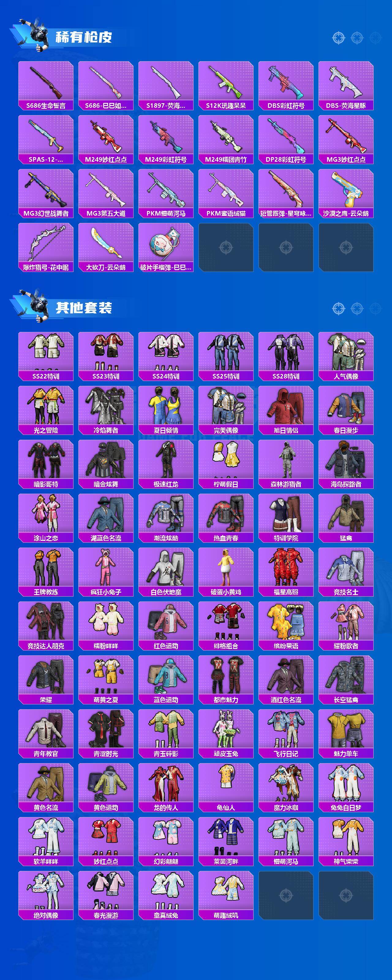 【稀有枪皮】:AKM-彩虹符号,AKM-破晓战魂,AKM-龙的传人,SCAR-L-夜灯,SCAR-L-炫彩节奏,M416-糯团青竹,GROZA-懵萌河马,GROZA-荧海星豚,AUG-天降萌叽,AUG-耀粉歌者,QBZ-彩虹符号,M762-天降萌叽,M762-萌物绒绒,M762-云朵鹅,Mk47-妙红点点,Mk47-虹云熊熊,G36C-懵萌河马,G36C-星穹咏叹调,AC-VAL-天降萌叽,蜜獾-天降萌叽,UMP45-生命誓言,UMP45-绒宝小鹅,Vector-生命誓言,Vector-音爆索尼克,汤姆逊-天降萌叽,汤姆逊-炫彩节奏,汤姆逊-像素花束,P90-快闪甜心,P90-甜蜜旋律,Kar98K-六号树人,AWM-胡桃卫兵,SKS-炫彩节奏,SKS-折梦之诗,VSS-绿野极光,Mini14-涂山之恋,SLR-彩虹符号,莫辛纳甘-懵萌河马,AMR-妙红点点,M417-虹云熊熊,MK20-H-莲影清波,MK20-H-绶带小兔,SVD-云朵鹅,S686-生命誓言,S686-巳巳如意,S1897-荧海星豚,S12K-玩趣呆呆,DBS-彩虹符号,DBS-荧海星豚,SPAS-12-云朵鹅,M249-妙红点点,M249-彩虹符号,M249-糯团青竹,DP-28-彩虹符号,MG3-妙红点点,MG3-幻世战舞者,MG3-第五大道,PKM-蜜语绒猫,PKM-懵萌河马,短管霰弹-星穹咏叹调,沙漠之鹰-云朵鹅,爆炸猎弓-花中眠,大砍刀-云朵鹅,破片手榴弹-巳巳如意
