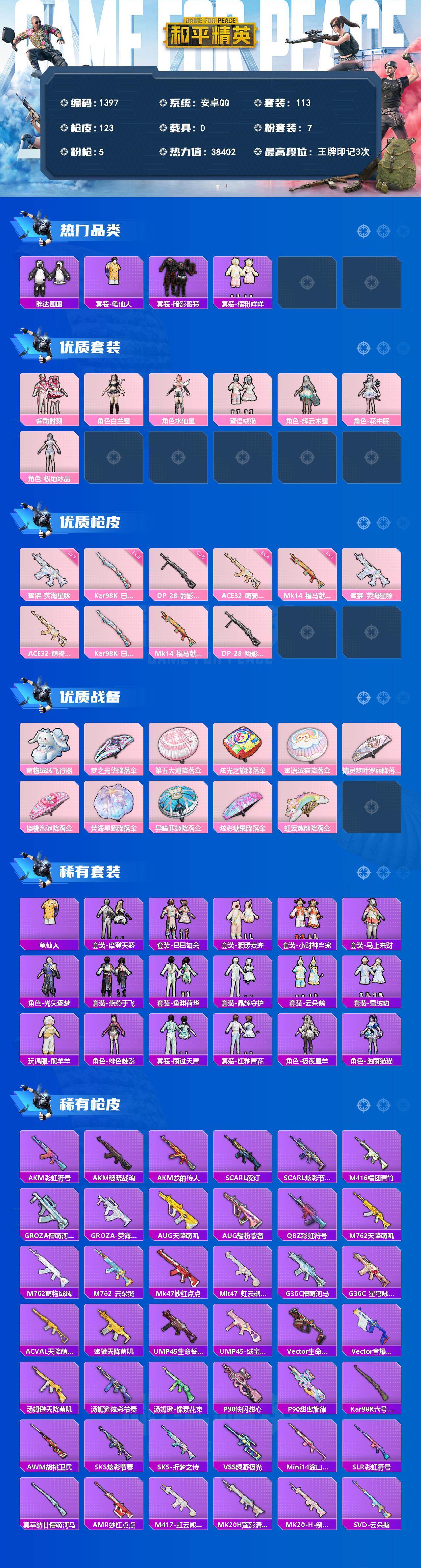 PX_2554603-【7粉装5粉枪,蜜獾-荧海星豚(七级),粉装-蜜语绒猫,暗影哥特,,糯粉咩咩,花中眠,极地冰晶】安卓,手Q-7粉装-5特效枪-0载具-1粉色飞行器-38402热力值-3王牌印记-113套装-123枪皮