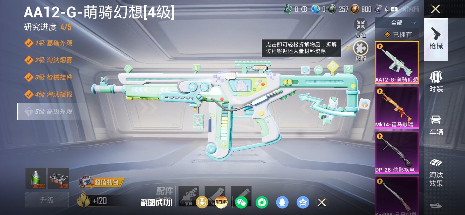 【4特效枪】,Kar98K-巳巳如意,(1级),DP-28-豹影疾电,(1级),Mk14-福马献瑞,(4级),AA12-G-萌骑幻想,(4级),