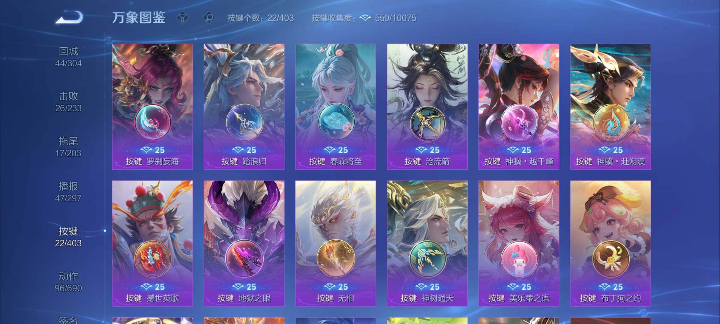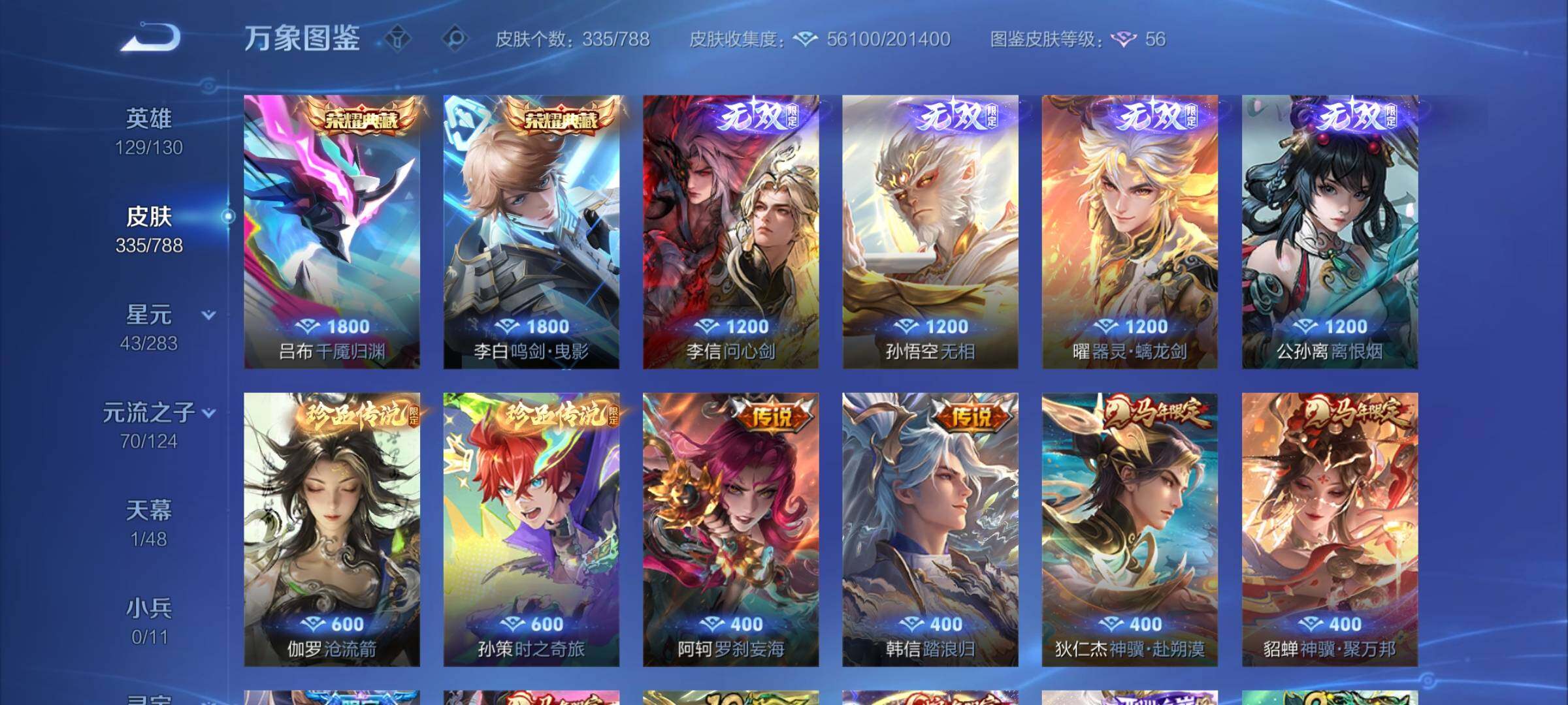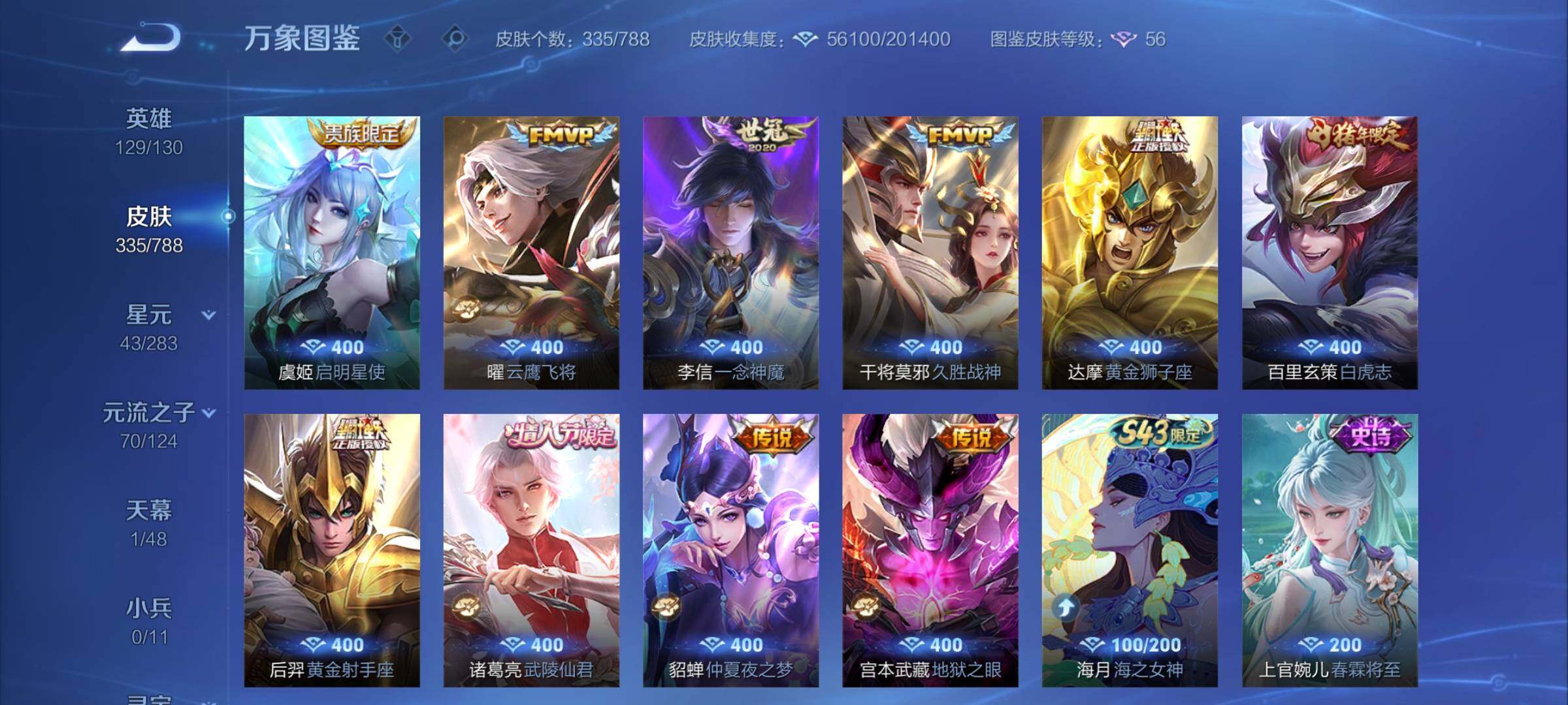 【史诗皮肤】:上官婉儿春霖将至,钟馗锁墨魂,明世隐百晓客,盘古撼世英歌,周瑜线条小狗,小乔线条小狗,项羽九幽镇关,女娲万灵启世,公孙离涂山容容,后羿石田雨龙,狂铁龙之律动,阿轲化蝶舞,赵怀真器灵浮梦炉,牛魔星界战将,亚连破空之剑,暃埋骨钱,蒙犽顽岩魄,百里玄策超元猎域,姬小满妄想食味,蒙恬荣光圣徽,阿古朵江河有灵,刘备百相守梦,盘古冰霜神祇,马可波罗山海玄木吟,暃星界游侠,梦奇顽趣,元歌无心,鬼谷子五谷丰年,狂铁电玩高手,高渐离天秀音浪,韩信傲雪梅枪,雅典娜黎明之约,老夫子航海奇遇记,花木兰默契交锋,芈月白晶晶,云中君纤云弄巧,裴擒虎李小龙,百里玄策原初追逐者,马可波罗暗影游猎,孙尚香时之恋人,赵云龙胆,马超神威,橘右京修罗,阿轲迷踪丽影,大乔白蛇,娜可露露晚萤,李元芳银河之约,蔡文姬繁星吟游,上官婉儿梁祝,狄仁杰鹰眼统帅,伽罗箭羽风息,大乔猫狗日记,嬴政白昼王子,阿轲节奏热浪,白起星夜王子,程咬金功夫厨神,李元芳逐浪之夏,刘禅天才门将,蔡文姬舞动绿茵,铠曙光守护者,百里守约特工魅影,安琪拉心灵骇客,雅典娜冰冠公主,亚瑟心灵战警,诸葛亮黄金分割率,兰陵王暗隐猎兽者,小乔缤纷独角兽,夏侯惇乘风破浪,刘邦德古拉伯爵,花木兰水晶猎龙者,孙悟空至尊宝,关羽冰锋战神,韩信白龙吟,张飞乱世虎臣,吕布末日机甲,李白千年之狐,曹操幽灵船长,刘禅绅士熊喵,吕布圣诞狂欢,墨子金属风暴,妲己女仆咖啡,妲己魅力维加斯,嬴政优雅恋人,孙尚香水果甜心,宫本武藏鬼剑武藏,廉颇地狱岩魂,狄仁杰魔术师,王昭君偶像歌手,甄姬冰雪圆舞曲,貂蝉圣诞恋歌,赵云未来纪元,赵云皇家上将,露娜紫霞仙子,项羽苍穹之光