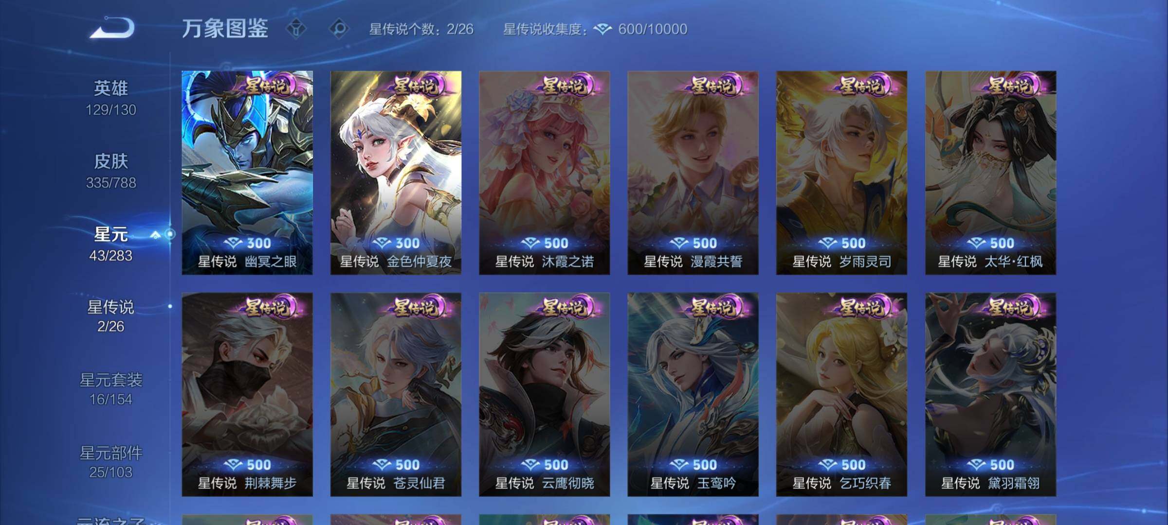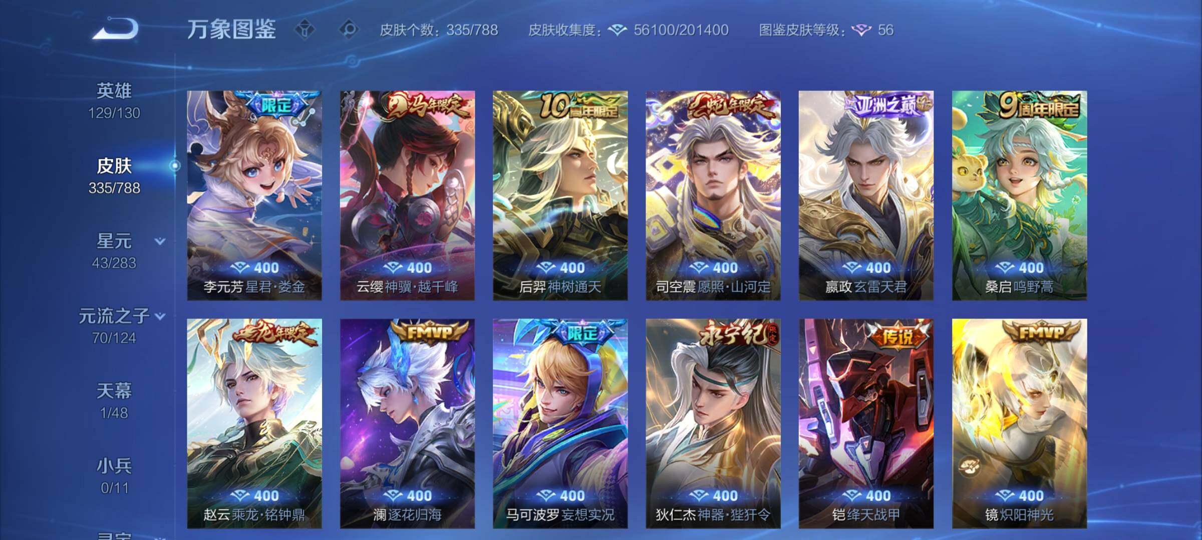 【限定皮肤】:公孙离离恨烟,暃埋骨钱,蒙犽顽岩魄,姜子牙天穹之誓,狄仁杰阴阳师,赵云皇家上将,赵云龙胆,墨子神迹守卫,嬴政优雅恋人,嬴政白昼王子,阿轲迷踪丽影,芈月白晶晶,周瑜赤莲之焰,元歌无心,夏侯惇朔风刀,典韦穷奇,马可波罗暗影游猎,马可波罗山海玄木吟,马可波罗妄想实况,狄仁杰魔术师,狄仁杰万华元夜,狄仁杰神器狴犴令,达摩沙漠行僧,项羽海滩派对,老夫子醍醐杖,老夫子航海奇遇记,关羽冰锋战神,程咬金演武夺筹,刘邦夺宝奇兵,韩信傲雪梅枪,王昭君午后时光,兰陵王金庭之子,花木兰默契交锋,孙悟空至尊宝,牛魔御旌,刘备百相守梦,李元芳银河之约,李元芳云中旅人,虞姬启明星使,钟馗驱傩正仪,雅典娜黎明之约,蔡文姬繁星吟游,鬼谷子原初探秘者,鬼谷子五谷丰年,诸葛亮武陵仙君,苏烈千军破阵,百里玄策白虎志,百里玄策原初追逐者,弈星混沌棋,梦奇顽趣,沈梦溪星空之诺,沈梦溪大漠名商,明世隐疑决卦,裴擒虎李小龙,裴擒虎擒涛扼浪,狂铁电玩高手,米莱狄御霄,云中君纤云弄巧,盾山御銮,猪八戒西部大镖客,上官婉儿梁祝,嫦娥暖冬兔眠,鲁班大师探海日志,盘古冰霜神祇,桑启海盐诗旅,暃星界游侠,艾琳女武神,阿古朵江河有灵,张良古海寻踪,蒙恬荣光圣徽,鬼谷子天穹祈灯,姬小满妄想食味,赵云乘龙铭钟鼎,百里玄策超元猎域,沈梦溪龙舞盛年,刘邦剑破天穹,周瑜熔金海岸