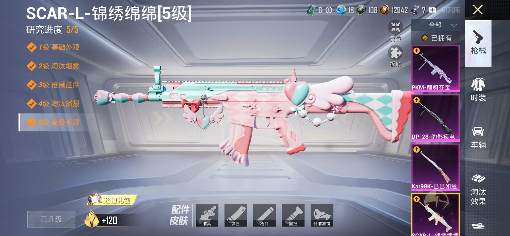 【4特效枪】,SCAR-L-锦绣绵绵,(5级),Kar98K-巳巳如意,(5级),DP-28-豹影疾电,(5级),PKM-萌骑夺宝,(5级),