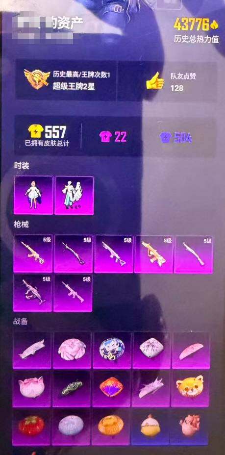 PX_2555125-时装数:,433,枪械数:,160,战备数:,104,热门装扮:,梦魇先生,洛天依,金丰海韵,稀有枪皮:,M416-电玩时刻(五级),GROZA-镜光银凌(五级),AUG-暖羊咩咩(五级),ACE32-萌骑漫游(五级),Kar98K-巳巳如意(五级),Mk14-甜梦熊击(五级),DP-28-豹影疾电(五级)