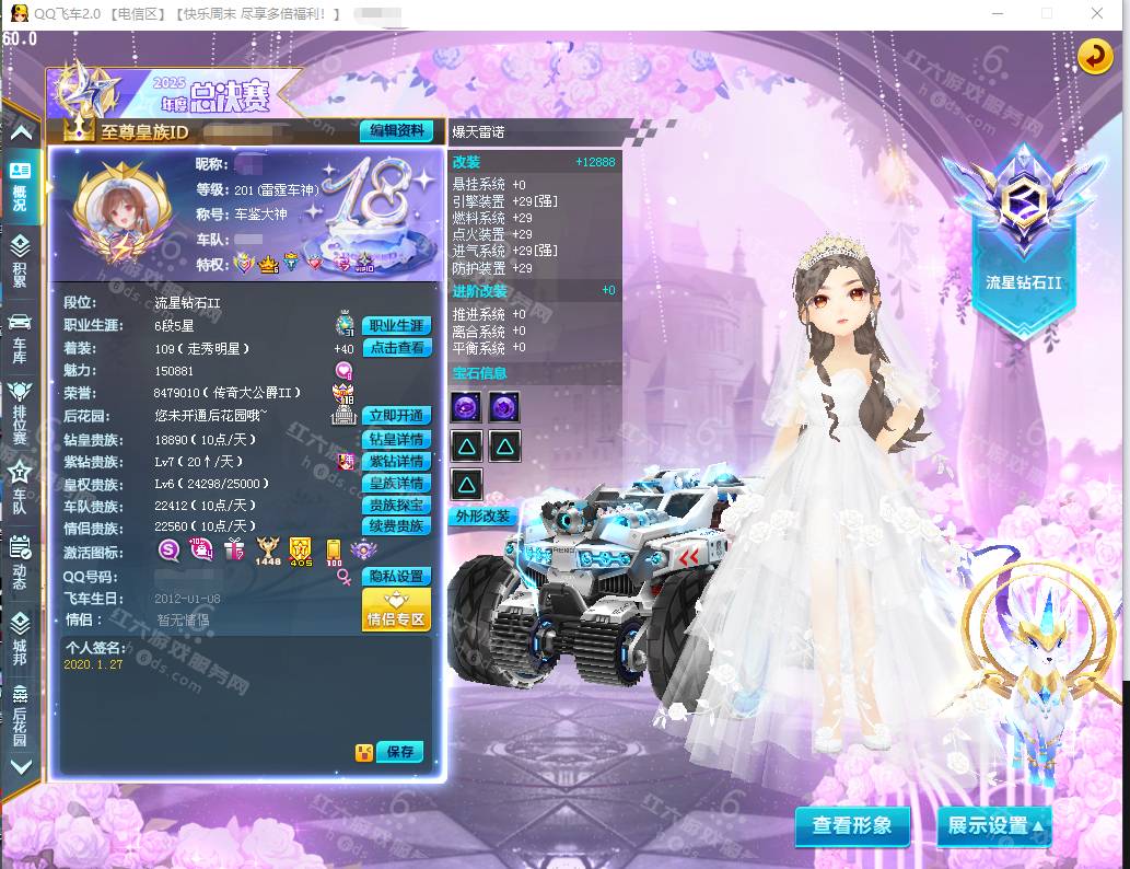 DS5058,红六更号裙777584596【电信一区】魅力7774,荣誉756w,紫钻4级,S车:双四众神天后/羞花+29,10A车:双四天数雷诺/幻夜2阶/幻梦+29,2骑宠:小兰仙+10,2坐骑,套装女37页:微光幻蝶,套装男17页:微光幻蝶/金玉良缘发饰,夺宝能量808,夺宝券104,至尊夺宝券26,至尊夺宝积分620,1320R,