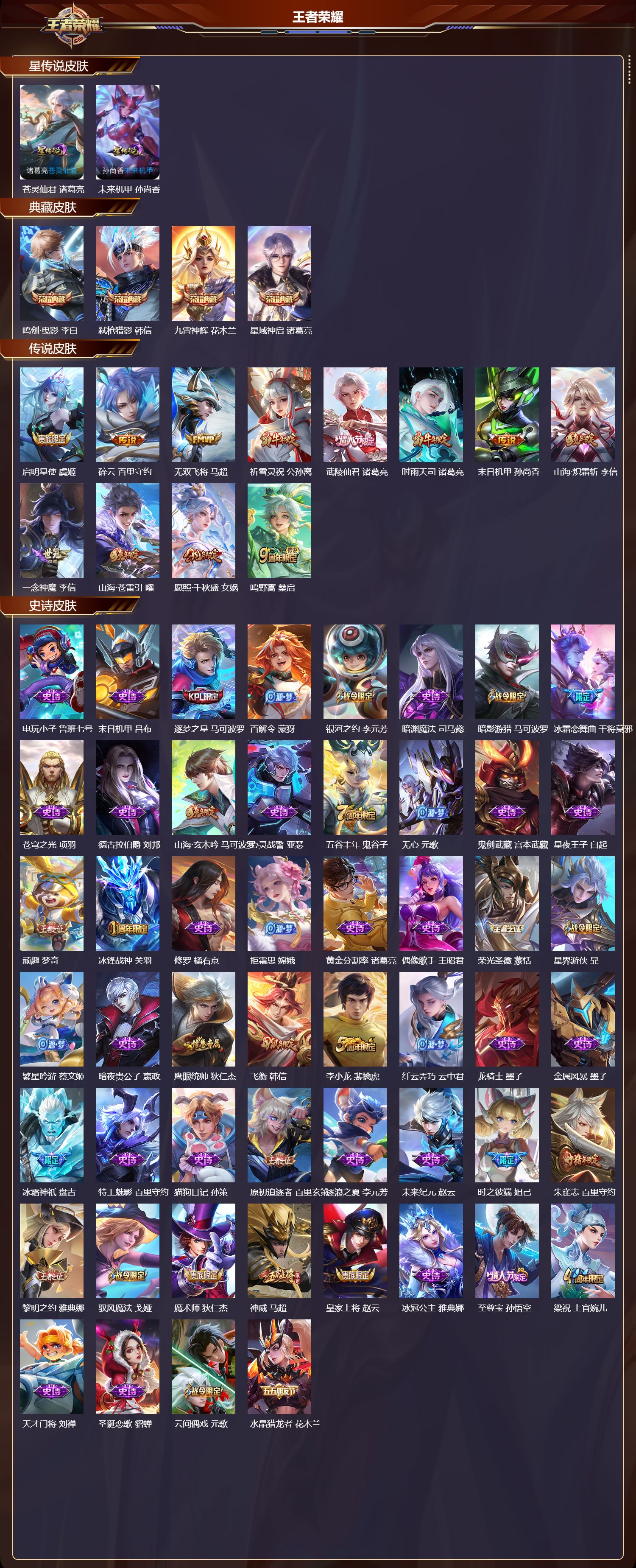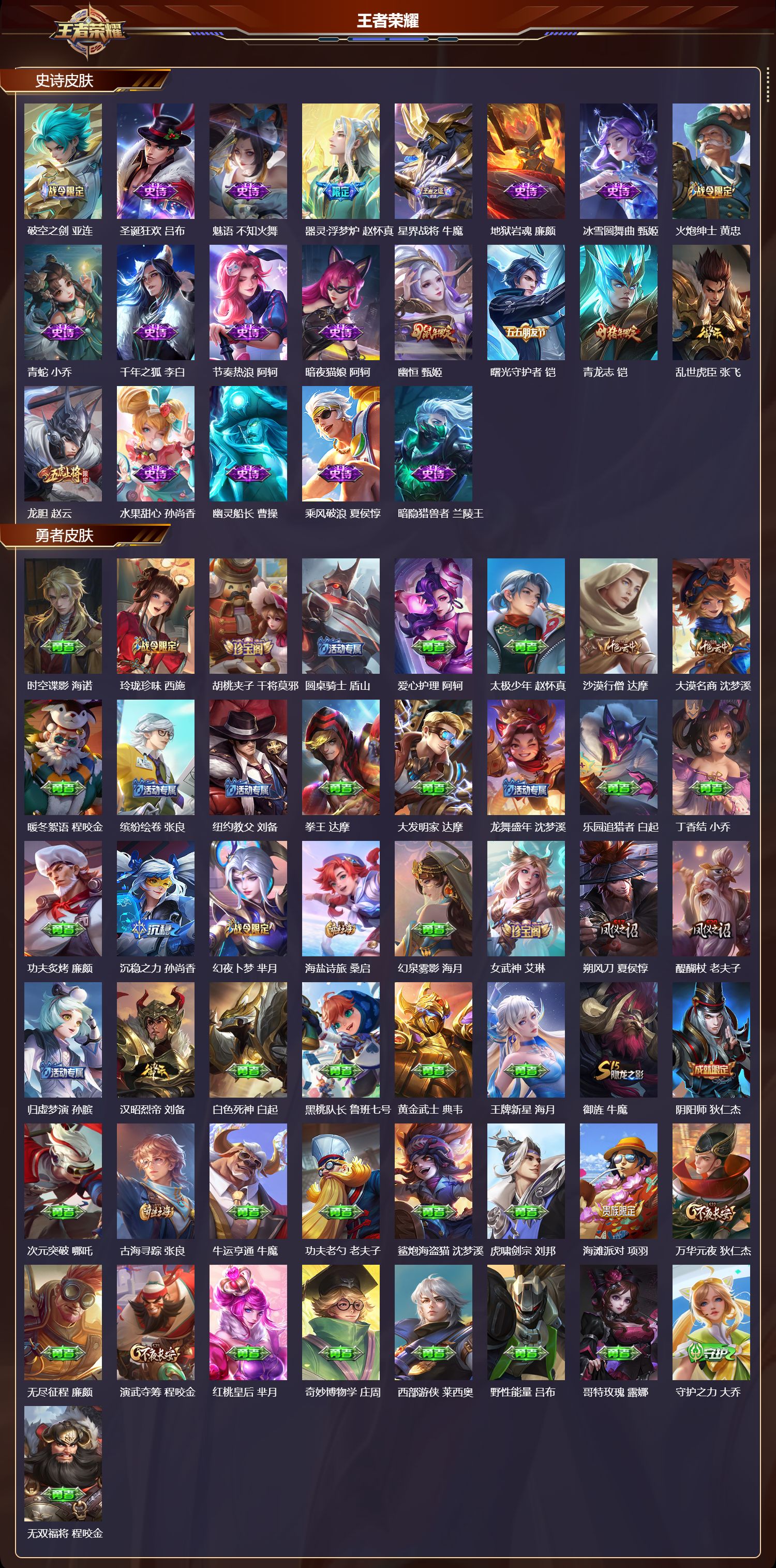 【73,史诗皮肤】,电玩小子,鲁班七号,末日机甲,吕布,逐梦之星,马可波罗,百解令,蒙犽,银河之约,李元芳,暗渊魔法,司马懿,暗影游猎,马可波罗,冰霜恋舞曲,干将莫邪,苍穹之光,项羽,德古拉伯爵,刘邦,山海·玄木吟,马可波罗,心灵战警,亚瑟,五谷丰年,鬼谷子,无心,元歌,鬼剑武藏,宫本武藏,星夜王子,白起,顽趣,梦奇,冰锋战神,关羽,修罗,橘右京,拒霜思,嫦娥,黄金分割率,诸葛亮,偶像歌手,王昭君,荣光圣徽,蒙恬,星界游侠,暃,繁星吟游,蔡文姬,暗夜贵公子,嬴政,鹰眼统帅,狄仁杰,飞衡,韩信,李小龙,裴擒虎,纤云弄巧,云中君,龙骑士,墨子,金属风暴,墨子,冰霜神祇,盘古,特工魅影,百里守约,猫狗日记,孙策,原初追逐者,百里玄策,逐浪之夏,李元芳,未来纪元,赵云,时之彼端,妲己,朱雀志,百里守约,黎明之约,雅典娜,驭风魔法,戈娅,魔术师,狄仁杰,神威,马超,皇家上将,赵云,冰冠公主,雅典娜,至尊宝,孙悟空,梁祝,上官婉儿,天才门将,刘禅,圣诞恋歌,貂蝉,云间偶戏,元歌,水晶猎龙者,花木兰,破空之剑,亚连,圣诞狂欢,吕布,魅语,不知火舞,器灵·浮梦炉,赵怀真,星界战将,牛魔,地狱岩魂,廉颇,冰雪圆舞曲,甄姬,火炮绅士,黄忠,青蛇,小乔,千年之狐,李白,节奏热浪,阿轲,暗夜猫娘,阿轲,幽恒,甄姬,曙光守护者,铠,青龙志,铠,乱世虎臣,张飞,龙胆,赵云,水果甜心,孙尚香,幽灵船长,曹操,乘风破浪,夏侯惇,暗隐猎兽者,兰陵王,