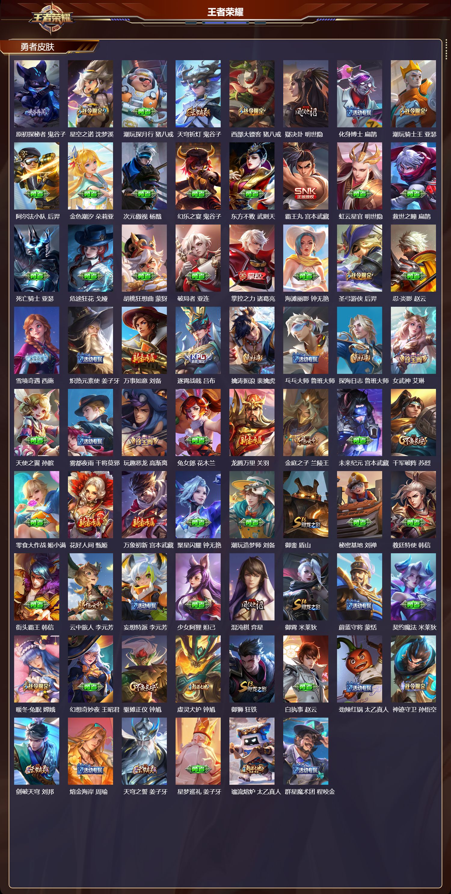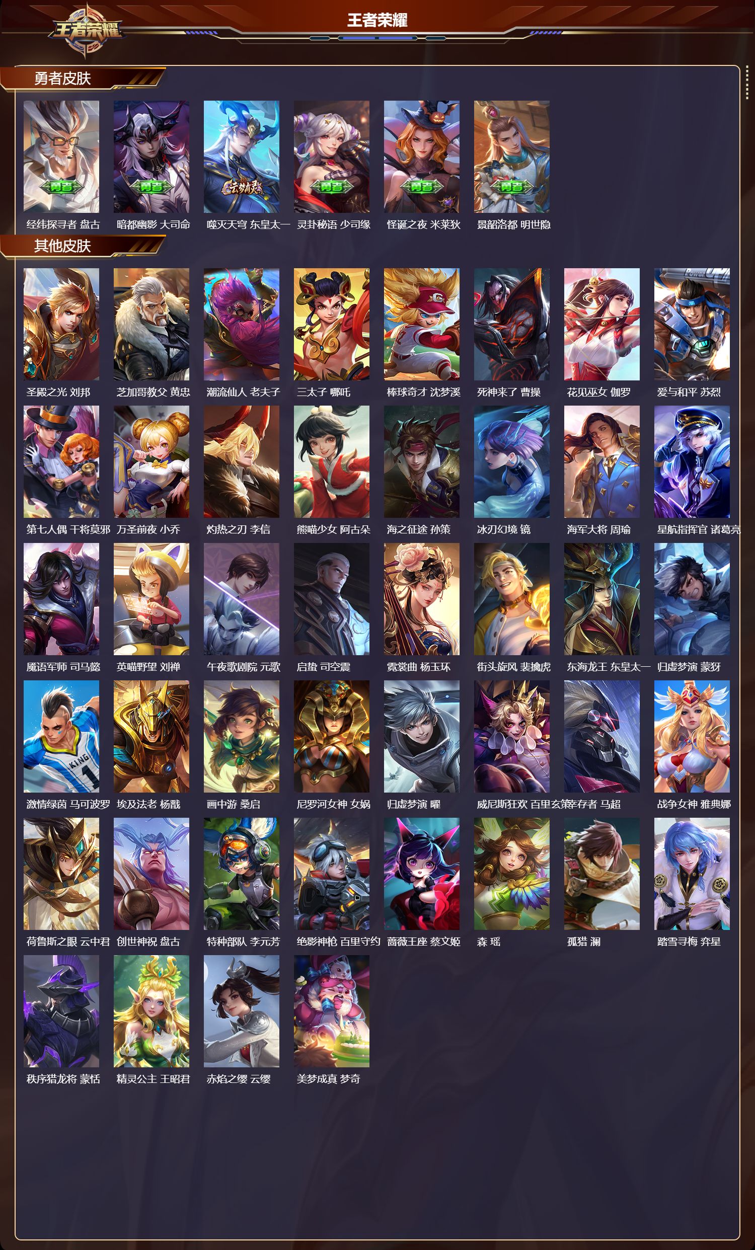 【124,勇者皮肤】,时空谍影,海诺,玲珑珍味,西施,胡桃夹子,干将莫邪,圆桌骑士,盾山,爱心护理,阿轲,太极少年,赵怀真,沙漠行僧,达摩,大漠名商,沈梦溪,暖冬絮语,程咬金,缤纷绘卷,张良,纽约教父,刘备,拳王,达摩,大发明家,达摩,龙舞盛年,沈梦溪,乐园追猎者,白起,丁香结,小乔,功夫炙烤,廉颇,沉稳之力,孙尚香,幻夜卜梦,芈月,海盐诗旅,桑启,幻泉雾影,海月,朔风刀,夏侯惇,醍醐杖,老夫子,归虚梦演,孙膑,汉昭烈帝,刘备,白色死神,白起,黑桃队长,鲁班七号,黄金武士,典韦,王牌新星,海月,御旌,牛魔,阴阳师,狄仁杰,次元突破,哪吒,古海寻踪,张良,牛运亨通,牛魔,功夫老勺,老夫子,鲨炮海盗猫,沈梦溪,虎啸剑宗,刘邦,海滩派对,项羽,万华元夜,狄仁杰,无尽征程,廉颇,演武夺筹,程咬金,红桃皇后,芈月,奇妙博物学,庄周,西部游侠,莱西奥,野性能量,吕布,哥特玫瑰,露娜,守护之力,大乔,无双福将,程咬金,原初探秘者,鬼谷子,星空之诺,沈梦溪,潮玩探月行,猪八戒,天穹祈灯,鬼谷子,西部大镖客,猪八戒,疑决卦,明世隐,化身博士,扁鹊,潮玩骑士王,亚瑟,阿尔法小队,后羿,金色潮汐,朵莉亚,次元傲视,杨戬,幻乐之宴,鬼谷子,东方不败,武则天,霸王丸,宫本武藏,虹云星官,明世隐,救世之瞳,扁鹊,死亡骑士,亚瑟,危途狂花,戈娅,胡桃狂想曲,蒙犽,破局者,亚连,掌控之力,诸葛亮,海滩丽影,钟无艳,圣弓游侠,后羿,忍·炎影,赵云,雪境奇遇,西施,炽热元素使,姜子牙,万事如意,刘备,逐霄战戟,吕布,擒涛扼浪,裴擒虎,乓乓大师,鲁班大师,探海日志,鲁班大师,女武神,艾琳,天使之翼,孙膑,雾都夜雨,干将莫邪,玩趣恶龙,高渐离,兔女郎,花木兰,龙腾万里,关羽,金庭之子,兰陵王,未来纪元,宫本武藏,千军破阵,苏烈,零食大作战,姬小满,花好人间,甄姬,万象初新,宫本武藏,聚星闪耀,钟无艳,潮玩造梦师,刘备,御銮,盾山,秘密基地,刘禅,教廷特使,韩信,街头霸王,韩信,云中旅人,李元芳,妄想特派,李元芳,少女阿狸,妲己,混沌棋,弈星,御霄,米莱狄,蔚蓝守将,蒙恬,契约魔法,米莱狄,暖冬·兔眠,嫦娥,幻想奇妙夜,王昭君,驱傩正仪,钟馗,虚灵犬护,钟馗,御狮,狂铁,白执事,赵云,劲辣红锅,太乙真人,神迹守卫,孙悟空,剑破天穹,刘邦,熔金海岸,周瑜,天穹之誓,姜子牙,星梦巡礼,姜子牙,谧流熔炉,太乙真人,群星魔术团,程咬金,经纬探寻者,盘古,暗都幽影,大司命,噬灭天穹,东皇太一,灵卦秘语,少司缘,怪诞之夜,米莱狄,景韶洛都,明世隐,