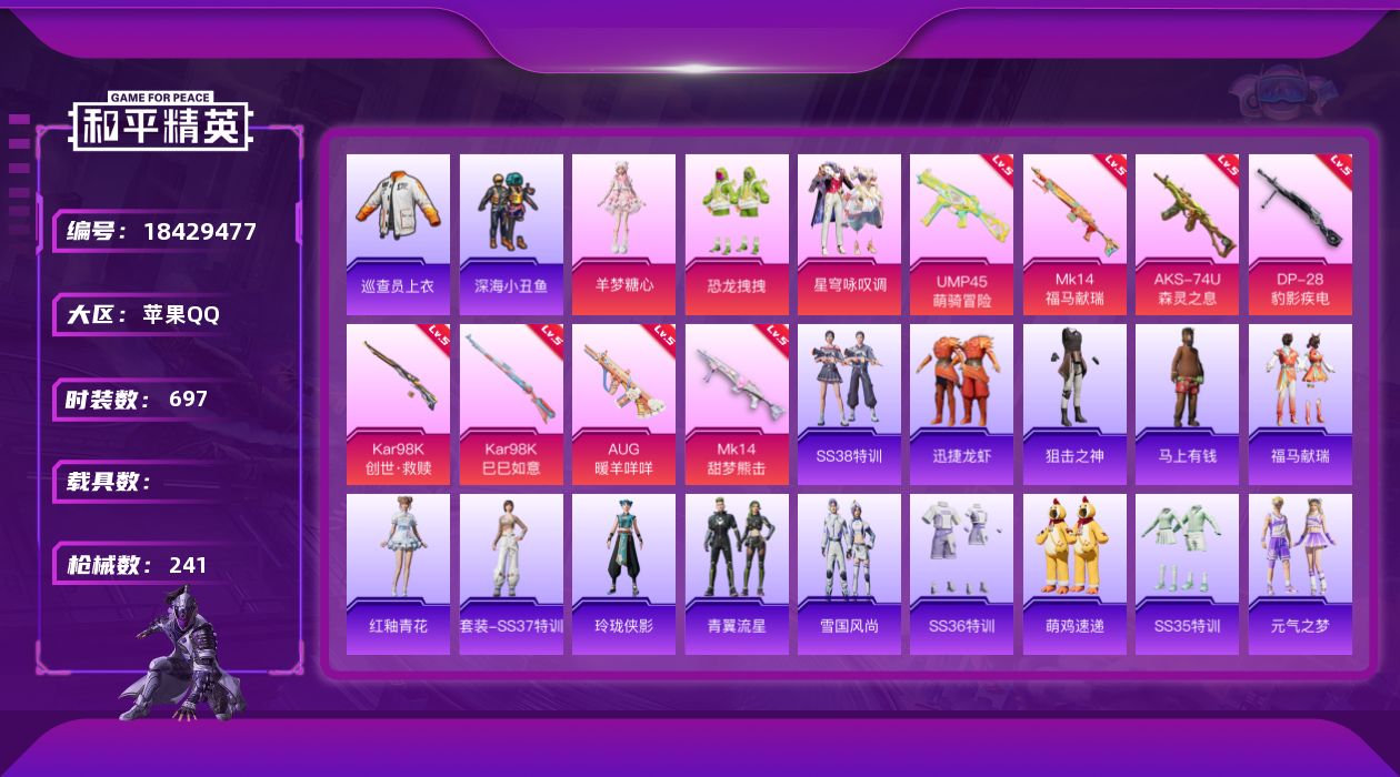 PX_2555343-实名:,可修改,时装数:,697,枪械数:,241,战备数:,192,热门装扮:,呆萌铁蟹,深海小丑鱼,梦魇先生,迅捷狂鲨,鹰眼刺客,巡查员衣服,恐龙拽拽,星穹咏叹调,羊梦糖心,稀有枪皮:,Kar98K创世·救赎,Kar98K-巳巳如意,AUG-暖羊咩咩,MK14-甜梦熊击,DP-28-豹影疾电,AKS-74U-森灵之息,UMP45-萌骑冒险
