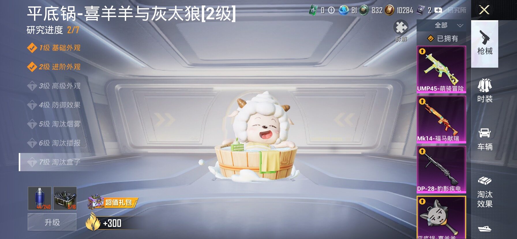 【6特效枪】,Kar98K-巳巳如意,(5级),MG-36-幻彩电音,(5级),DP-28-豹影疾电,(5级),Mk14-福马献瑞,(5级),UMP45-萌骑冒险,(5级),平底锅-喜羊羊与灰太狼,(2级),