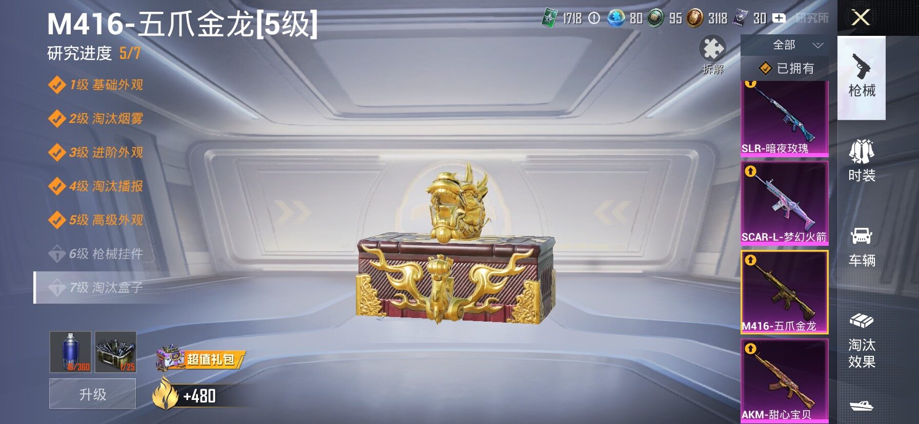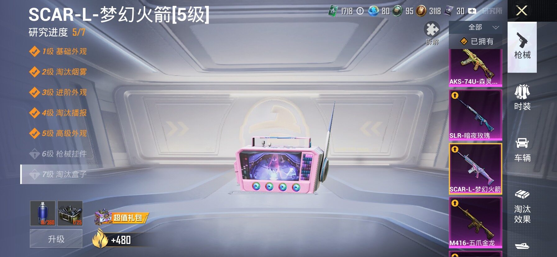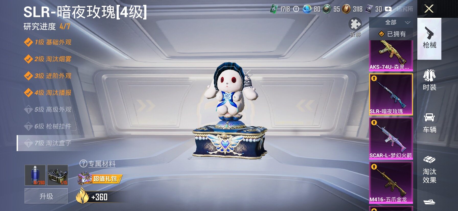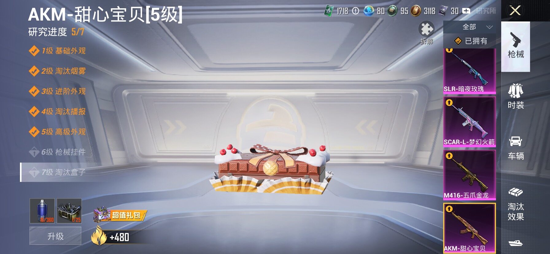【9特效枪】,SCAR-L-梦幻火箭,(5级),M416-五爪金龙,(5级),AKM-甜心宝贝,(5级),AKS-74U-森灵之息,(4级),SLR-暗夜玫瑰,(4级),Mk14-福马献瑞,(5级),AA12-G-萌骑幻想,(1级),PKM-萌骑夺宝,(1级),ACE32-萌骑漫游,(4级),