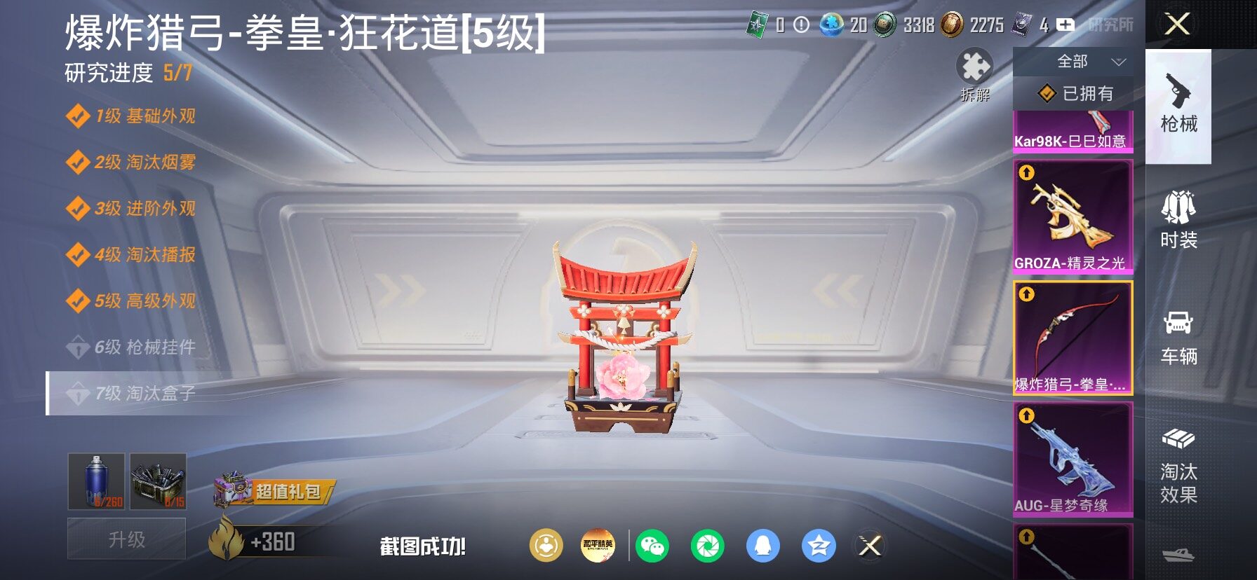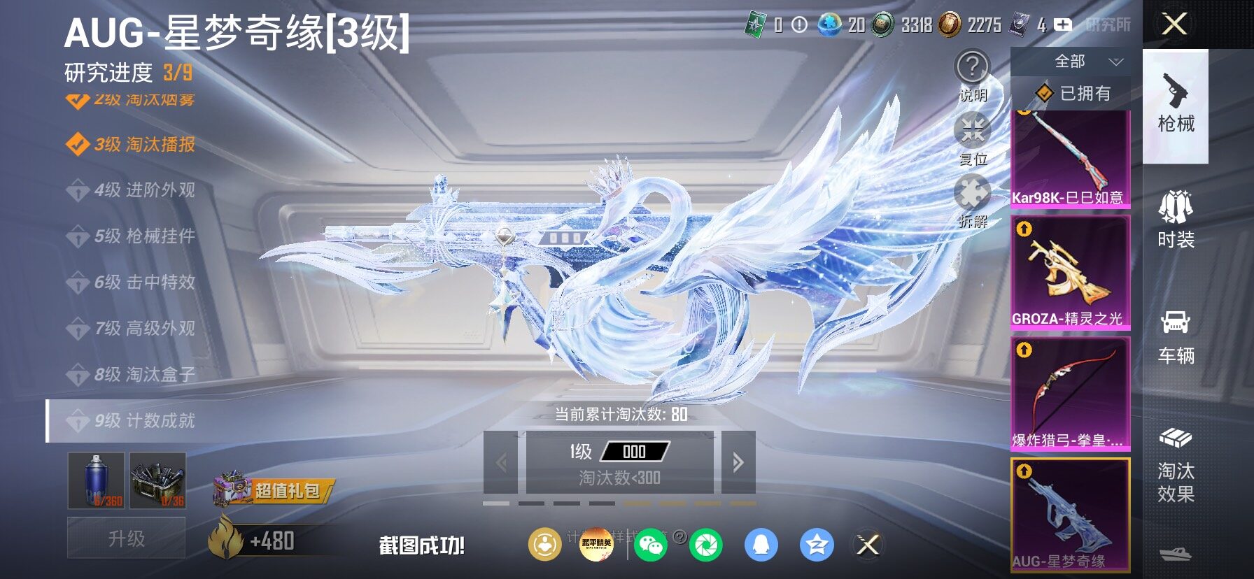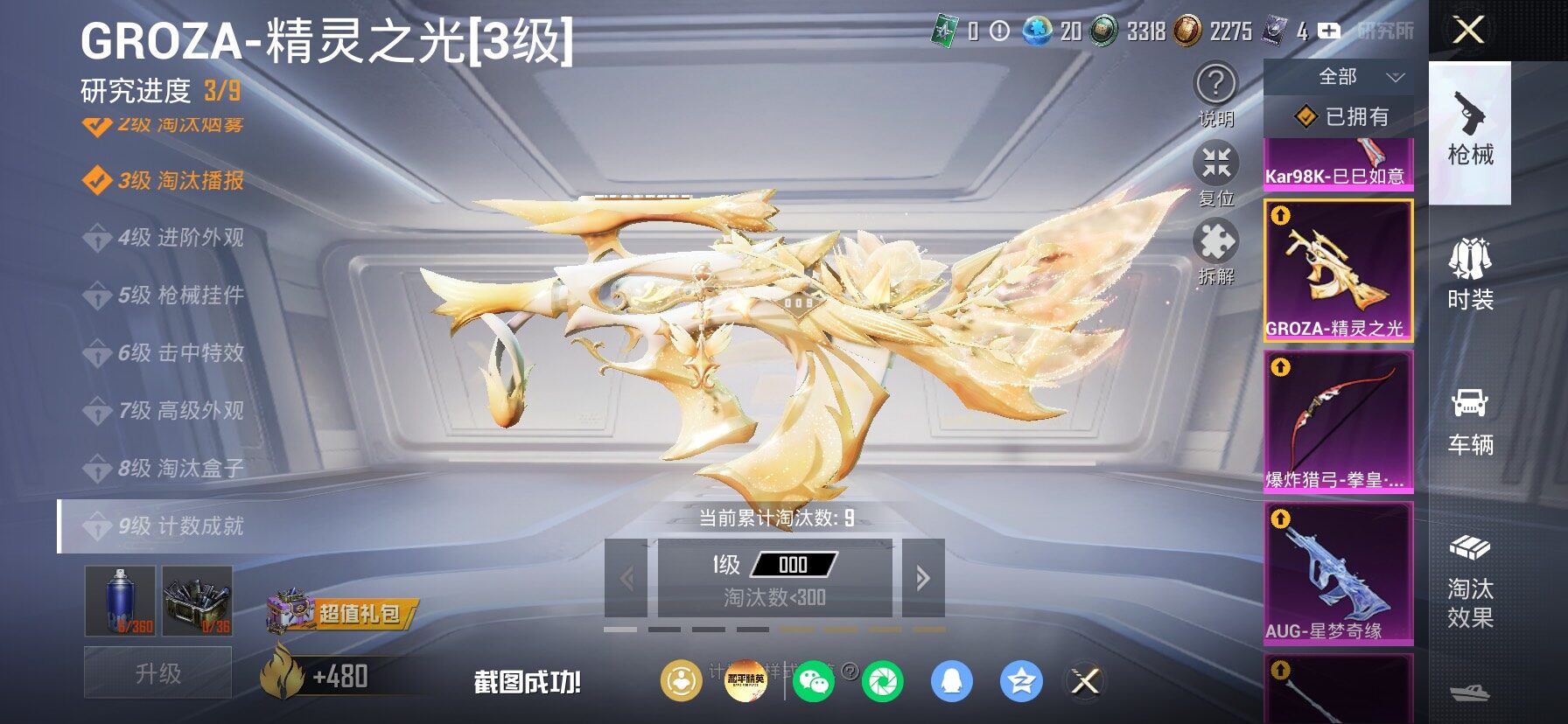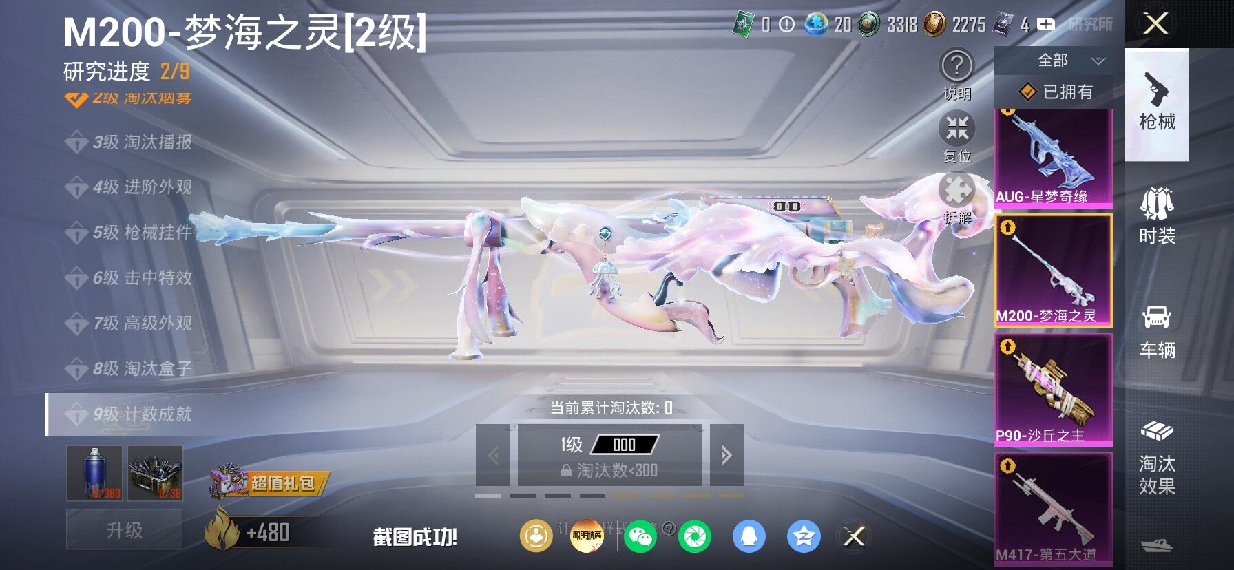 【13特效枪】,SCAR-L-纯梦嫁纱,(7级),P90-冷漠罗丽,(7级),P90-沙丘之主,(1级),Kar98K-巳巳如意,(5级),DP-28-豹影疾电,(5级),AUG-星梦奇缘,(3级),M200-梦海之灵,(2级),GROZA-精灵之光,(3级),M417-第五大道,(6级),M249-彩虹甜喵,(5级),信号枪-金乌曜日,(2级),Mk14-福马献瑞,(5级),爆炸猎弓-拳皇·狂花道,(5级),