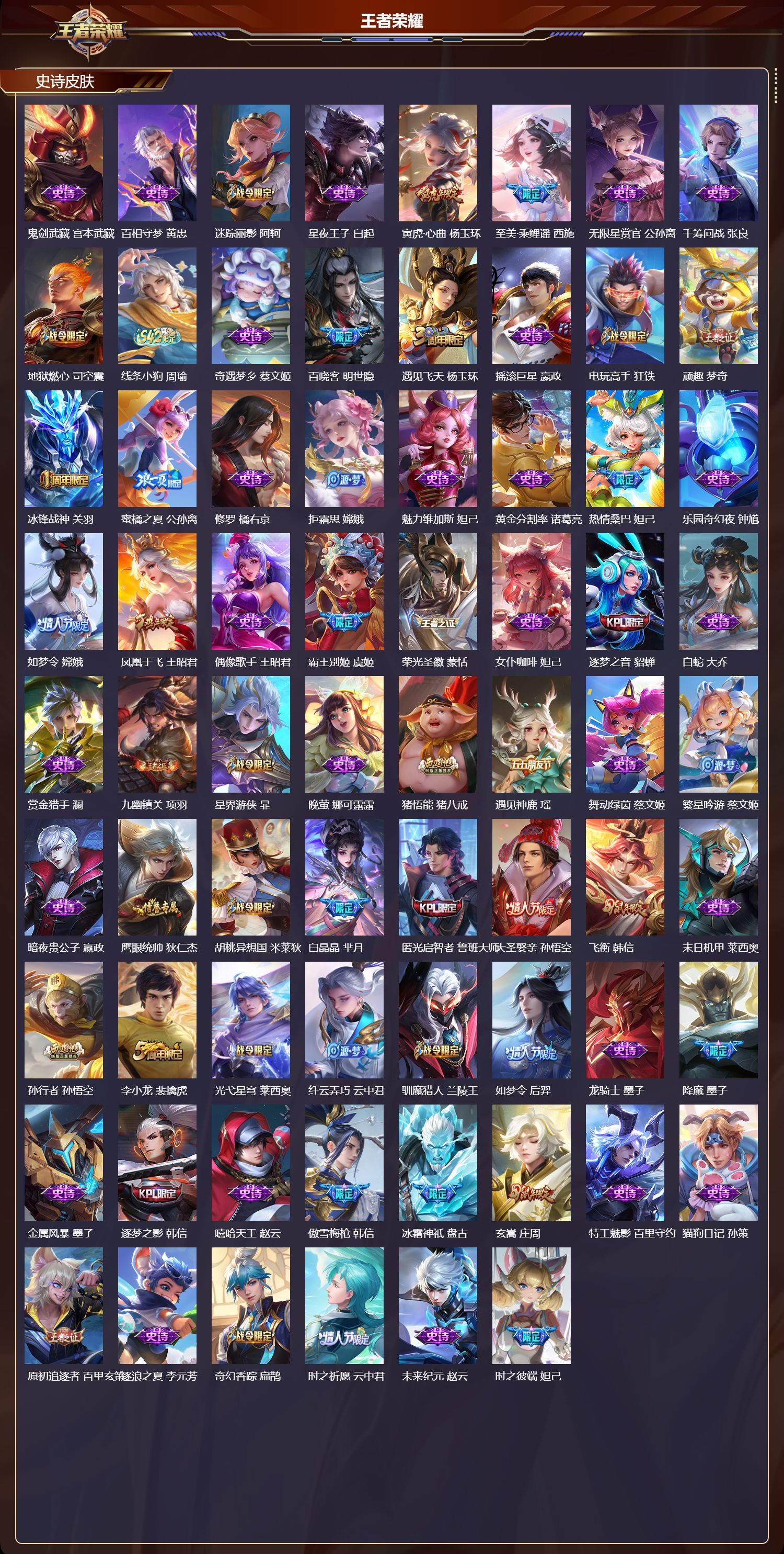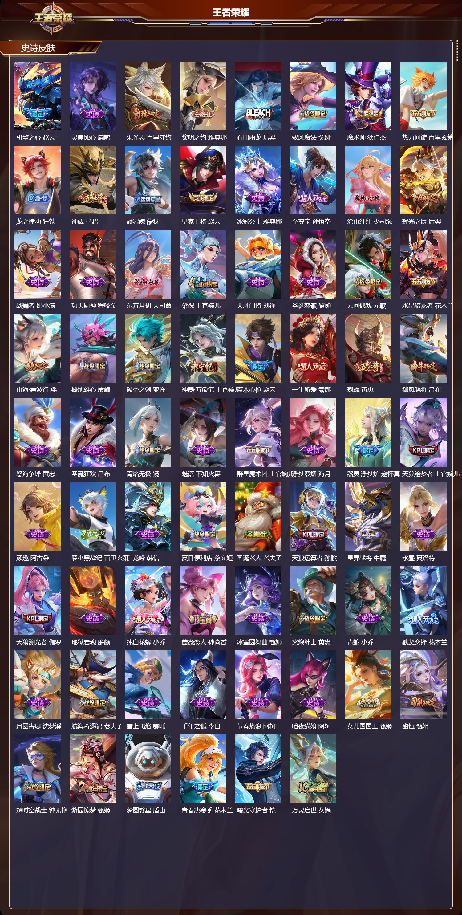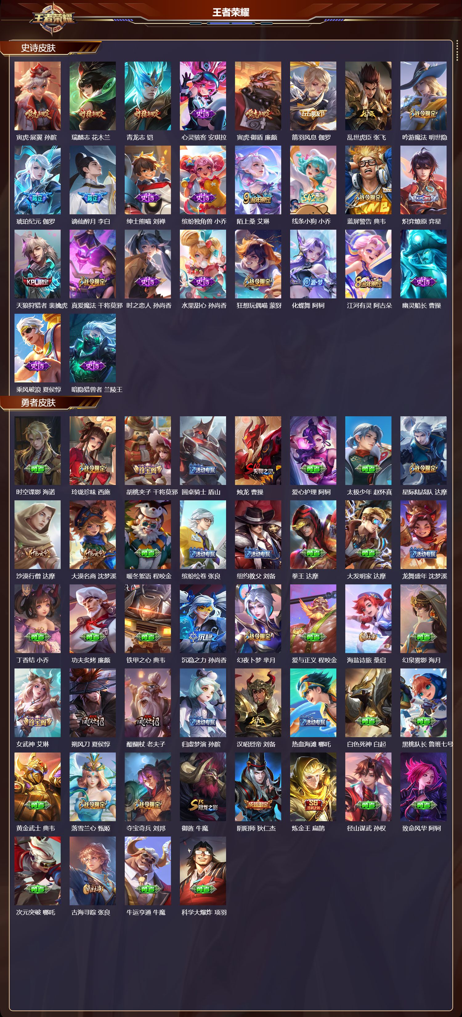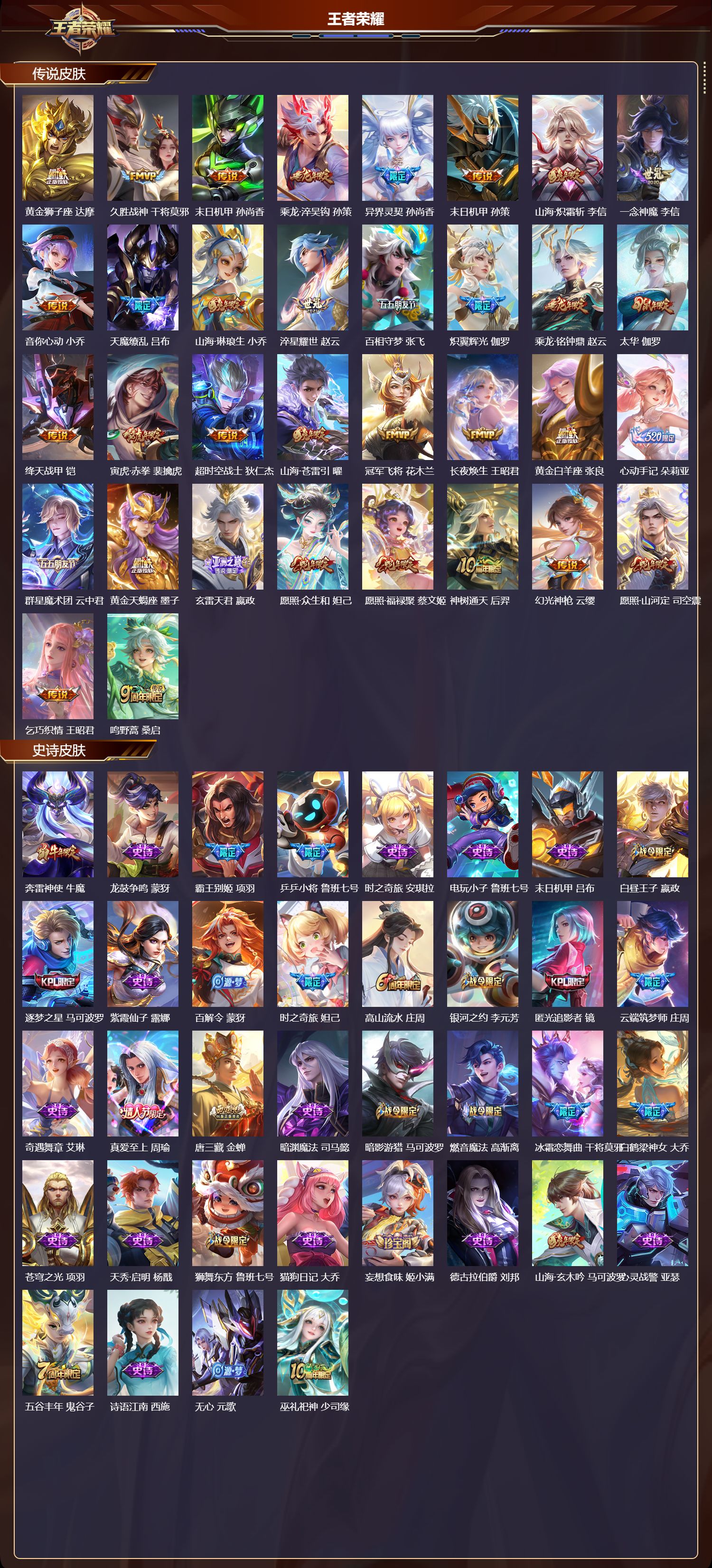 【202,史诗皮肤】,奔雷神使,牛魔,龙鼓争鸣,蒙犽,霸王别姬,项羽,乒乒小将,鲁班七号,时之奇旅,安琪拉,电玩小子,鲁班七号,末日机甲,吕布,白昼王子,嬴政,逐梦之星,马可波罗,紫霞仙子,露娜,百解令,蒙犽,时之奇旅,妲己,高山流水,庄周,银河之约,李元芳,匿光追影者,镜,云端筑梦师,庄周,奇遇舞章,艾琳,真爱至上,周瑜,唐三藏,金蝉,暗渊魔法,司马懿,暗影游猎,马可波罗,燃音魔法,高渐离,冰霜恋舞曲,干将莫邪,白鹤梁神女,大乔,苍穹之光,项羽,天秀·启明,杨戬,狮舞东方,鲁班七号,猫狗日记,大乔,妄想食味,姬小满,德古拉伯爵,刘邦,山海·玄木吟,马可波罗,心灵战警,亚瑟,五谷丰年,鬼谷子,诗语江南,西施,无心,元歌,巫礼祀神,少司缘,鬼剑武藏,宫本武藏,百相守梦,黄忠,迷踪丽影,阿轲,星夜王子,白起,寅虎·心曲,杨玉环,至美·乘鲤谣,西施,无限星赏官,公孙离,千筹问战,张良,地狱燃心,司空震,线条小狗,周瑜,奇遇梦乡,蔡文姬,百晓客,明世隐,遇见飞天,杨玉环,摇滚巨星,嬴政,电玩高手,狂铁,顽趣,梦奇,冰锋战神,关羽,蜜橘之夏,公孙离,修罗,橘右京,拒霜思,嫦娥,魅力维加斯,妲己,黄金分割率,诸葛亮,热情桑巴,妲己,乐园奇幻夜,钟馗,如梦令,嫦娥,凤凰于飞,王昭君,偶像歌手,王昭君,霸王别姬,虞姬,荣光圣徽,蒙恬,女仆咖啡,妲己,逐梦之音,貂蝉,白蛇,大乔,赏金猎手,澜,九幽镇关,项羽,星界游侠,暃,晚萤,娜可露露,猪悟能,猪八戒,遇见神鹿,瑶,舞动绿茵,蔡文姬,繁星吟游,蔡文姬,暗夜贵公子,嬴政,鹰眼统帅,狄仁杰,胡桃异想国,米莱狄,白晶晶,芈月,匿光启智者,鲁班大师,大圣娶亲,孙悟空,飞衡,韩信,末日机甲,莱西奥,孙行者,孙悟空,李小龙,裴擒虎,光弋星穹,莱西奥,纤云弄巧,云中君,驯魔猎人,兰陵王,如梦令,后羿,龙骑士,墨子,降魔,墨子,金属风暴,墨子,逐梦之影,韩信,嘻哈天王,赵云,傲雪梅枪,韩信,冰霜神祇,盘古,玄嵩,庄周,特工魅影,百里守约,猫狗日记,孙策,原初追逐者,百里玄策,逐浪之夏,李元芳,奇幻香踪,扁鹊,时之祈愿,云中君,未来纪元,赵云,时之彼端,妲己,引擎之心,赵云,灵蛊蚀心,扁鹊,朱雀志,百里守约,黎明之约,雅典娜,石田雨龙,后羿,驭风魔法,戈娅,魔术师,狄仁杰,热力回旋,百里玄策,龙之律动,狂铁,神威,马超,顽岩魄,蒙犽,皇家上将,赵云,冰冠公主,雅典娜,至尊宝,孙悟空,涂山红红,少司缘,辉光之辰,后羿,战舞者,姬小满,功夫厨神,程咬金,东方月初,大司命,梁祝,上官婉儿,天才门将,刘禅,圣诞恋歌,貂蝉,云间偶戏,元歌,水晶猎龙者,花木兰,山海·碧波行,瑶,撼地雄心,廉颇,破空之剑,亚连,神器·万象笔,上官婉儿,百木心枪,赵云,一生所爱,露娜,烈魂,黄忠,御风骁将,吕布,怒海争锋,黄忠,圣诞狂欢,吕布,青焰无极,镜,魅语,不知火舞,群星魔术团,上官婉儿,浮梦罗烟,海月,器灵·浮梦炉,赵怀真,天狼绘梦者,上官婉儿,顽趣,阿古朵,罗小黑战记,百里玄策,白龙吟,韩信,夏日便利店,蔡文姬,圣诞老人,老夫子,天狼运算者,孙膑,星界战将,牛魔,永昼,夏洛特,天狼溯光者,伽罗,地狱岩魂,廉颇,纯白花嫁,小乔,蔷薇恋人,孙尚香,冰雪圆舞曲,甄姬,火炮绅士,黄忠,青蛇,小乔,默契交锋,花木兰,月团寄思,沈梦溪,航海奇遇记,老夫子,雪上飞焰,哪吒,千年之狐,李白,节奏热浪,阿轲,暗夜猫娘,阿轲,女儿国国王,甄姬,幽恒,甄姬,超时空战士,钟无艳,游园惊梦,甄姬,梦圆繁星,盾山,青春决赛季,花木兰,曙光守护者,铠,万灵启世,女娲,寅虎·展翼,孙膑,瑞麟志,花木兰,青龙志,铠,心灵骇客,安琪拉,寅虎·御盾,廉颇,箭羽风息,伽罗,乱世虎臣,张飞,吟游魔法,明世隐,琥珀纪元,伽罗,谪仙醉月,李白,绅士熊喵,刘禅,缤纷独角兽,小乔,陌上桑,艾琳,线条小狗,小乔,蓝屏警告,典韦,炽弈燎原,弈星,天狼狩猎者,裴擒虎,真爱魔法,干将莫邪,时之恋人,孙尚香,水果甜心,孙尚香,狂想玩偶喵,蒙犽,化蝶舞,阿轲,江河有灵,阿古朵,幽灵船长,曹操,乘风破浪,夏侯惇,暗隐猎兽者,兰陵王,