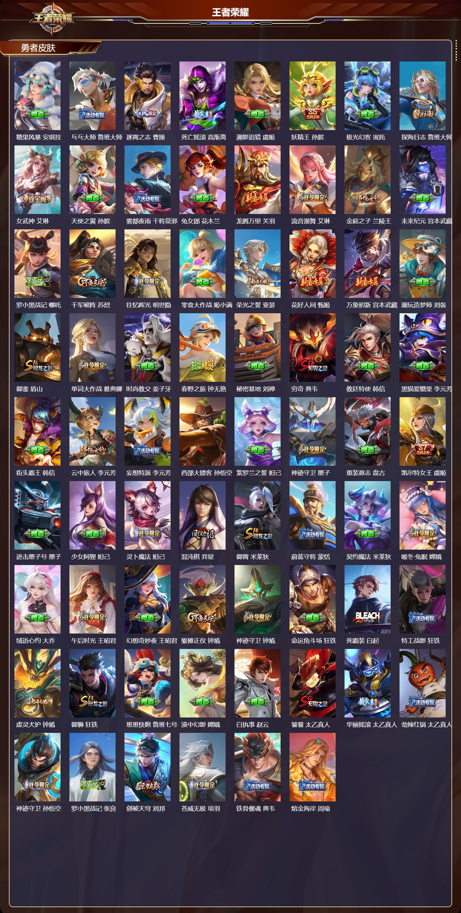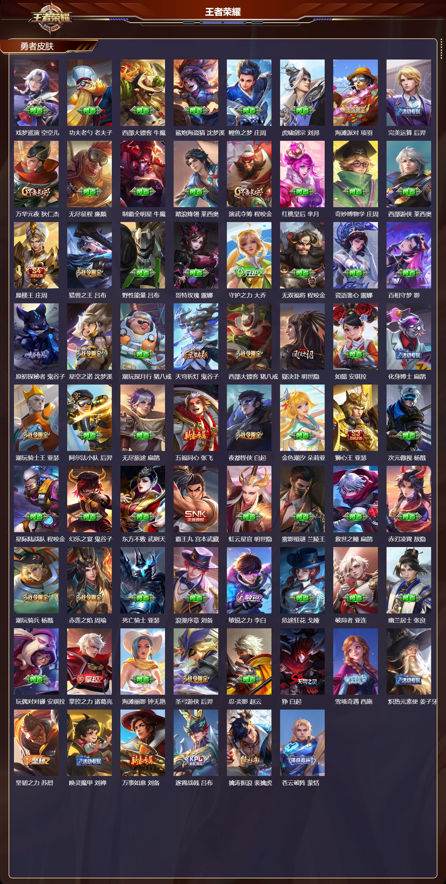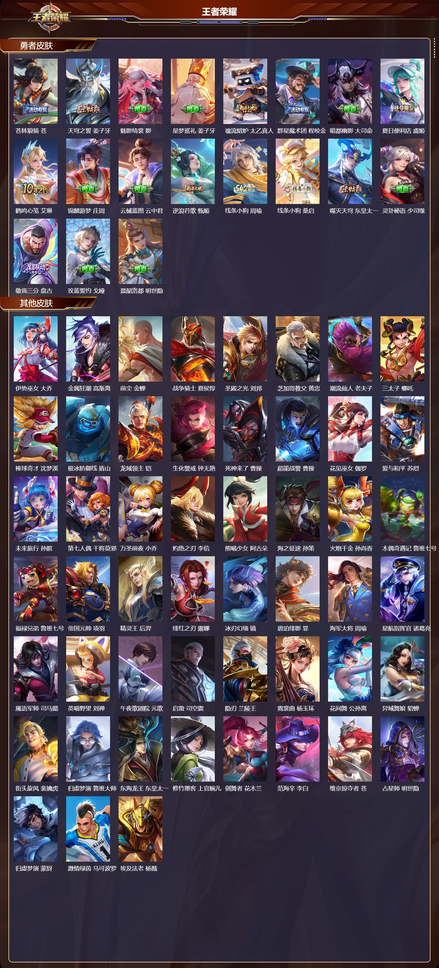 【202,勇者皮肤】,时空谍影,海诺,玲珑珍味,西施,胡桃夹子,干将莫邪,圆桌骑士,盾山,烛龙,曹操,爱心护理,阿轲,太极少年,赵怀真,星际陆战队,达摩,沙漠行僧,达摩,大漠名商,沈梦溪,暖冬絮语,程咬金,缤纷绘卷,张良,纽约教父,刘备,拳王,达摩,大发明家,达摩,龙舞盛年,沈梦溪,丁香结,小乔,功夫炙烤,廉颇,铁甲之心,典韦,沉稳之力,孙尚香,幻夜卜梦,芈月,爱与正义,程咬金,海盐诗旅,桑启,幻泉雾影,海月,朔风刀,夏侯惇,醍醐杖,老夫子,归虚梦演,孙膑,汉昭烈帝,刘备,热血海滩,哪吒,白色死神,白起,黑桃队长,鲁班七号,黄金武士,典韦,落雪兰心,甄姬,夺宝奇兵,刘邦,御旌,牛魔,阴阳师,狄仁杰,炼金王,扁鹊,径山谋武,孙权,致命风华,阿轲,次元突破,哪吒,古海寻踪,张良,牛运亨通,牛魔,科学大爆炸,项羽,戏梦巡演,空空儿,功夫老勺,老夫子,西部大镖客,牛魔,鲨炮海盗猫,沈梦溪,鲤鱼之梦,庄周,虎啸剑宗,刘邦,海滩派对,项羽,完美运算,后羿,万华元夜,狄仁杰,无尽征程,廉颇,制霸全明星,牛魔,踏浪烽翎,莱西奥,演武夺筹,程咬金,红桃皇后,芈月,奇妙博物学,庄周,西部游侠,莱西奥,蜃楼王,庄周,猎兽之王,吕布,野性能量,吕布,哥特玫瑰,露娜,守护之力,大乔,无双福将,程咬金,瓷语鉴心,露娜,百相守梦,影,原初探秘者,鬼谷子,星空之诺,沈梦溪,潮玩探月行,猪八戒,天穹祈灯,鬼谷子,西部大镖客,猪八戒,疑决卦,明世隐,如懿,安琪拉,化身博士,扁鹊,潮玩骑士王,亚瑟,阿尔法小队,后羿,无尽旅途,扁鹊,五福同心,张飞,夜都怪侠,白起,金色潮汐,朵莉亚,狮心王,亚瑟,次元傲视,杨戬,星际陆战队,程咬金,幻乐之宴,鬼谷子,东方不败,武则天,霸王丸,宫本武藏,虹云星官,明世隐,雾影缉谜,兰陵王,救世之瞳,扁鹊,赤刃凌霄,敖隐,潮玩骑兵,杨戬,赤莲之焰,周瑜,死亡骑士,亚瑟,浪漫序章,刘备,敏锐之力,李白,危途狂花,戈娅,破局者,亚连,幽兰居士,张良,玩偶对对碰,安琪拉,掌控之力,诸葛亮,海滩丽影,钟无艳,圣弓游侠,后羿,忍·炎影,赵云,狰,白起,雪境奇遇,西施,炽热元素使,姜子牙,坚韧之力,苏烈,唤灵魔甲,刘禅,万事如意,刘备,逐霄战戟,吕布,擒涛扼浪,裴擒虎,苍云破阵,蒙恬,糖果风暴,安琪拉,乓乓大师,鲁班大师,逐霄之志,曹操,死亡摇滚,高渐离,溯影追猎,虞姬,妖精王,孙膑,极光幻客,蚩奼,探海日志,鲁班大师,女武神,艾琳,天使之翼,孙膑,雾都夜雨,干将莫邪,兔女郎,花木兰,龙腾万里,关羽,流音漫舞,艾琳,金庭之子,兰陵王,未来纪元,宫本武藏,罗小黑战记,哪吒,千军破阵,苏烈,往忆晖光,明世隐,零食大作战,姬小满,荣光之誓,亚瑟,花好人间,甄姬,万象初新,宫本武藏,潮玩造梦师,刘备,御銮,盾山,单词大作战,雅典娜,时尚教父,姜子牙,春野之旅,钟无艳,秘密基地,刘禅,穷奇,典韦,教廷特使,韩信,黑猫爱糖果,李元芳,街头霸王,韩信,云中旅人,李元芳,妄想特派,李元芳,西部大镖客,孙悟空,紫罗兰之誓,妲己,神迹守卫,墨子,重装意志,盘古,凯尔特女王,虞姬,进击墨子号,墨子,少女阿狸,妲己,灵卜魔法,妲己,混沌棋,弈星,御霄,米莱狄,蔚蓝守将,蒙恬,契约魔法,米莱狄,暖冬·兔眠,嫦娥,绒语心约,大乔,午后时光,王昭君,幻想奇妙夜,王昭君,驱傩正仪,钟馗,神迹守卫,钟馗,命运角斗场,狂铁,死霸装,白起,特工战影,狂铁,虚灵犬护,钟馗,御狮,狂铁,班班快跑,鲁班七号,漠中幻影,嫦娥,白执事,赵云,饕餮,太乙真人,华丽摇滚,太乙真人,劲辣红锅,太乙真人,神迹守卫,孙悟空,罗小黑战记,张良,剑破天穹,刘邦,苍威无极,项羽,铁骨偃魂,典韦,熔金海岸,周瑜,苍林狼骑,苍,天穹之誓,姜子牙,魅影绮裳,影,星梦巡礼,姜子牙,谧流熔炉,太乙真人,群星魔术团,程咬金,暗都幽影,大司命,夏日便利店,虞姬,鹤鸣心笺,艾琳,锦麟游梦,庄周,云械蓝图,云中君,逆浪荇歌,甄姬,线条小狗,周瑜,线条小狗,桑启,噬灭天穹,东皇太一,灵卦秘语,少司缘,敬我三分,盘古,玫蓝誓约,戈娅,景韶洛都,明世隐,