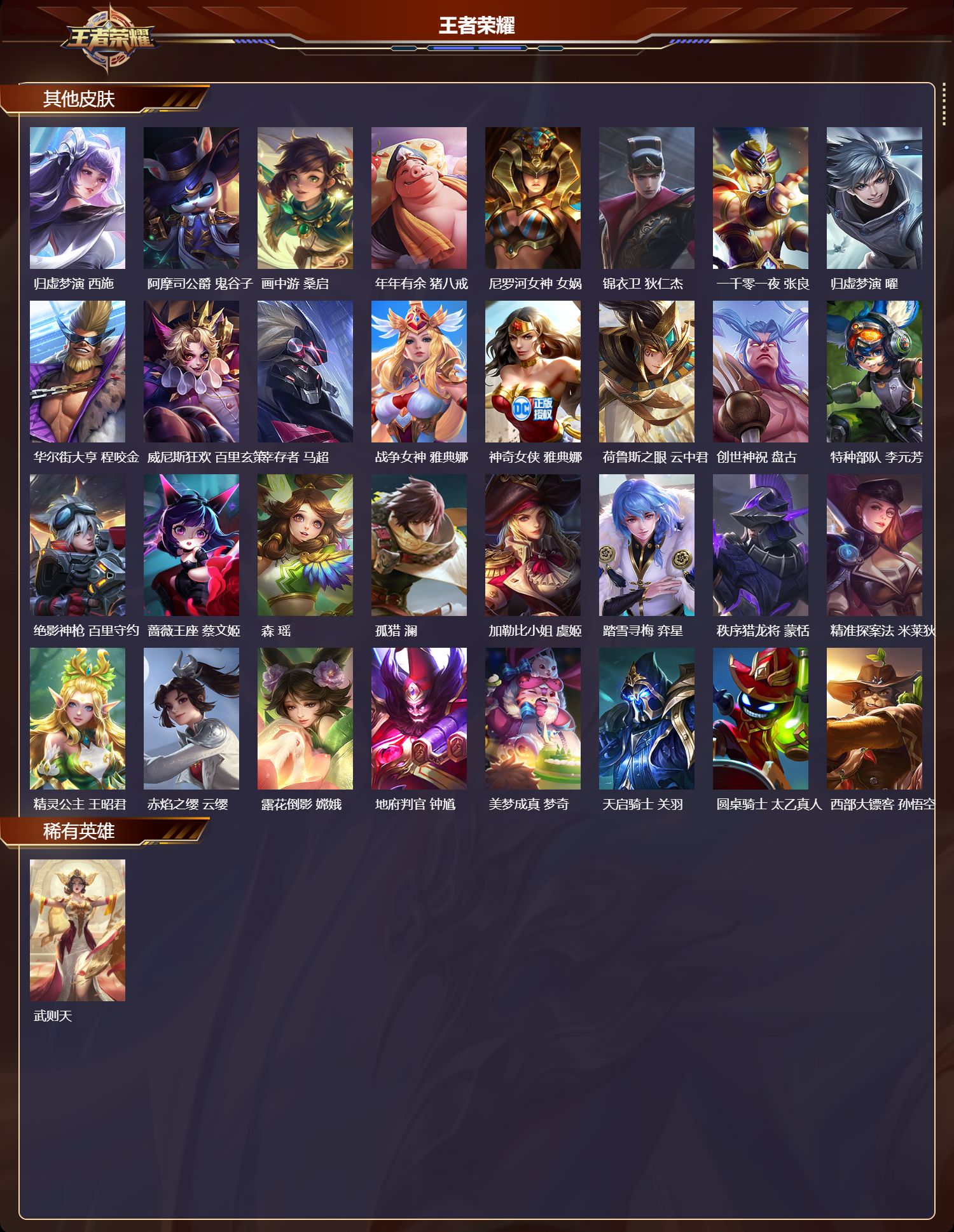 【83,其他皮肤】,伊势巫女,大乔,金属狂潮,高渐离,前尘,金蝉,战争骑士,夏侯惇,圣殿之光,刘邦,芝加哥教父,黄忠,潮流仙人,老夫子,三太子,哪吒,棒球奇才,沈梦溪,极冰防御线,盾山,龙域领主,铠,生化警戒,钟无艳,死神来了,曹操,超能战警,曹操,花见巫女,伽罗,爱与和平,苏烈,未来旅行,孙膑,第七人偶,干将莫邪,万圣前夜,小乔,灼热之刃,李信,熊喵少女,阿古朵,海之征途,孙策,火炮千金,孙尚香,木偶奇遇记,鲁班七号,福禄兄弟,鲁班七号,帝国元帅,项羽,精灵王,后羿,绯红之刃,露娜,冰刃幻境,镜,碧珀绯影,暃,海军大将,周瑜,星航指挥官,诸葛亮,魇语军师,司马懿,英喵野望,刘禅,午夜歌剧院,元歌,启蛰,司空震,隐刃,兰陵王,霓裳曲,杨玉环,花间舞,公孙离,异域舞娘,貂蝉,街头旋风,裴擒虎,归虚梦演,鲁班大师,东海龙王,东皇太一,修竹墨客,上官婉儿,剑舞者,花木兰,范海辛,李白,维京掠夺者,苍,占星师,明世隐,归虚梦演,蒙犽,激情绿茵,马可波罗,埃及法老,杨戬,归虚梦演,西施,阿摩司公爵,鬼谷子,画中游,桑启,年年有余,猪八戒,尼罗河女神,女娲,锦衣卫,狄仁杰,一千零一夜,张良,归虚梦演,曜,华尔街大亨,程咬金,威尼斯狂欢,百里玄策,幸存者,马超,战争女神,雅典娜,神奇女侠,雅典娜,荷鲁斯之眼,云中君,创世神祝,盘古,特种部队,李元芳,绝影神枪,百里守约,蔷薇王座,蔡文姬,森,瑶,孤猎,澜,加勒比小姐,虞姬,踏雪寻梅,弈星,秩序猎龙将,蒙恬,精准探案法,米莱狄,精灵公主,王昭君,赤焰之缨,云缨,露花倒影,嫦娥,地府判官,钟馗,美梦成真,梦奇,天启骑士,关羽,圆桌骑士,太乙真人,西部大镖客,孙悟空,