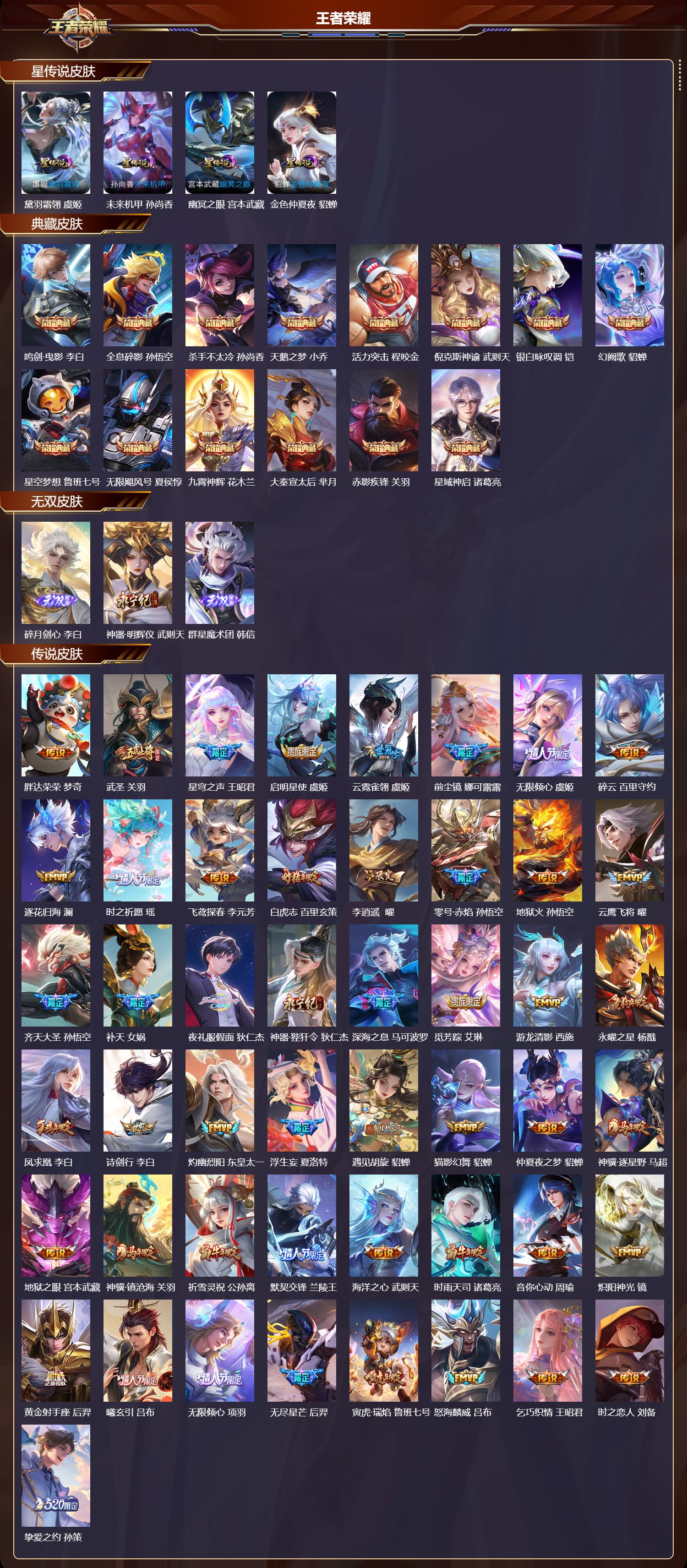 【82,传说皮肤】,胖达荣荣,梦奇,武圣,关羽,星穹之声,王昭君,启明星使,虞姬,云霓雀翎,虞姬,前尘镜,娜可露露,无限倾心,虞姬,碎云,百里守约,逐花归海,澜,时之祈愿,瑶,飞鸢探春,李元芳,白虎志,百里玄策,李逍遥,,曜,零号·赤焰,孙悟空,地狱火,孙悟空,云鹰飞将,曜,齐天大圣,孙悟空,补天,女娲,夜礼服假面,狄仁杰,神器·狴犴令,狄仁杰,深海之息,马可波罗,觅芳踪,艾琳,游龙清影,西施,永曜之星,杨戬,凤求凰,李白,诗剑行,李白,灼幽烈阳,东皇太一,浮生妄,夏洛特,遇见胡旋,貂蝉,猫影幻舞,貂蝉,仲夏夜之梦,貂蝉,神骥·逐星野,马超,地狱之眼,宫本武藏,神骥·镇沧海,关羽,祈雪灵祝,公孙离,默契交锋,兰陵王,海洋之心,武则天,时雨天司,诸葛亮,音你心动,周瑜,炽阳神光,镜,黄金射手座,后羿,曦玄引,吕布,无限倾心,项羽,无尽星芒,后羿,寅虎·瑞焰,鲁班七号,怒海麟威,吕布,乞巧织情,王昭君,时之恋人,刘备,挚爱之约,孙策,黄金狮子座,达摩,久胜战神,干将莫邪,末日机甲,孙尚香,乘龙·淬吴钩,孙策,异界灵契,孙尚香,末日机甲,孙策,山海·炽霜斩,李信,一念神魔,李信,音你心动,小乔,天魔缭乱,吕布,山海·琳琅生,小乔,淬星耀世,赵云,百相守梦,张飞,炽翼辉光,伽罗,乘龙·铭钟鼎,赵云,太华,伽罗,绛天战甲,铠,寅虎·赤拳,裴擒虎,超时空战士,狄仁杰,山海·苍雷引,曜,冠军飞将,花木兰,长夜焕生,王昭君,黄金白羊座,张良,心动手记,朵莉亚,群星魔术团,云中君,黄金天蝎座,墨子,玄雷天君,嬴政,愿照·众生和,妲己,愿照·福禄聚,蔡文姬,神树通天,后羿,幻光神枪,云缨,愿照·山河定,司空震,鸣野蒿,桑启,