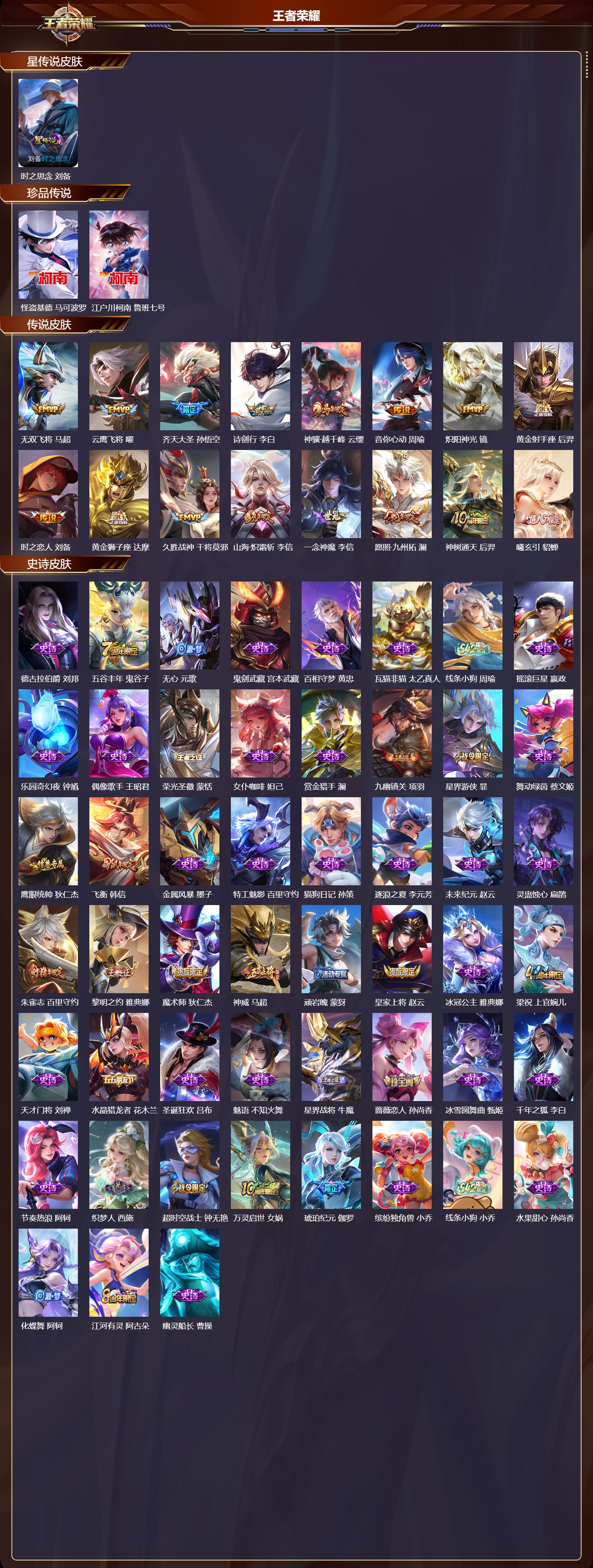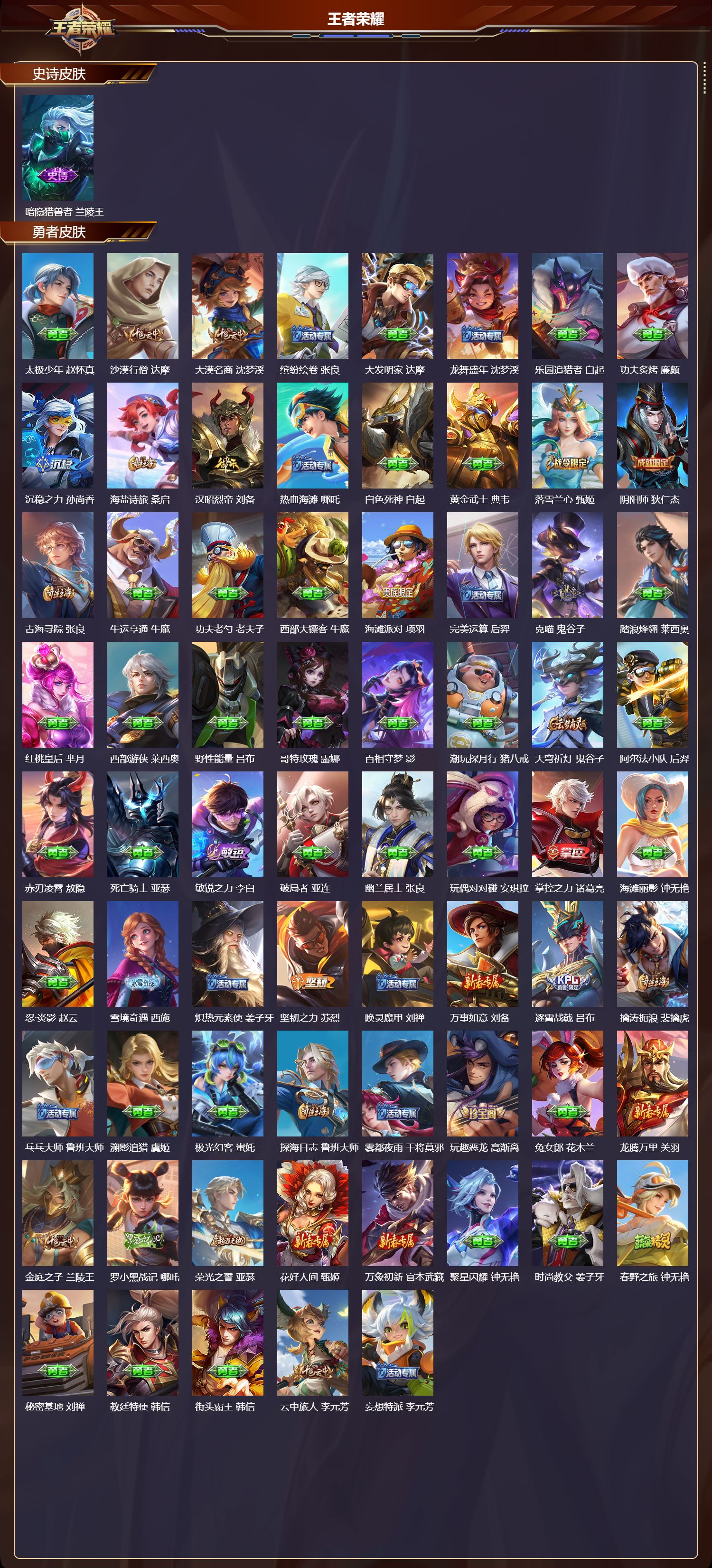 【52,史诗皮肤】,德古拉伯爵,刘邦,五谷丰年,鬼谷子,无心,元歌,鬼剑武藏,宫本武藏,百相守梦,黄忠,瓦猫非猫,太乙真人,线条小狗,周瑜,摇滚巨星,嬴政,乐园奇幻夜,钟馗,偶像歌手,王昭君,荣光圣徽,蒙恬,女仆咖啡,妲己,赏金猎手,澜,九幽镇关,项羽,星界游侠,暃,舞动绿茵,蔡文姬,鹰眼统帅,狄仁杰,飞衡,韩信,金属风暴,墨子,特工魅影,百里守约,猫狗日记,孙策,逐浪之夏,李元芳,未来纪元,赵云,灵蛊蚀心,扁鹊,朱雀志,百里守约,黎明之约,雅典娜,魔术师,狄仁杰,神威,马超,顽岩魄,蒙犽,皇家上将,赵云,冰冠公主,雅典娜,梁祝,上官婉儿,天才门将,刘禅,水晶猎龙者,花木兰,圣诞狂欢,吕布,魅语,不知火舞,星界战将,牛魔,蔷薇恋人,孙尚香,冰雪圆舞曲,甄姬,千年之狐,李白,节奏热浪,阿轲,织梦人,西施,超时空战士,钟无艳,万灵启世,女娲,琥珀纪元,伽罗,缤纷独角兽,小乔,线条小狗,小乔,水果甜心,孙尚香,化蝶舞,阿轲,江河有灵,阿古朵,幽灵船长,曹操,暗隐猎兽者,兰陵王,