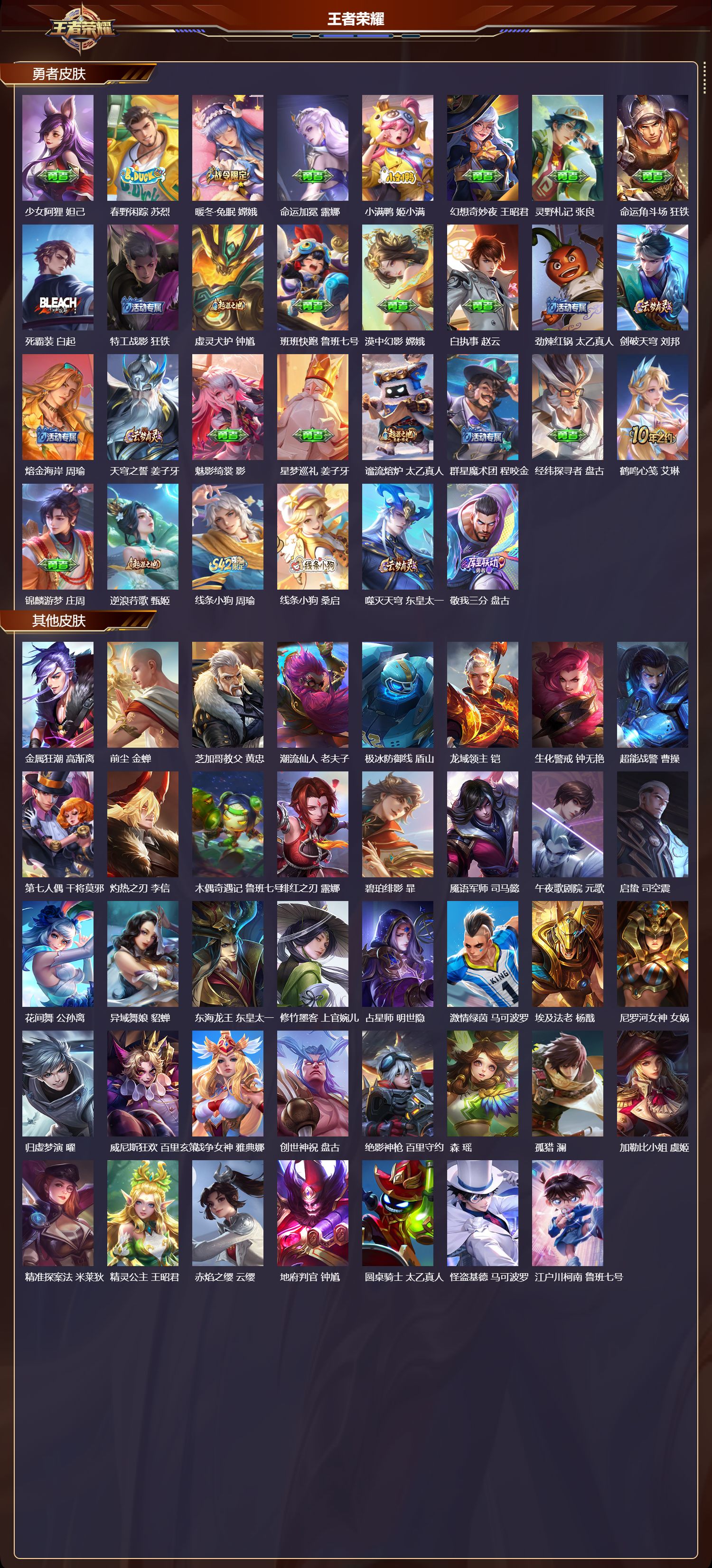 【99,勇者皮肤】,太极少年,赵怀真,沙漠行僧,达摩,大漠名商,沈梦溪,缤纷绘卷,张良,大发明家,达摩,龙舞盛年,沈梦溪,乐园追猎者,白起,功夫炙烤,廉颇,沉稳之力,孙尚香,海盐诗旅,桑启,汉昭烈帝,刘备,热血海滩,哪吒,白色死神,白起,黄金武士,典韦,落雪兰心,甄姬,阴阳师,狄仁杰,古海寻踪,张良,牛运亨通,牛魔,功夫老勺,老夫子,西部大镖客,牛魔,海滩派对,项羽,完美运算,后羿,克喵,鬼谷子,踏浪烽翎,莱西奥,红桃皇后,芈月,西部游侠,莱西奥,野性能量,吕布,哥特玫瑰,露娜,百相守梦,影,潮玩探月行,猪八戒,天穹祈灯,鬼谷子,阿尔法小队,后羿,赤刃凌霄,敖隐,死亡骑士,亚瑟,敏锐之力,李白,破局者,亚连,幽兰居士,张良,玩偶对对碰,安琪拉,掌控之力,诸葛亮,海滩丽影,钟无艳,忍·炎影,赵云,雪境奇遇,西施,炽热元素使,姜子牙,坚韧之力,苏烈,唤灵魔甲,刘禅,万事如意,刘备,逐霄战戟,吕布,擒涛扼浪,裴擒虎,乓乓大师,鲁班大师,溯影追猎,虞姬,极光幻客,蚩奼,探海日志,鲁班大师,雾都夜雨,干将莫邪,玩趣恶龙,高渐离,兔女郎,花木兰,龙腾万里,关羽,金庭之子,兰陵王,罗小黑战记,哪吒,荣光之誓,亚瑟,花好人间,甄姬,万象初新,宫本武藏,聚星闪耀,钟无艳,时尚教父,姜子牙,春野之旅,钟无艳,秘密基地,刘禅,教廷特使,韩信,街头霸王,韩信,云中旅人,李元芳,妄想特派,李元芳,少女阿狸,妲己,春野闲踪,苏烈,暖冬·兔眠,嫦娥,命运加冕,露娜,小满鸭,姬小满,幻想奇妙夜,王昭君,灵野札记,张良,命运角斗场,狂铁,死霸装,白起,特工战影,狂铁,虚灵犬护,钟馗,班班快跑,鲁班七号,漠中幻影,嫦娥,白执事,赵云,劲辣红锅,太乙真人,剑破天穹,刘邦,熔金海岸,周瑜,天穹之誓,姜子牙,魅影绮裳,影,星梦巡礼,姜子牙,谧流熔炉,太乙真人,群星魔术团,程咬金,经纬探寻者,盘古,鹤鸣心笺,艾琳,锦麟游梦,庄周,逆浪荇歌,甄姬,线条小狗,周瑜,线条小狗,桑启,噬灭天穹,东皇太一,敬我三分,盘古,
