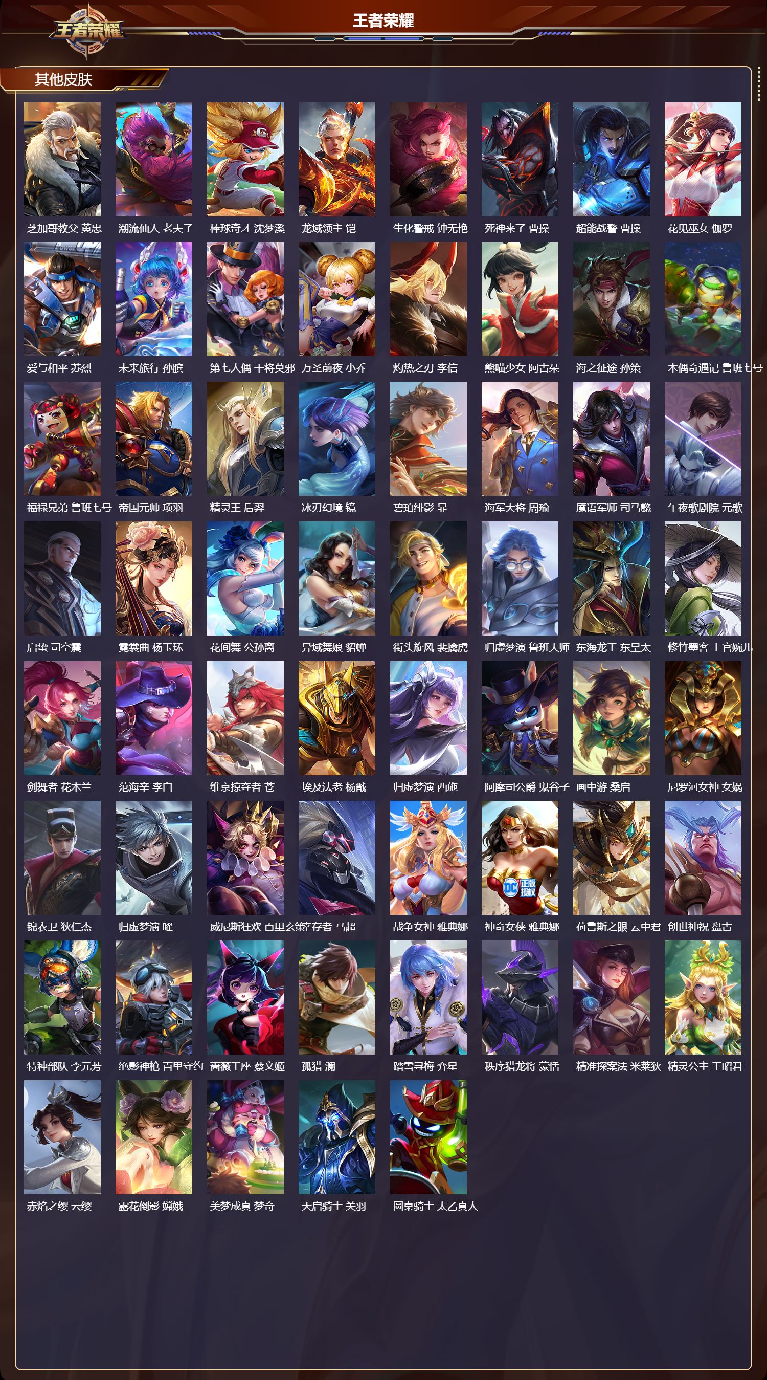 【65,其他皮肤】,金属狂潮,高渐离,前尘,金蝉,战争骑士,夏侯惇,圣殿之光,刘邦,芝加哥教父,黄忠,潮流仙人,老夫子,棒球奇才,沈梦溪,龙域领主,铠,生化警戒,钟无艳,死神来了,曹操,超能战警,曹操,花见巫女,伽罗,爱与和平,苏烈,未来旅行,孙膑,第七人偶,干将莫邪,万圣前夜,小乔,灼热之刃,李信,熊喵少女,阿古朵,海之征途,孙策,木偶奇遇记,鲁班七号,福禄兄弟,鲁班七号,帝国元帅,项羽,精灵王,后羿,冰刃幻境,镜,碧珀绯影,暃,海军大将,周瑜,魇语军师,司马懿,午夜歌剧院,元歌,启蛰,司空震,霓裳曲,杨玉环,花间舞,公孙离,异域舞娘,貂蝉,街头旋风,裴擒虎,归虚梦演,鲁班大师,东海龙王,东皇太一,修竹墨客,上官婉儿,剑舞者,花木兰,范海辛,李白,维京掠夺者,苍,埃及法老,杨戬,归虚梦演,西施,阿摩司公爵,鬼谷子,画中游,桑启,尼罗河女神,女娲,锦衣卫,狄仁杰,归虚梦演,曜,威尼斯狂欢,百里玄策,幸存者,马超,战争女神,雅典娜,神奇女侠,雅典娜,荷鲁斯之眼,云中君,创世神祝,盘古,特种部队,李元芳,绝影神枪,百里守约,蔷薇王座,蔡文姬,孤猎,澜,踏雪寻梅,弈星,秩序猎龙将,蒙恬,精准探案法,米莱狄,精灵公主,王昭君,赤焰之缨,云缨,露花倒影,嫦娥,美梦成真,梦奇,天启骑士,关羽,圆桌骑士,太乙真人,