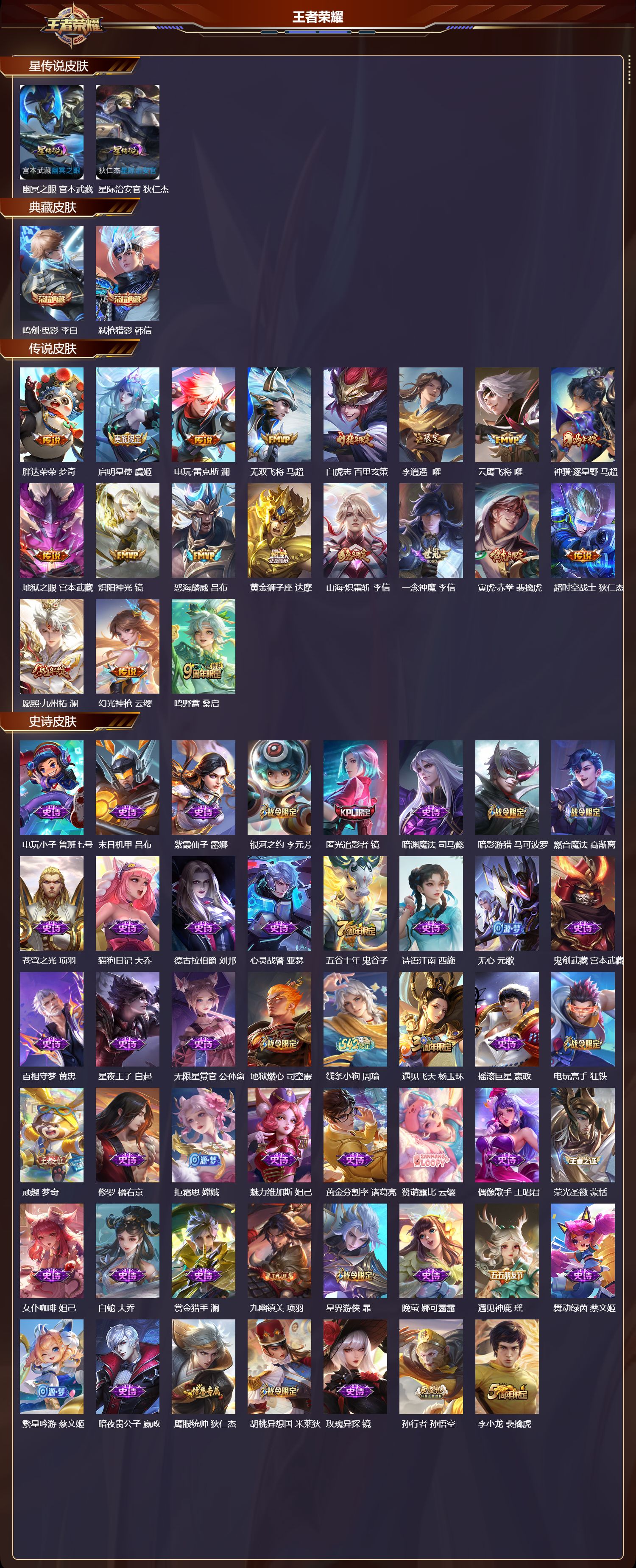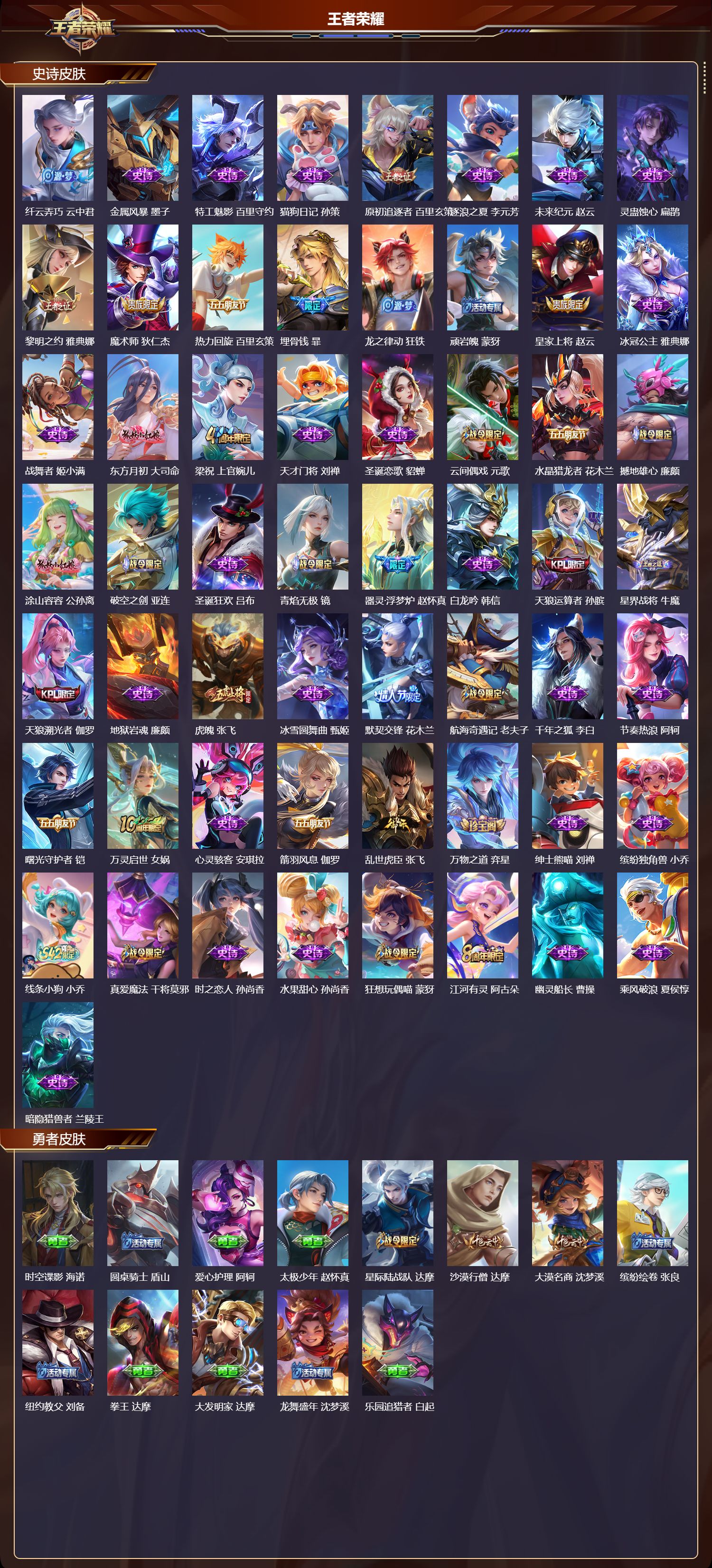 【104,史诗皮肤】,电玩小子,鲁班七号,末日机甲,吕布,紫霞仙子,露娜,银河之约,李元芳,匿光追影者,镜,暗渊魔法,司马懿,暗影游猎,马可波罗,燃音魔法,高渐离,苍穹之光,项羽,猫狗日记,大乔,德古拉伯爵,刘邦,心灵战警,亚瑟,五谷丰年,鬼谷子,诗语江南,西施,无心,元歌,鬼剑武藏,宫本武藏,百相守梦,黄忠,星夜王子,白起,无限星赏官,公孙离,地狱燃心,司空震,线条小狗,周瑜,遇见飞天,杨玉环,摇滚巨星,嬴政,电玩高手,狂铁,顽趣,梦奇,修罗,橘右京,拒霜思,嫦娥,魅力维加斯,妲己,黄金分割率,诸葛亮,赞萌露比,云缨,偶像歌手,王昭君,荣光圣徽,蒙恬,女仆咖啡,妲己,白蛇,大乔,赏金猎手,澜,九幽镇关,项羽,星界游侠,暃,晚萤,娜可露露,遇见神鹿,瑶,舞动绿茵,蔡文姬,繁星吟游,蔡文姬,暗夜贵公子,嬴政,鹰眼统帅,狄仁杰,胡桃异想国,米莱狄,玫瑰异探,镜,孙行者,孙悟空,李小龙,裴擒虎,纤云弄巧,云中君,金属风暴,墨子,特工魅影,百里守约,猫狗日记,孙策,原初追逐者,百里玄策,逐浪之夏,李元芳,未来纪元,赵云,灵蛊蚀心,扁鹊,黎明之约,雅典娜,魔术师,狄仁杰,热力回旋,百里玄策,埋骨钱,暃,龙之律动,狂铁,顽岩魄,蒙犽,皇家上将,赵云,冰冠公主,雅典娜,战舞者,姬小满,东方月初,大司命,梁祝,上官婉儿,天才门将,刘禅,圣诞恋歌,貂蝉,云间偶戏,元歌,水晶猎龙者,花木兰,撼地雄心,廉颇,涂山容容,公孙离,破空之剑,亚连,圣诞狂欢,吕布,青焰无极,镜,器灵·浮梦炉,赵怀真,白龙吟,韩信,天狼运算者,孙膑,星界战将,牛魔,天狼溯光者,伽罗,地狱岩魂,廉颇,虎魄,张飞,冰雪圆舞曲,甄姬,默契交锋,花木兰,航海奇遇记,老夫子,千年之狐,李白,节奏热浪,阿轲,曙光守护者,铠,万灵启世,女娲,心灵骇客,安琪拉,箭羽风息,伽罗,乱世虎臣,张飞,万物之道,弈星,绅士熊喵,刘禅,缤纷独角兽,小乔,线条小狗,小乔,真爱魔法,干将莫邪,时之恋人,孙尚香,水果甜心,孙尚香,狂想玩偶喵,蒙犽,江河有灵,阿古朵,幽灵船长,曹操,乘风破浪,夏侯惇,暗隐猎兽者,兰陵王,