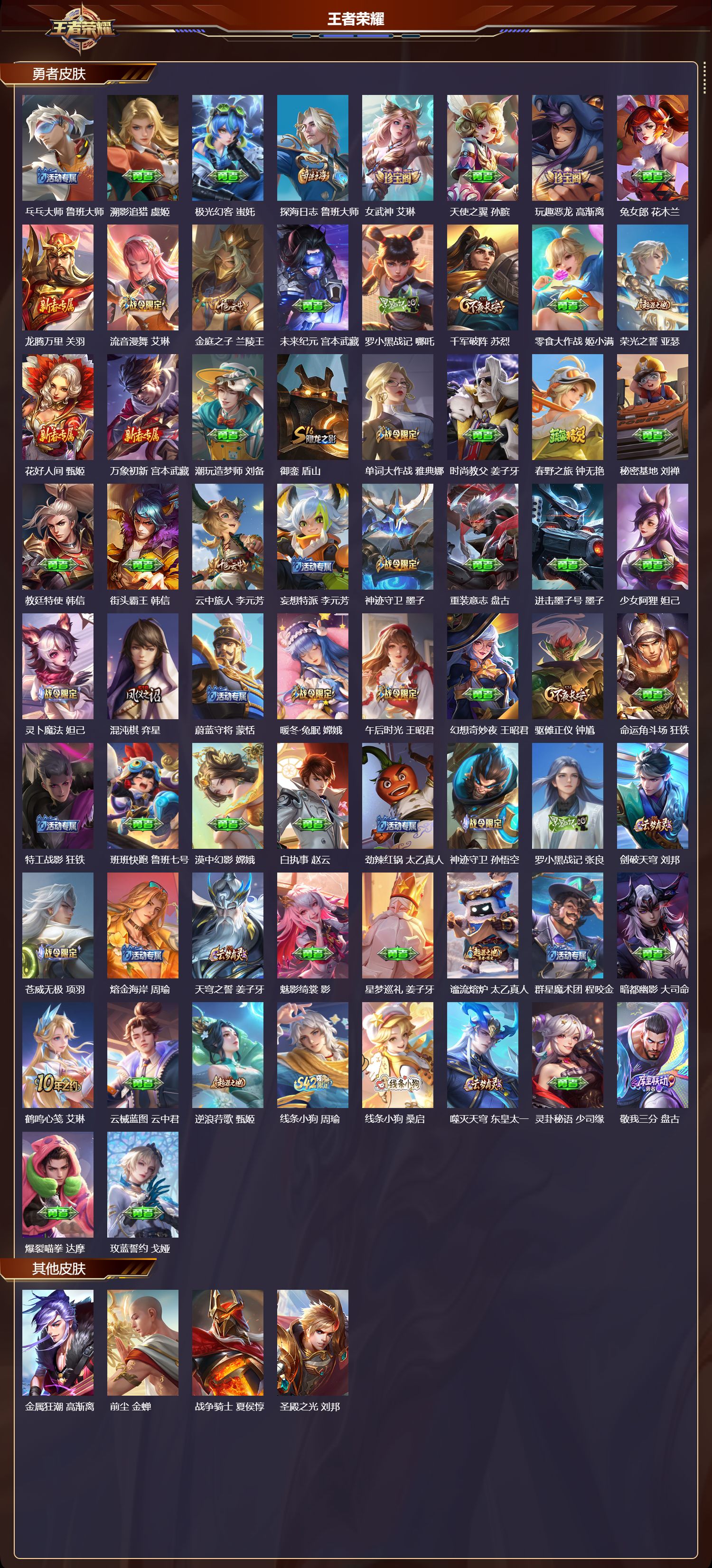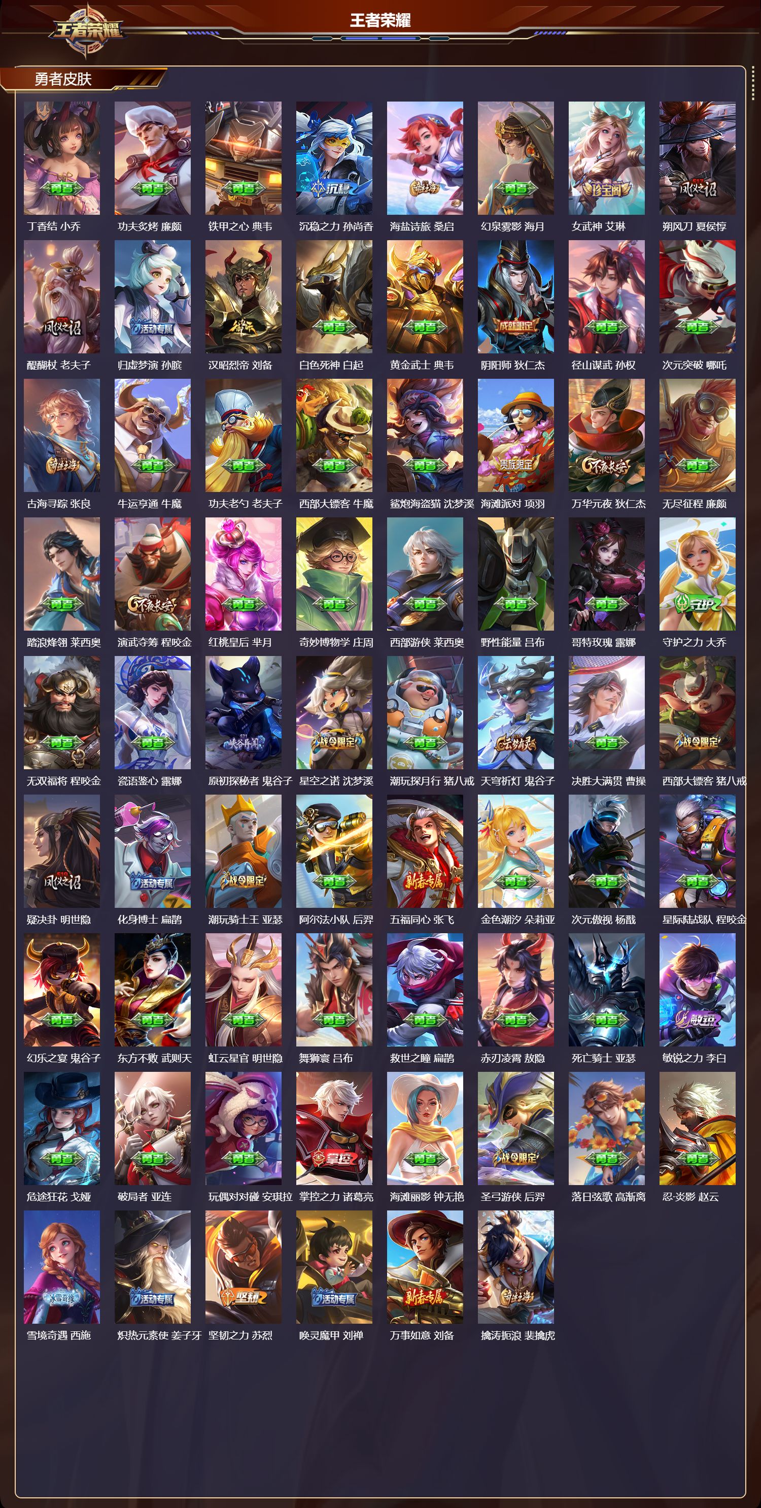 【148,勇者皮肤】,时空谍影,海诺,圆桌骑士,盾山,爱心护理,阿轲,太极少年,赵怀真,星际陆战队,达摩,沙漠行僧,达摩,大漠名商,沈梦溪,缤纷绘卷,张良,纽约教父,刘备,拳王,达摩,大发明家,达摩,龙舞盛年,沈梦溪,乐园追猎者,白起,丁香结,小乔,功夫炙烤,廉颇,铁甲之心,典韦,沉稳之力,孙尚香,海盐诗旅,桑启,幻泉雾影,海月,朔风刀,夏侯惇,醍醐杖,老夫子,归虚梦演,孙膑,汉昭烈帝,刘备,白色死神,白起,黄金武士,典韦,阴阳师,狄仁杰,径山谋武,孙权,次元突破,哪吒,古海寻踪,张良,牛运亨通,牛魔,功夫老勺,老夫子,西部大镖客,牛魔,鲨炮海盗猫,沈梦溪,海滩派对,项羽,万华元夜,狄仁杰,无尽征程,廉颇,踏浪烽翎,莱西奥,演武夺筹,程咬金,红桃皇后,芈月,奇妙博物学,庄周,西部游侠,莱西奥,野性能量,吕布,哥特玫瑰,露娜,守护之力,大乔,无双福将,程咬金,瓷语鉴心,露娜,原初探秘者,鬼谷子,星空之诺,沈梦溪,潮玩探月行,猪八戒,天穹祈灯,鬼谷子,决胜大满贯,曹操,西部大镖客,猪八戒,疑决卦,明世隐,化身博士,扁鹊,潮玩骑士王,亚瑟,阿尔法小队,后羿,五福同心,张飞,金色潮汐,朵莉亚,次元傲视,杨戬,星际陆战队,程咬金,幻乐之宴,鬼谷子,东方不败,武则天,虹云星官,明世隐,舞狮寰,吕布,救世之瞳,扁鹊,赤刃凌霄,敖隐,死亡骑士,亚瑟,敏锐之力,李白,危途狂花,戈娅,破局者,亚连,玩偶对对碰,安琪拉,掌控之力,诸葛亮,海滩丽影,钟无艳,圣弓游侠,后羿,落日弦歌,高渐离,忍·炎影,赵云,雪境奇遇,西施,炽热元素使,姜子牙,坚韧之力,苏烈,唤灵魔甲,刘禅,万事如意,刘备,擒涛扼浪,裴擒虎,乓乓大师,鲁班大师,溯影追猎,虞姬,极光幻客,蚩奼,探海日志,鲁班大师,女武神,艾琳,天使之翼,孙膑,玩趣恶龙,高渐离,兔女郎,花木兰,龙腾万里,关羽,流音漫舞,艾琳,金庭之子,兰陵王,未来纪元,宫本武藏,罗小黑战记,哪吒,千军破阵,苏烈,零食大作战,姬小满,荣光之誓,亚瑟,花好人间,甄姬,万象初新,宫本武藏,潮玩造梦师,刘备,御銮,盾山,单词大作战,雅典娜,时尚教父,姜子牙,春野之旅,钟无艳,秘密基地,刘禅,教廷特使,韩信,街头霸王,韩信,云中旅人,李元芳,妄想特派,李元芳,神迹守卫,墨子,重装意志,盘古,进击墨子号,墨子,少女阿狸,妲己,灵卜魔法,妲己,混沌棋,弈星,蔚蓝守将,蒙恬,暖冬·兔眠,嫦娥,午后时光,王昭君,幻想奇妙夜,王昭君,驱傩正仪,钟馗,命运角斗场,狂铁,特工战影,狂铁,班班快跑,鲁班七号,漠中幻影,嫦娥,白执事,赵云,劲辣红锅,太乙真人,神迹守卫,孙悟空,罗小黑战记,张良,剑破天穹,刘邦,苍威无极,项羽,熔金海岸,周瑜,天穹之誓,姜子牙,魅影绮裳,影,星梦巡礼,姜子牙,谧流熔炉,太乙真人,群星魔术团,程咬金,暗都幽影,大司命,鹤鸣心笺,艾琳,云械蓝图,云中君,逆浪荇歌,甄姬,线条小狗,周瑜,线条小狗,桑启,噬灭天穹,东皇太一,灵卦秘语,少司缘,敬我三分,盘古,爆裂喵拳,达摩,玫蓝誓约,戈娅,