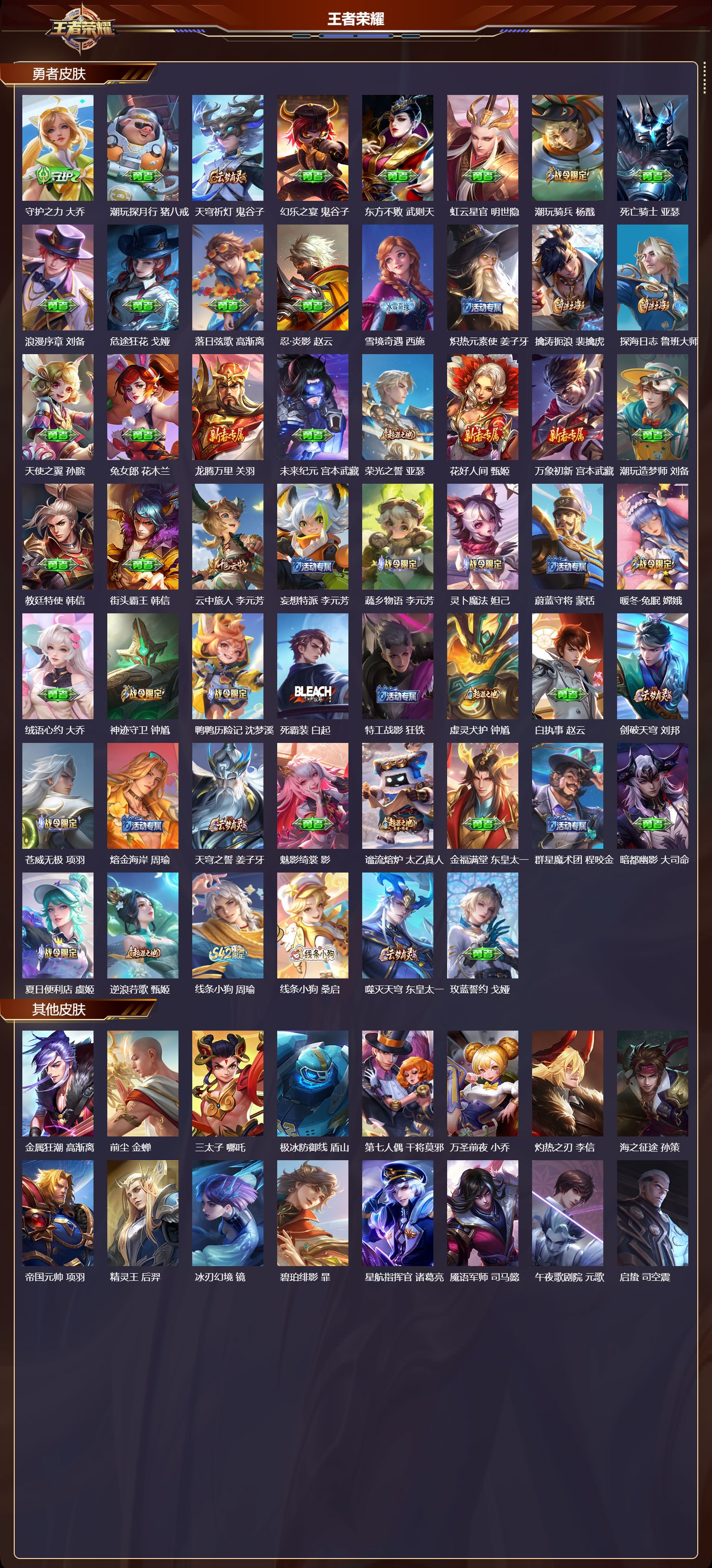 【76,勇者皮肤】,玲珑珍味,西施,爱心护理,阿轲,太极少年,赵怀真,大漠名商,沈梦溪,缤纷绘卷,张良,乐园追猎者,白起,丁香结,小乔,幻夜卜梦,芈月,海盐诗旅,桑启,朔望之晖,女娲,白色死神,白起,黄金武士,典韦,阴阳师,狄仁杰,次元突破,哪吒,古海寻踪,张良,鲨炮海盗猫,沈梦溪,鲤鱼之梦,庄周,海滩派对,项羽,完美运算,后羿,踏浪烽翎,莱西奥,猎兽之王,吕布,野性能量,吕布,守护之力,大乔,潮玩探月行,猪八戒,天穹祈灯,鬼谷子,幻乐之宴,鬼谷子,东方不败,武则天,虹云星官,明世隐,潮玩骑兵,杨戬,死亡骑士,亚瑟,浪漫序章,刘备,危途狂花,戈娅,落日弦歌,高渐离,忍·炎影,赵云,雪境奇遇,西施,炽热元素使,姜子牙,擒涛扼浪,裴擒虎,探海日志,鲁班大师,天使之翼,孙膑,兔女郎,花木兰,龙腾万里,关羽,未来纪元,宫本武藏,荣光之誓,亚瑟,花好人间,甄姬,万象初新,宫本武藏,潮玩造梦师,刘备,教廷特使,韩信,街头霸王,韩信,云中旅人,李元芳,妄想特派,李元芳,蔬乡物语,李元芳,灵卜魔法,妲己,蔚蓝守将,蒙恬,暖冬·兔眠,嫦娥,绒语心约,大乔,神迹守卫,钟馗,鸭鸭历险记,沈梦溪,死霸装,白起,特工战影,狂铁,虚灵犬护,钟馗,白执事,赵云,剑破天穹,刘邦,苍威无极,项羽,熔金海岸,周瑜,天穹之誓,姜子牙,魅影绮裳,影,谧流熔炉,太乙真人,金福满堂,东皇太一,群星魔术团,程咬金,暗都幽影,大司命,夏日便利店,虞姬,逆浪荇歌,甄姬,线条小狗,周瑜,线条小狗,桑启,噬灭天穹,东皇太一,玫蓝誓约,戈娅,